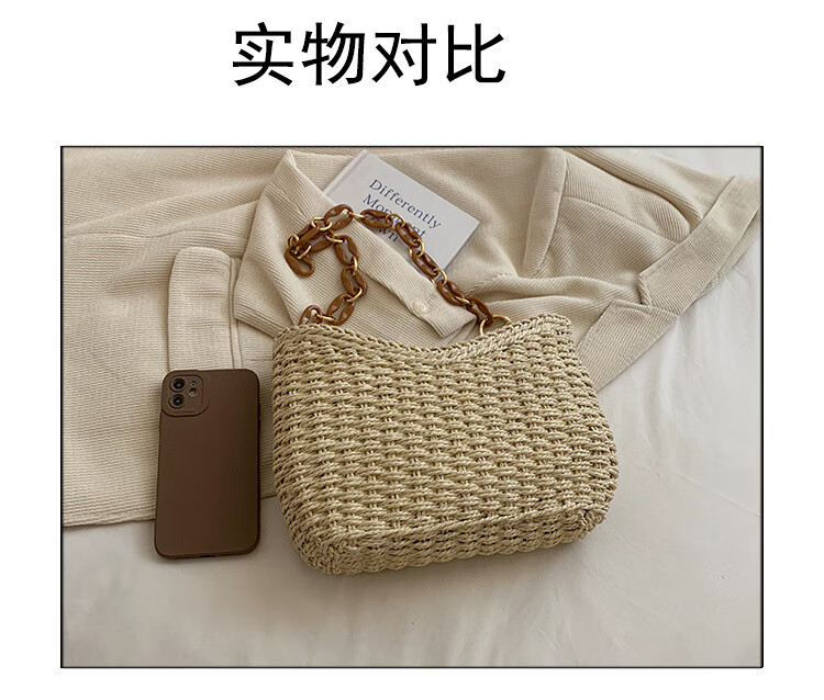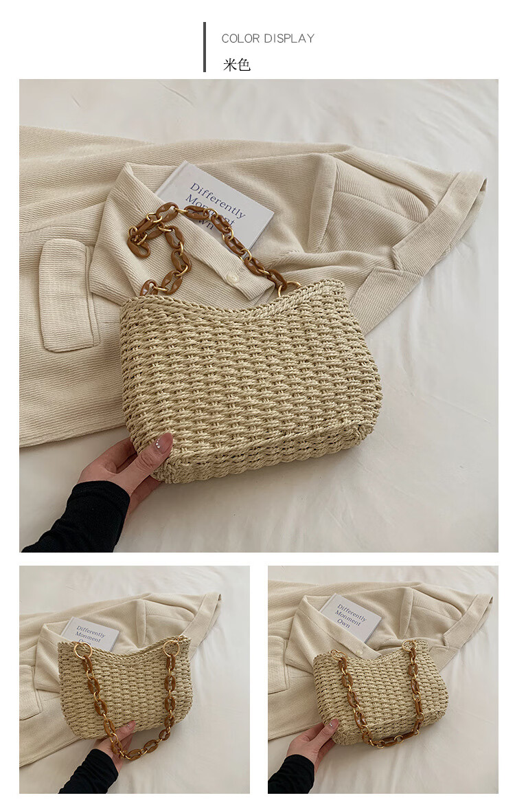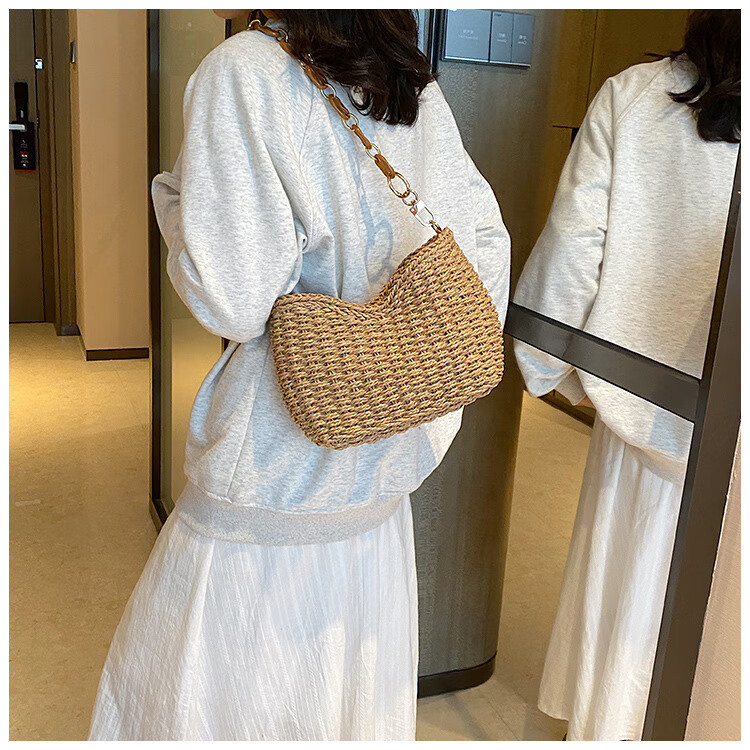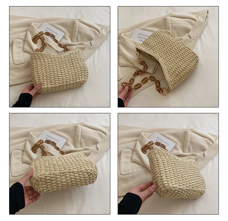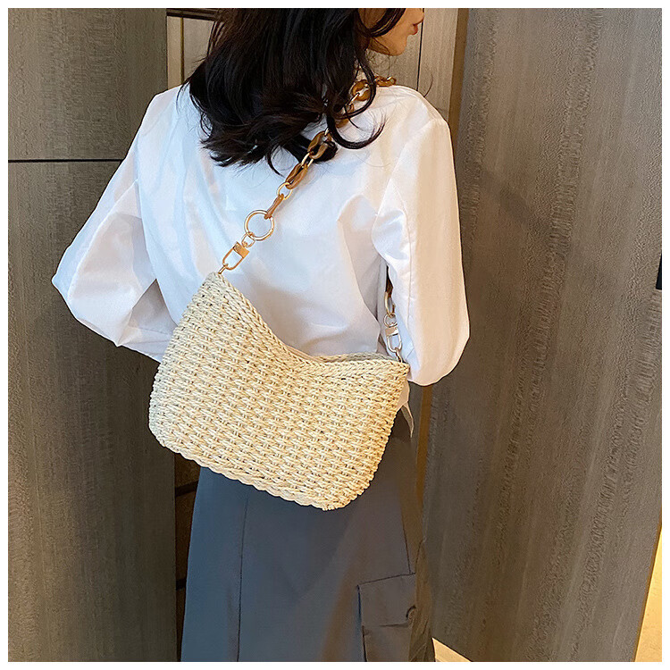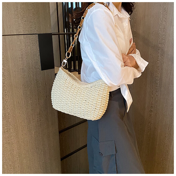 夏季手工编织腋下链条休闲女包纯色小众清新手挎包简约大容量草编 米白色