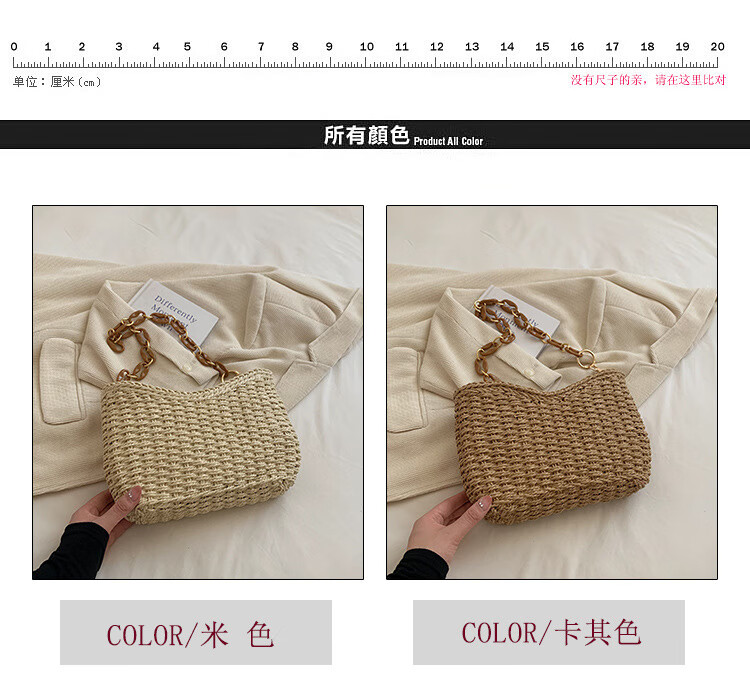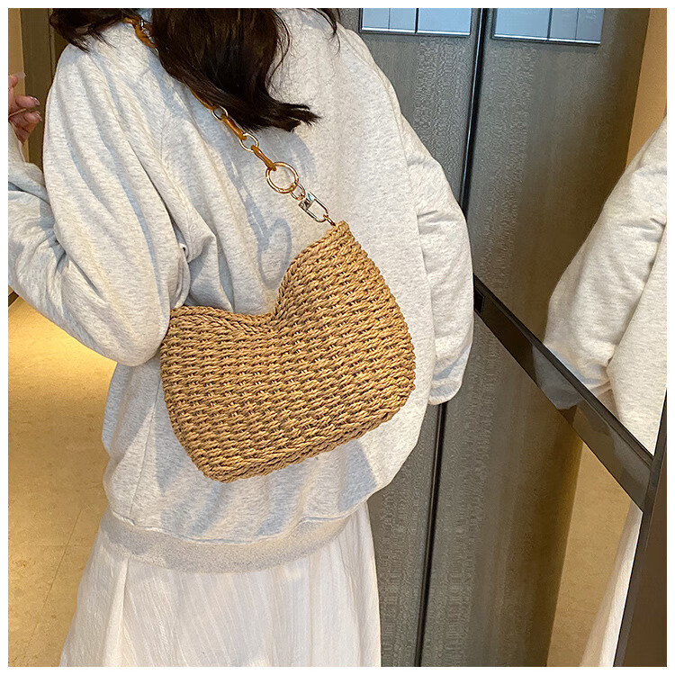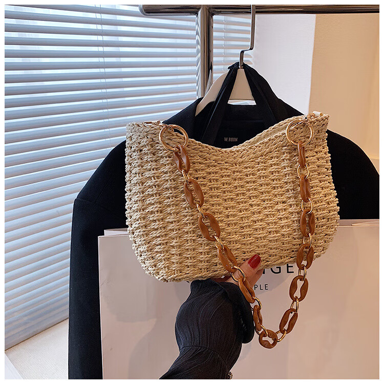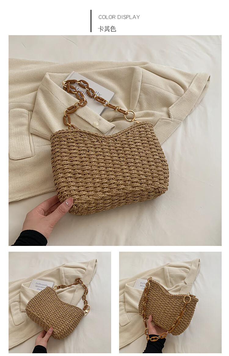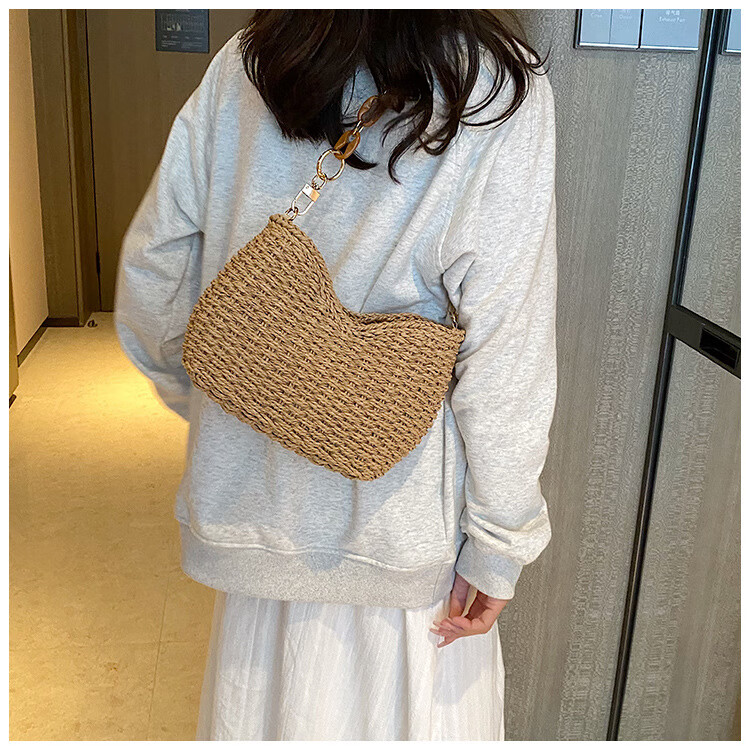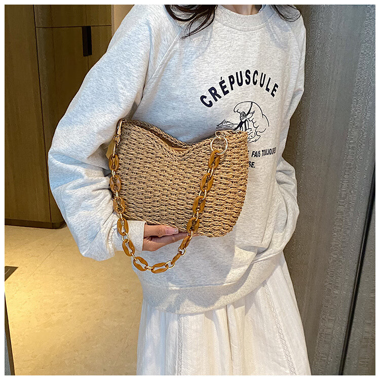 夏季手工编织腋下链条休闲女包纯色小众清新手挎包简约大容量草编 米白色
