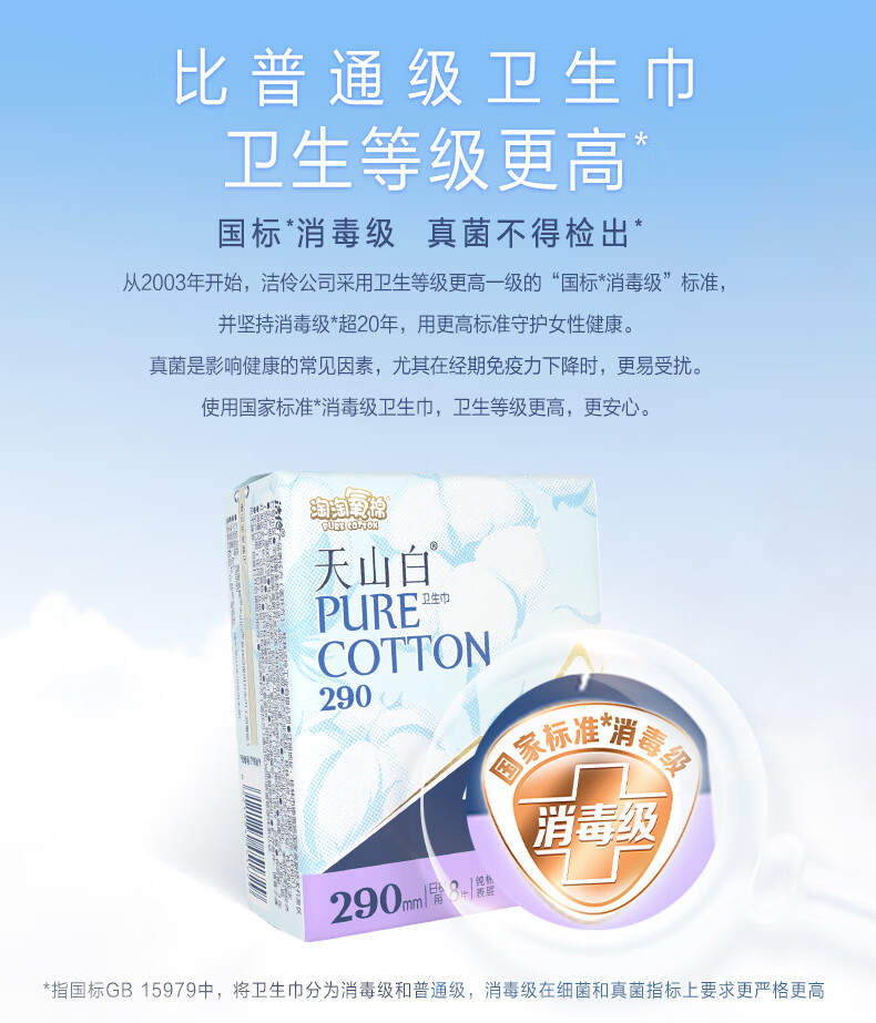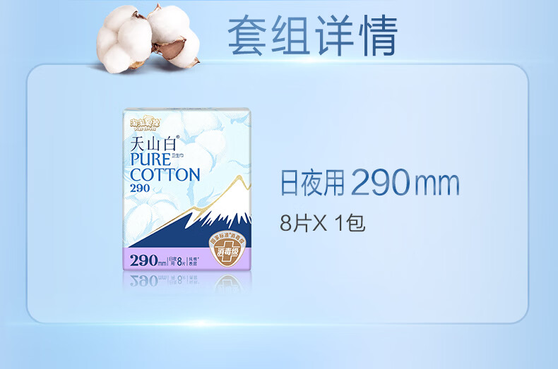 淘淘氧棉天山白纯棉消毒级日夜用卫生巾290mm*8片 京东自营