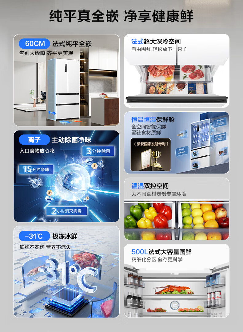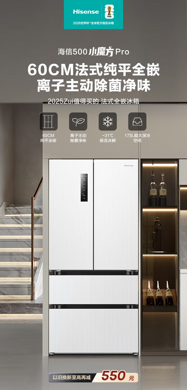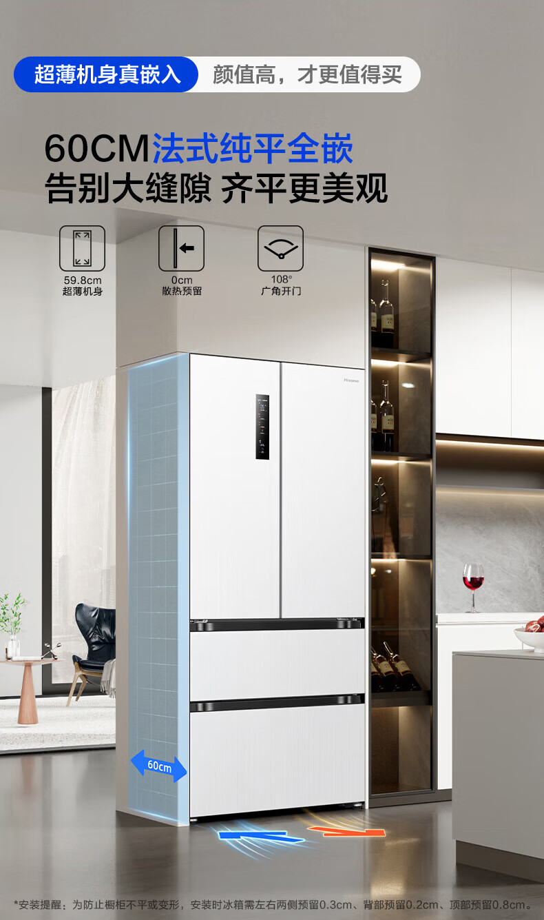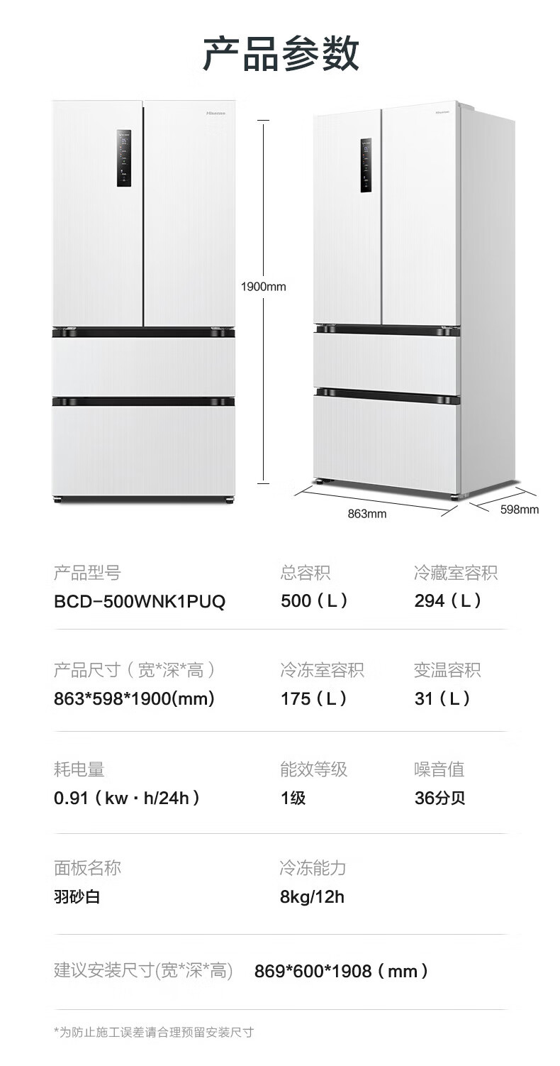 海信(Hisense)500小魔方Pro超薄零嵌入式冰箱法式一级能效风冷无霜家电国家补贴20%以旧换新BCD-500WNK1PUQ 白色