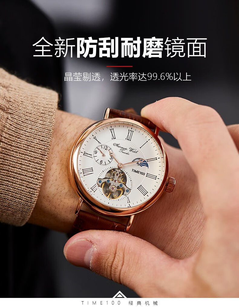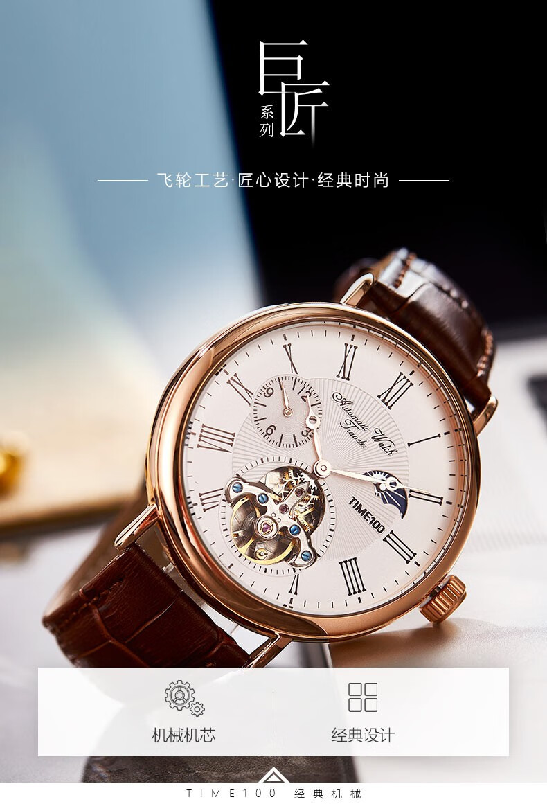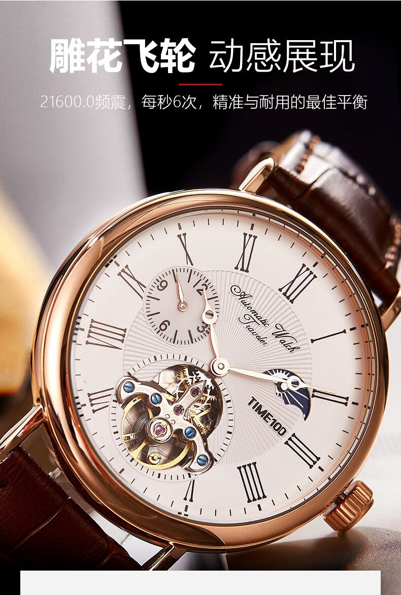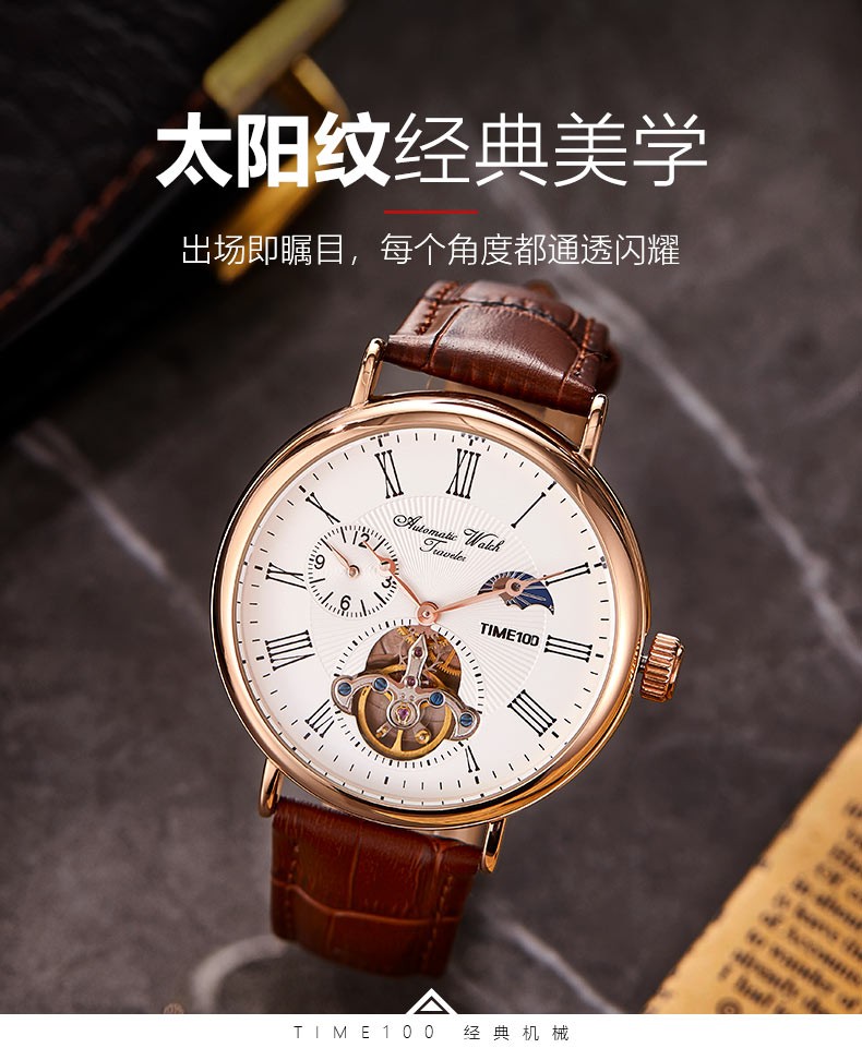 时光一百(TIME100)手表机械表飞轮全自动多功能月相牛皮休闲男表送男友情人节礼物 玫白