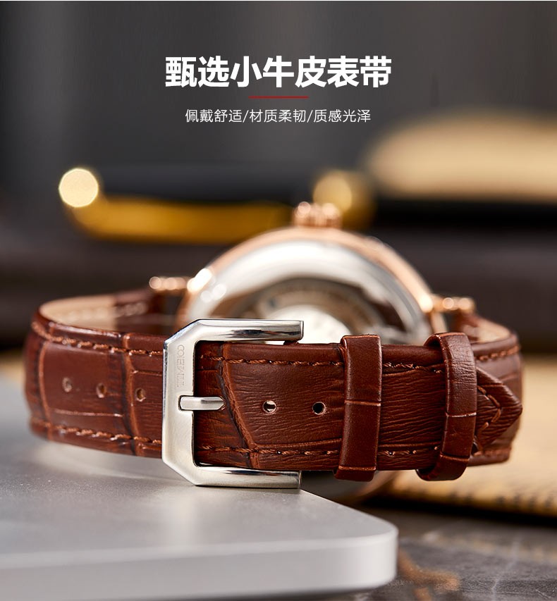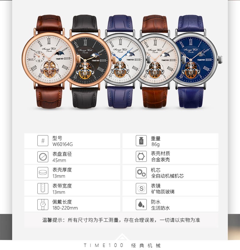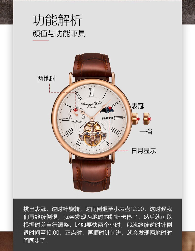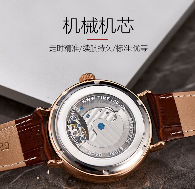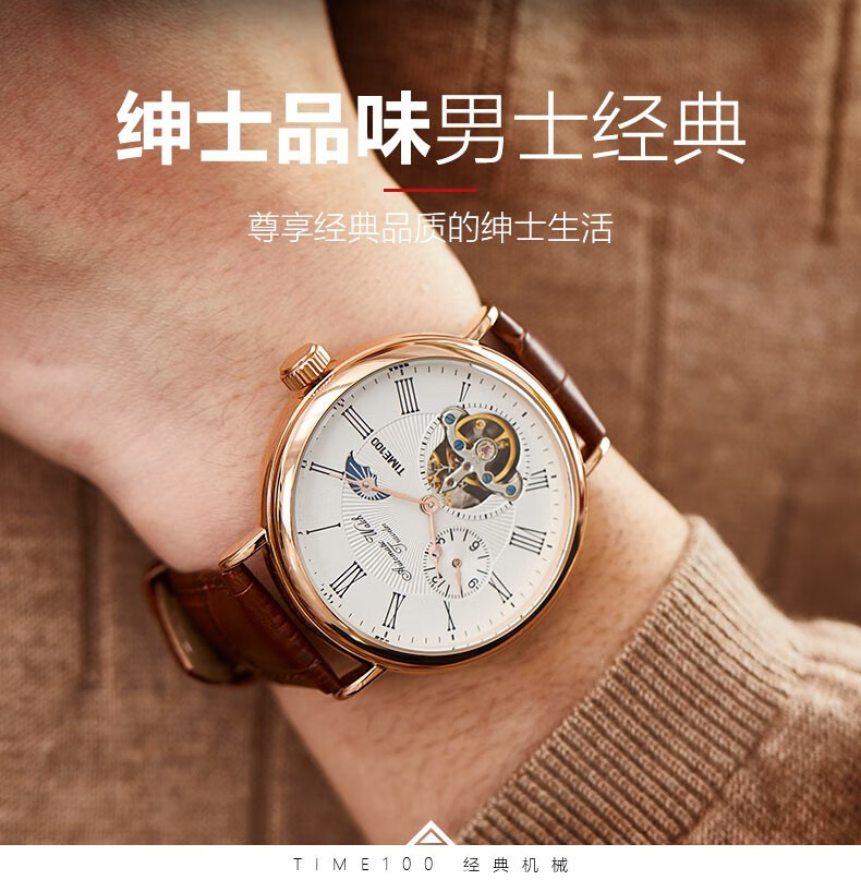 时光一百(TIME100)手表机械表飞轮全自动多功能月相牛皮休闲男表送男友情人节礼物 玫白
