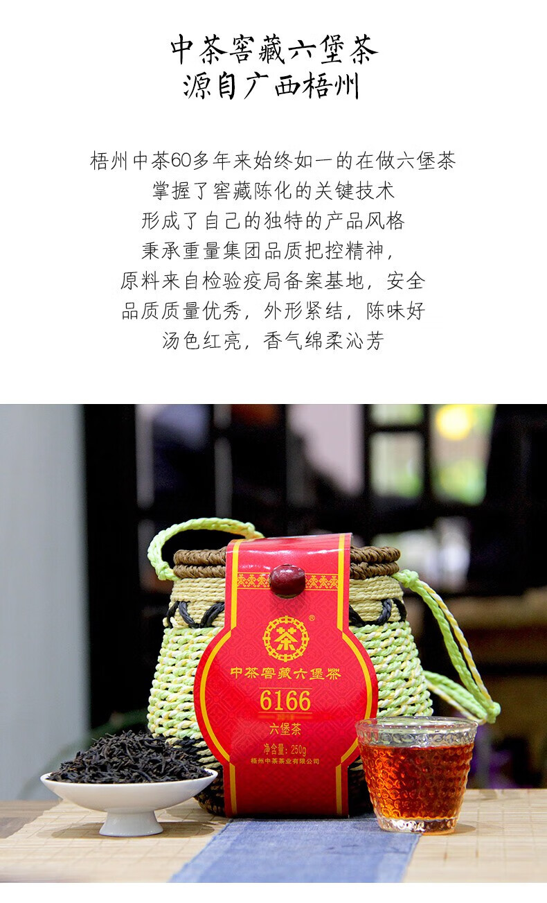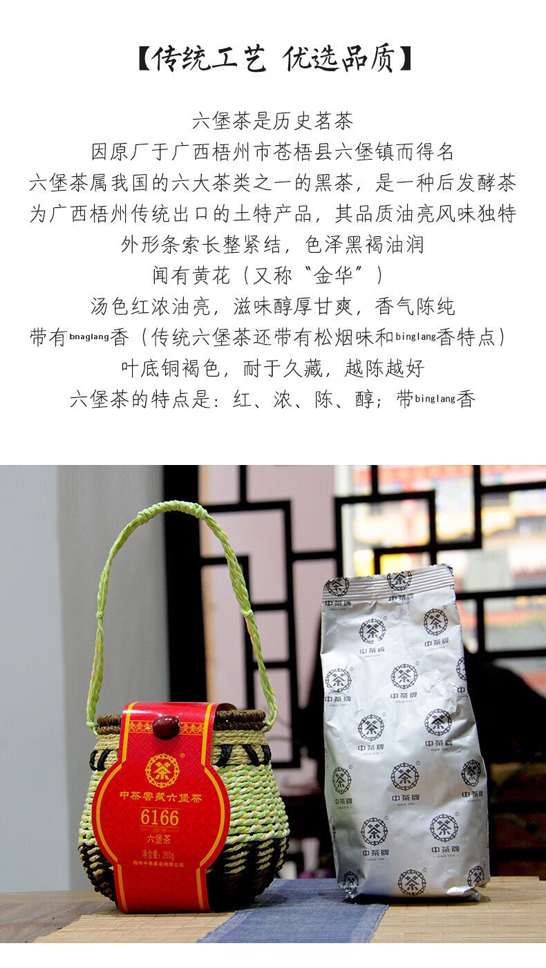 中茶牌茶叶 广西梧州六堡茶 6166珍品箩筐装 2021年陈化一级窖藏黑茶 2023年 单篓装 250克 * 1篓