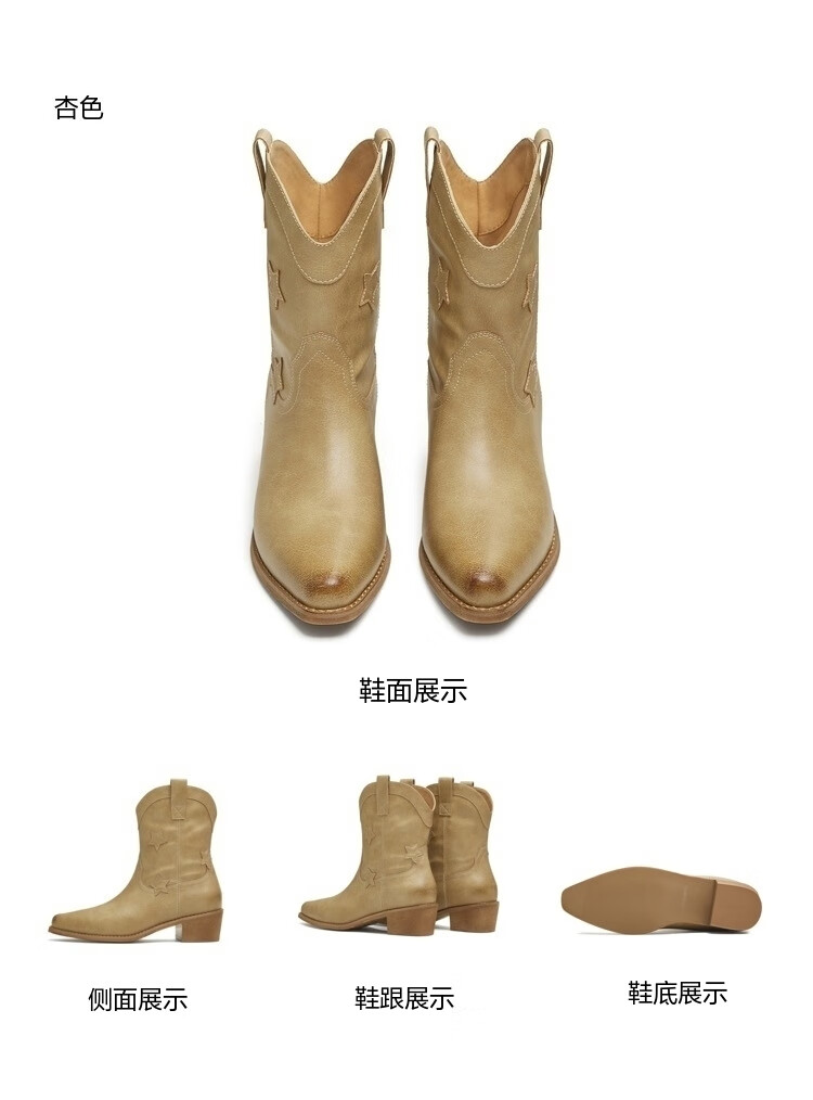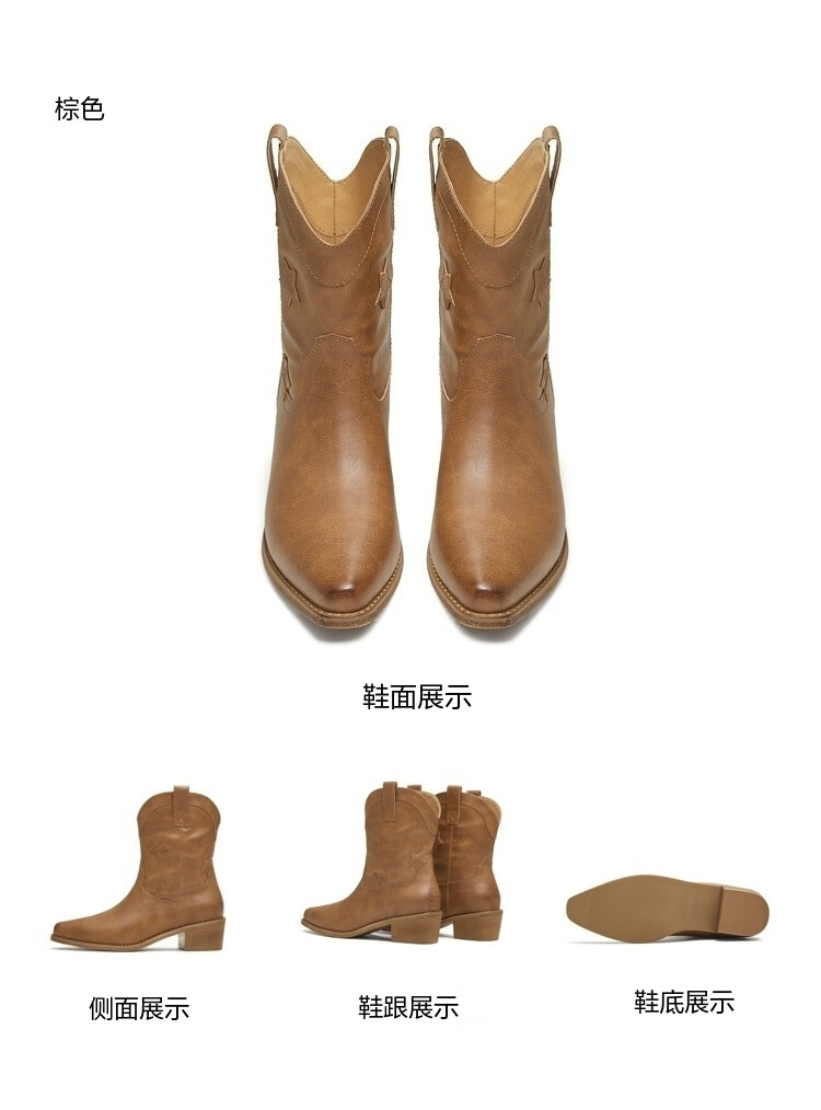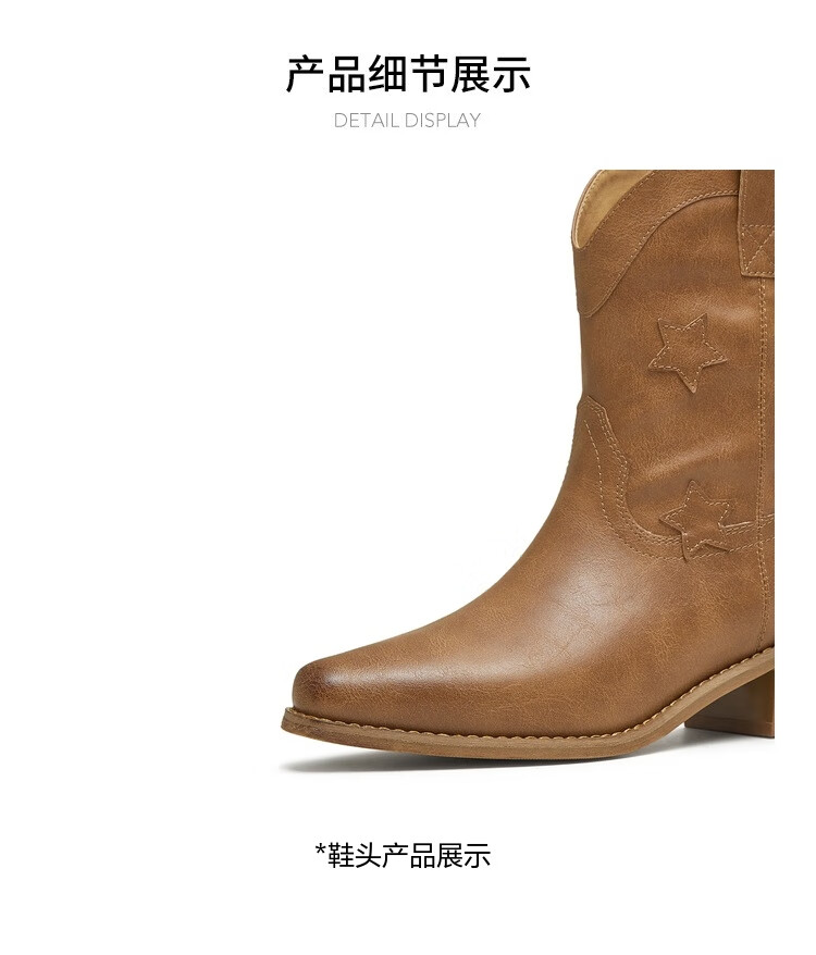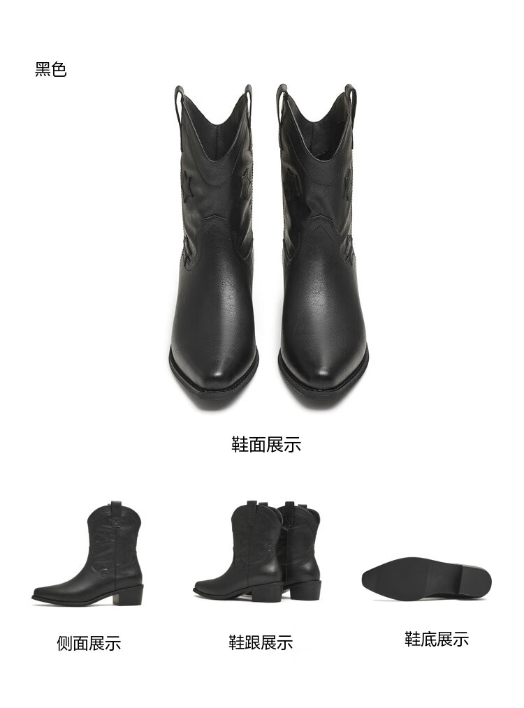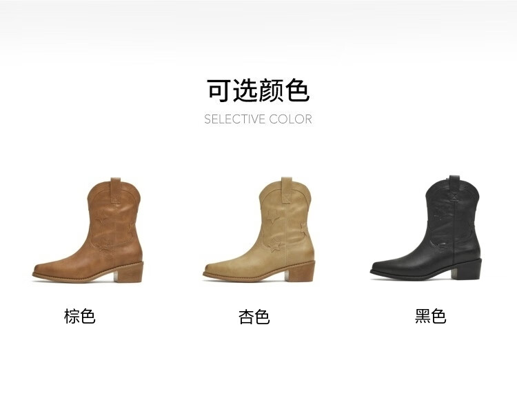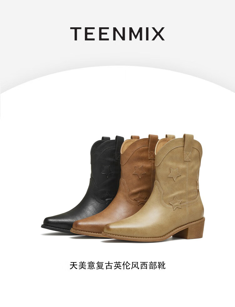 天美意西部靴方跟V口显瘦女靴子复古英伦风时尚女短靴2025新款 高靴-黑色 34