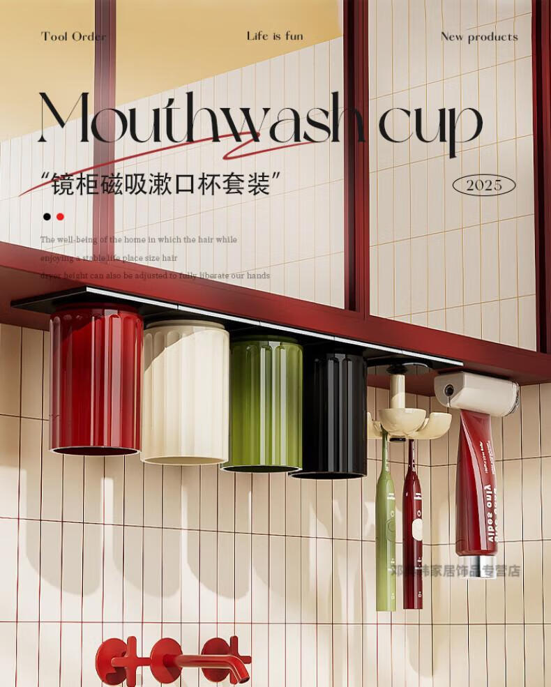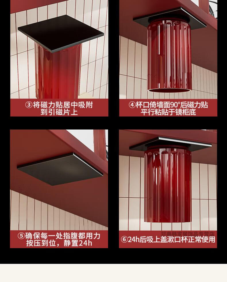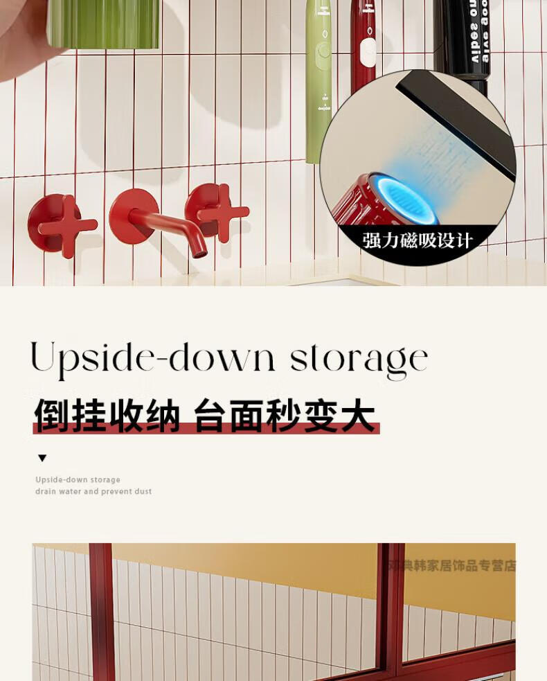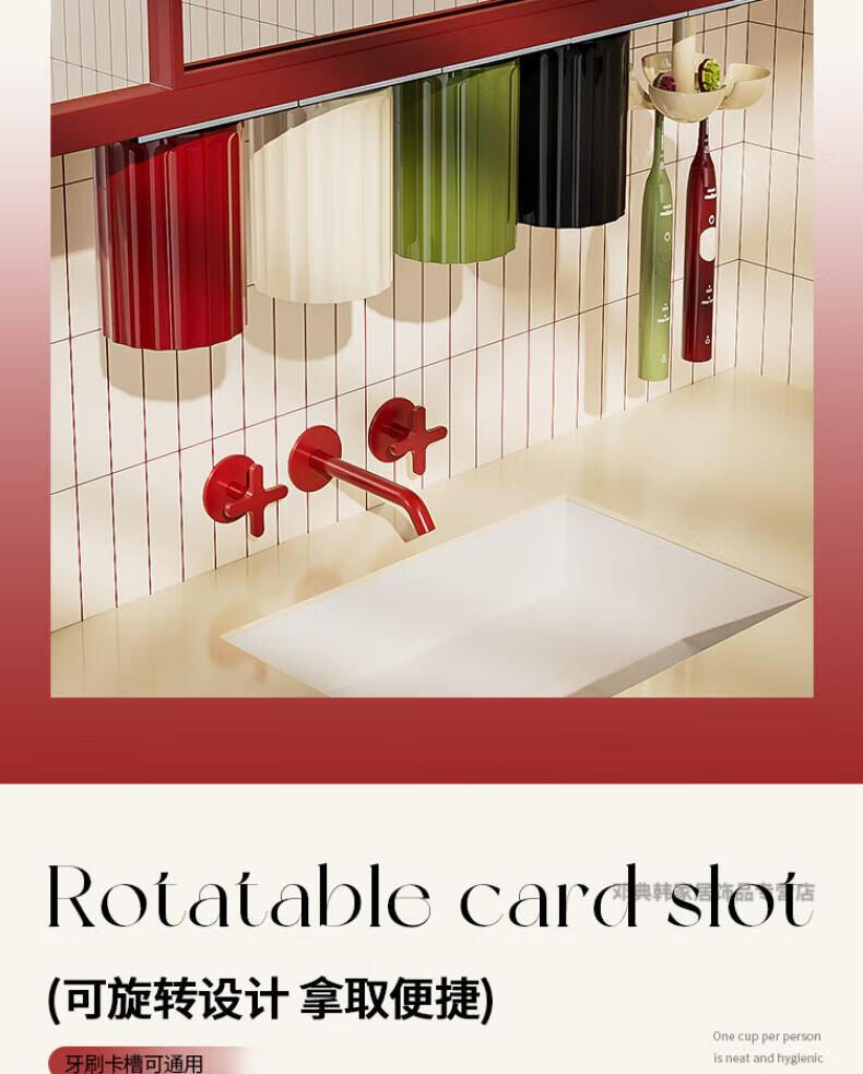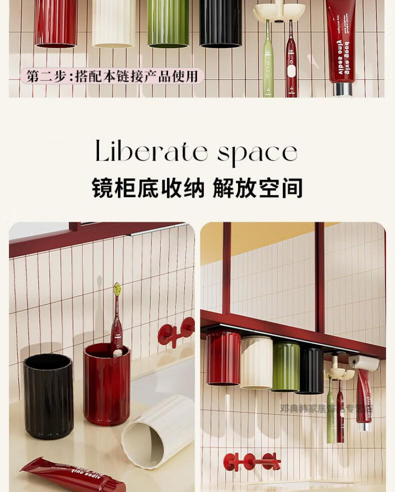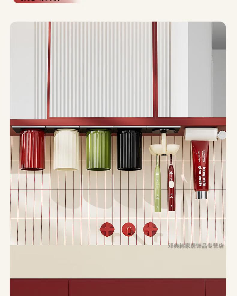 DEATKN德国镜柜磁吸漱口杯牙刷置物架一家四口倒挂电动牙刷牙杯收纳挂架 【双人套组】红绿杯+红牙刷架+3小号磁吸贴