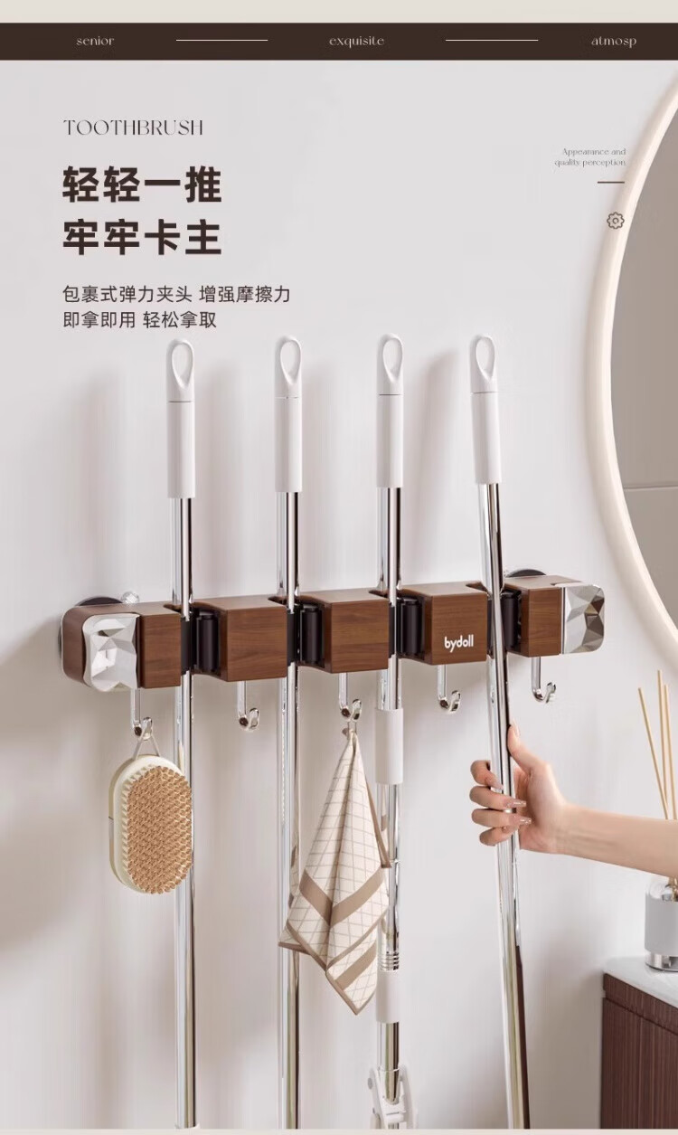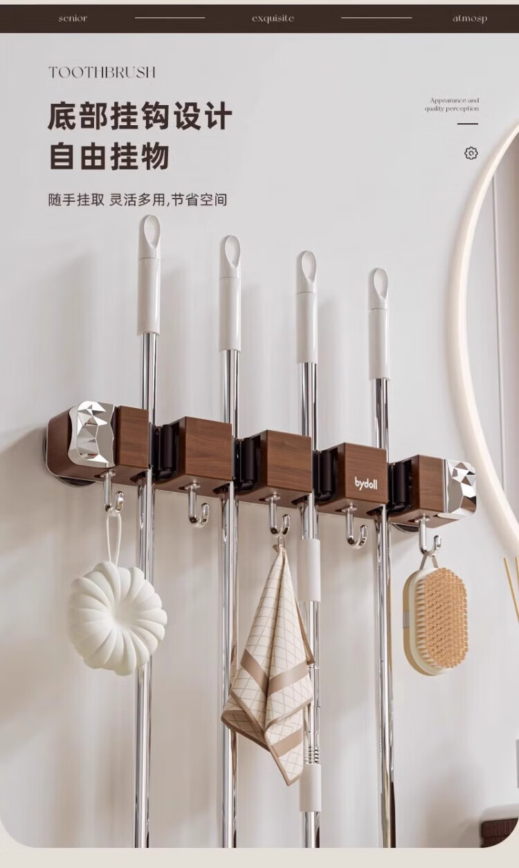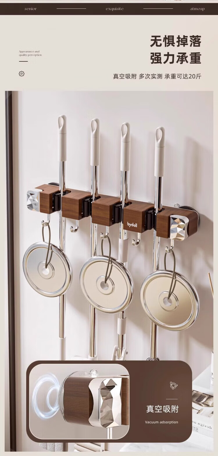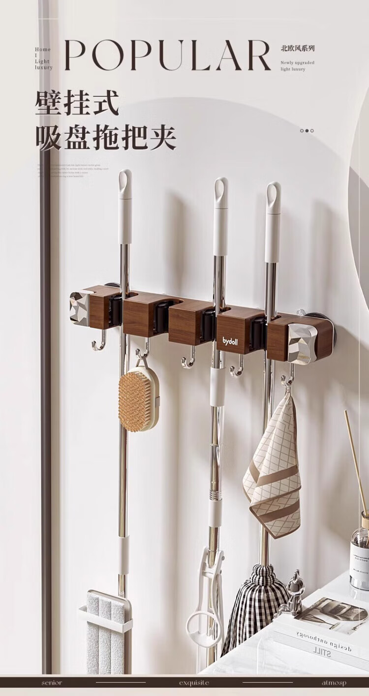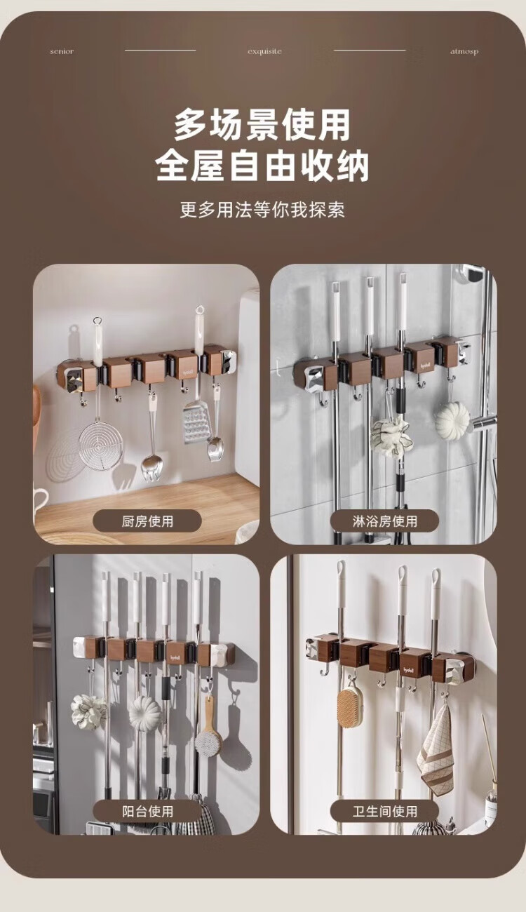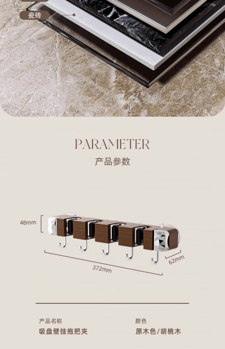 WCZ德国吸盘拖把夹木纹免打孔拖把架挂钩卫生间浴室拖把置物架扫把壁 复古典雅胡桃木纹4夹5钩大容量X1 1个
