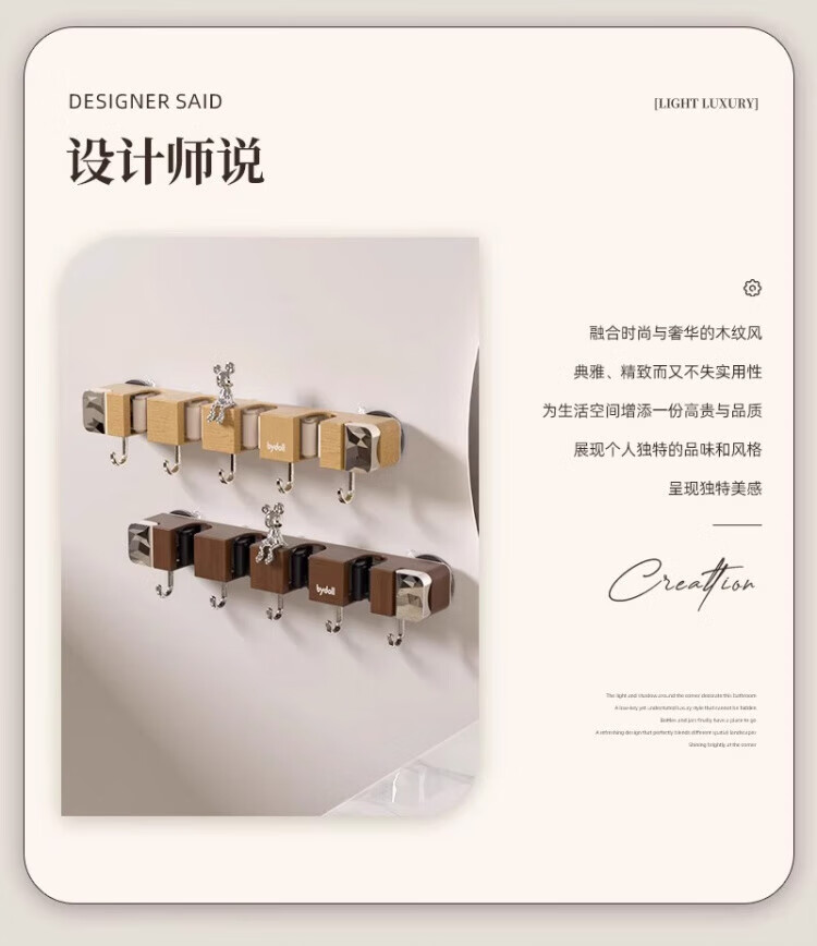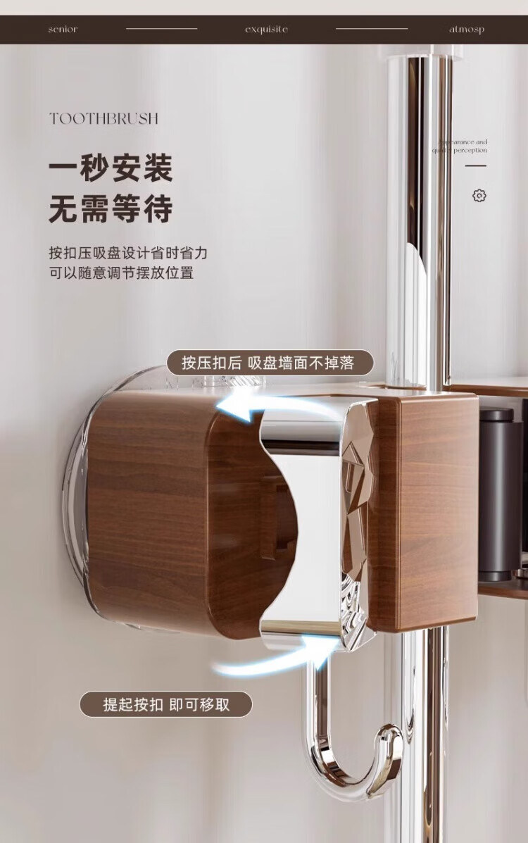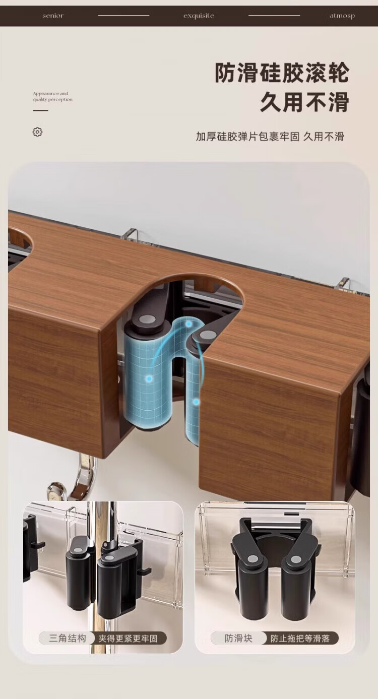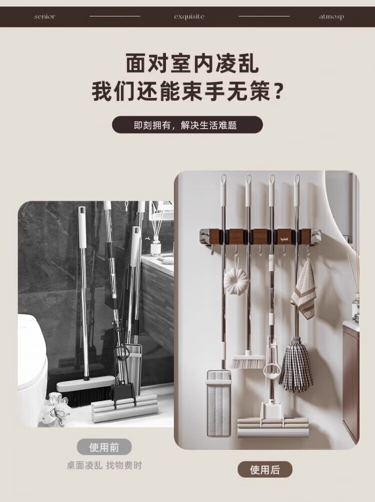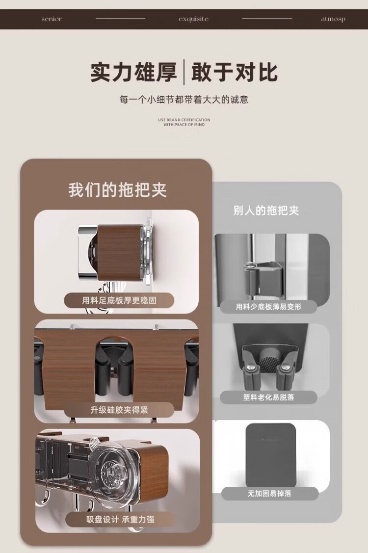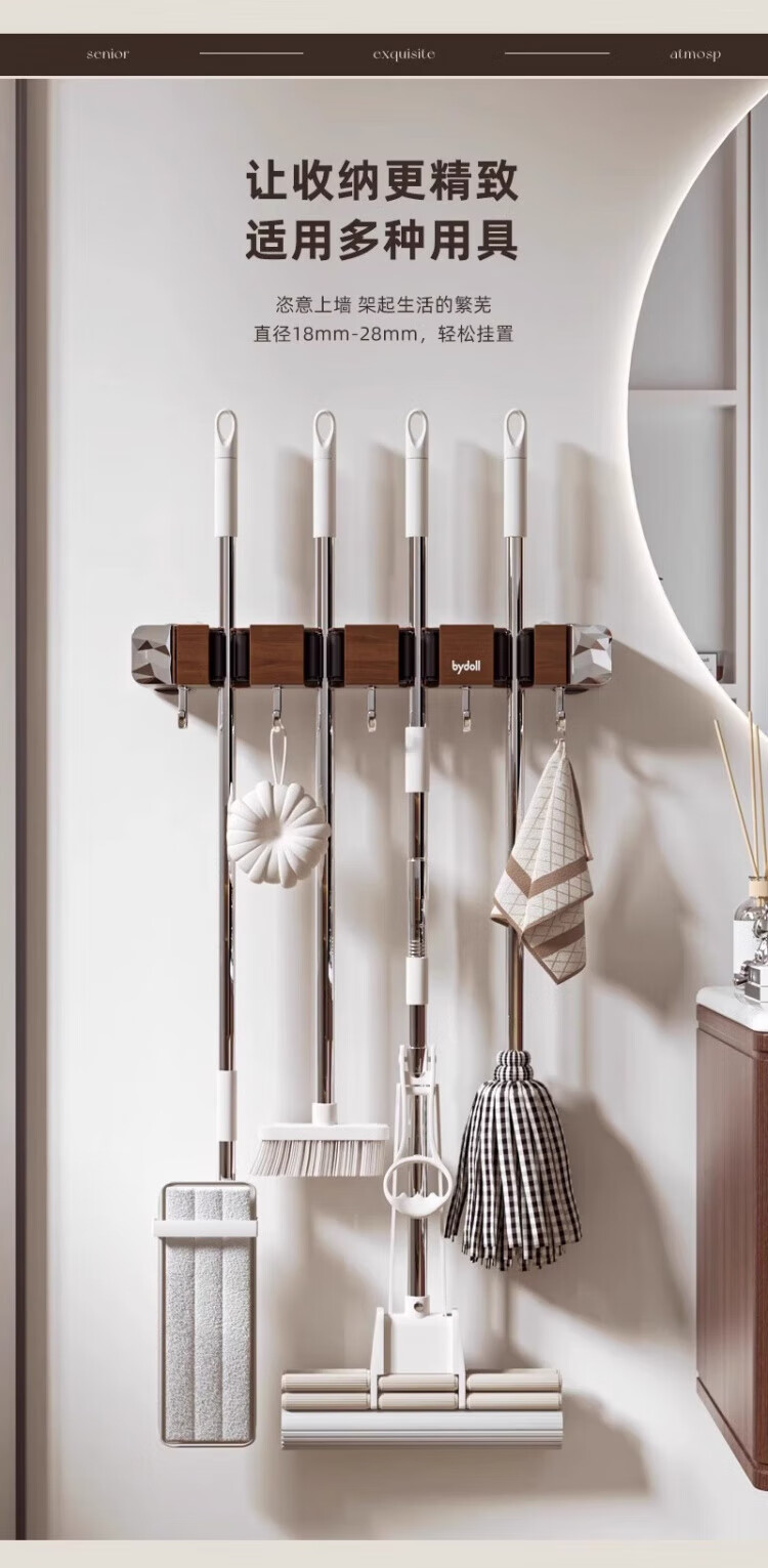 WCZ德国吸盘拖把夹木纹免打孔拖把架挂钩卫生间浴室拖把置物架扫把壁 复古典雅胡桃木纹4夹5钩大容量X1 1个