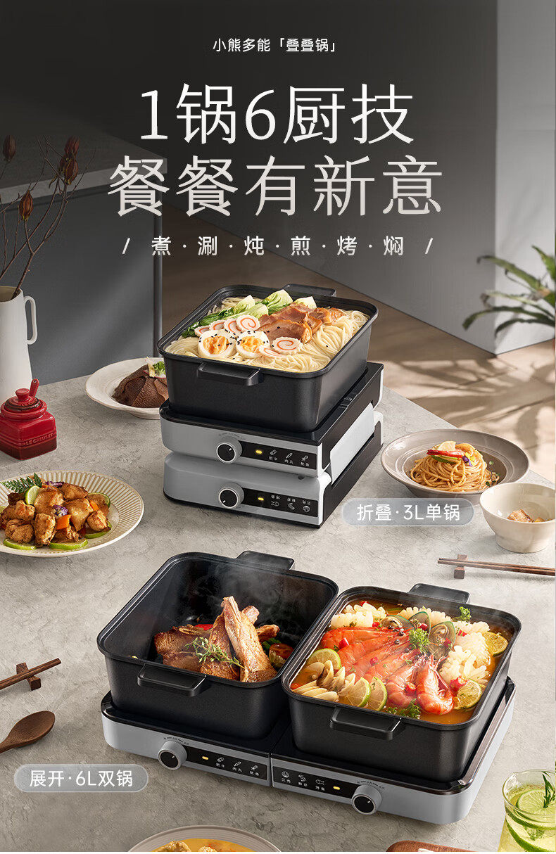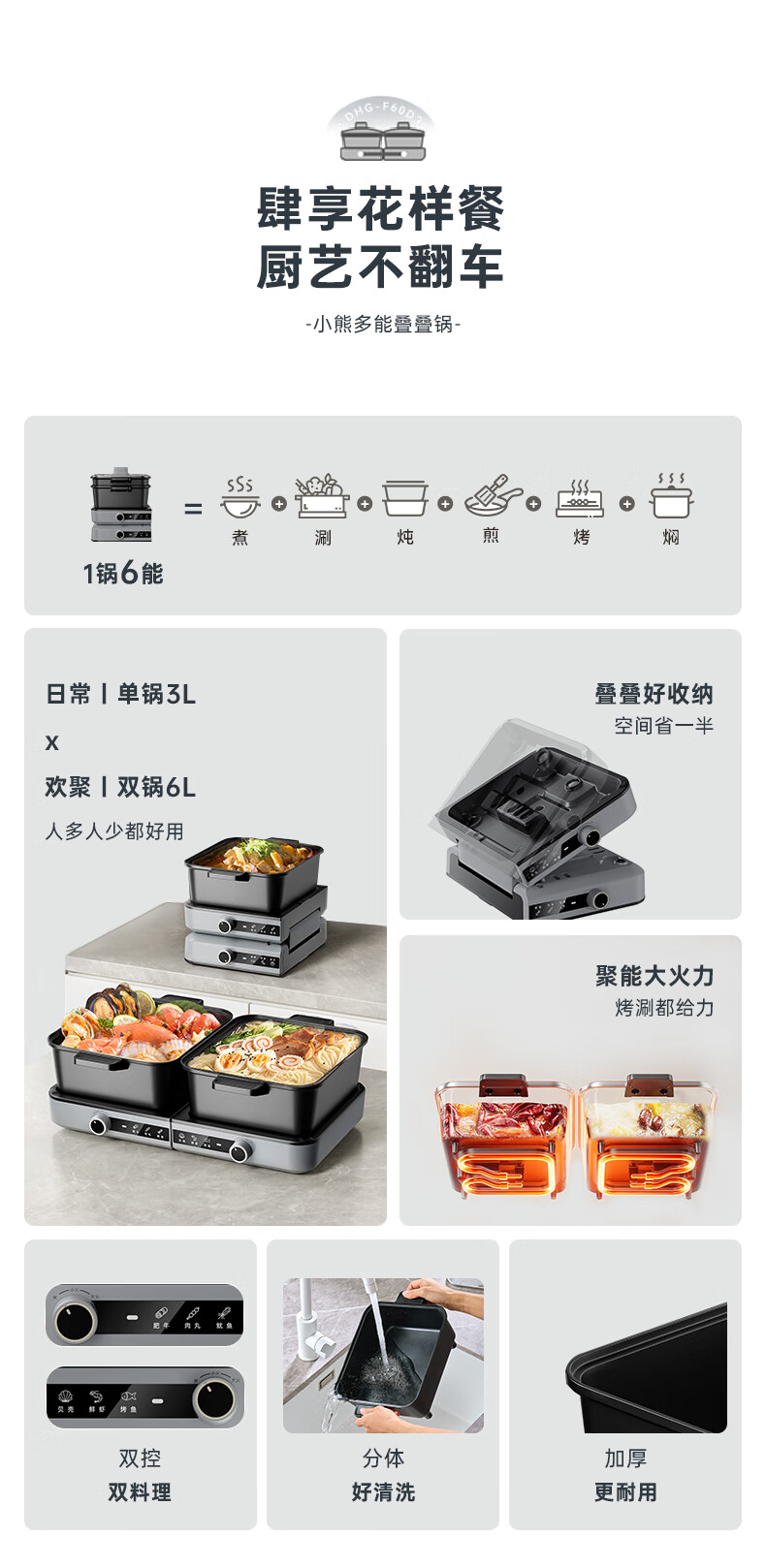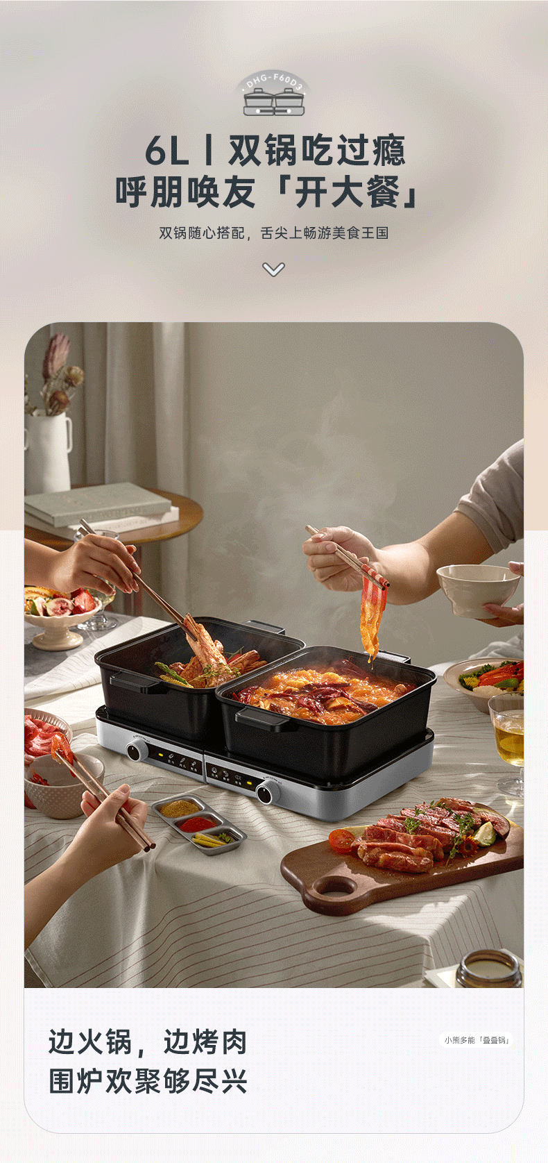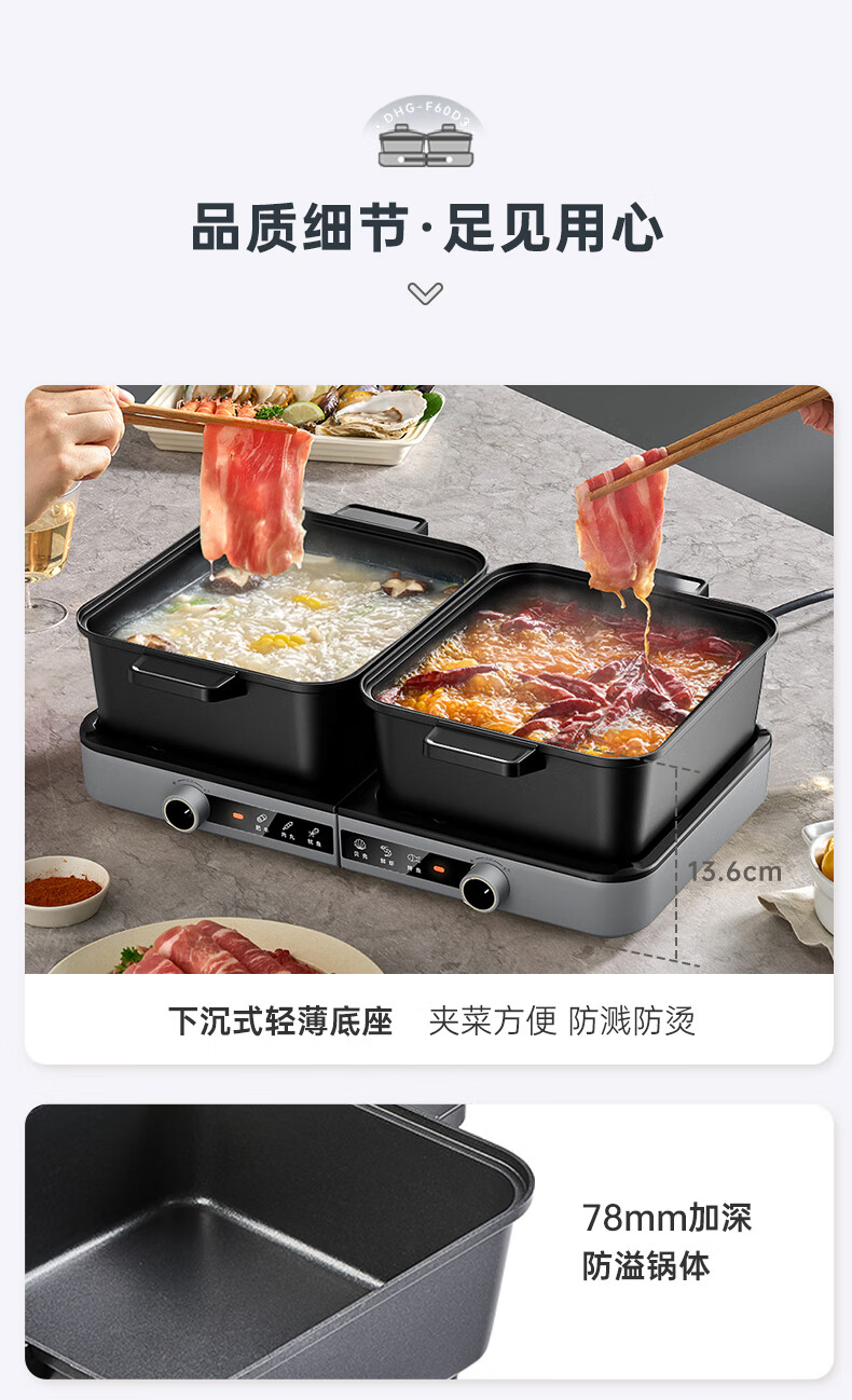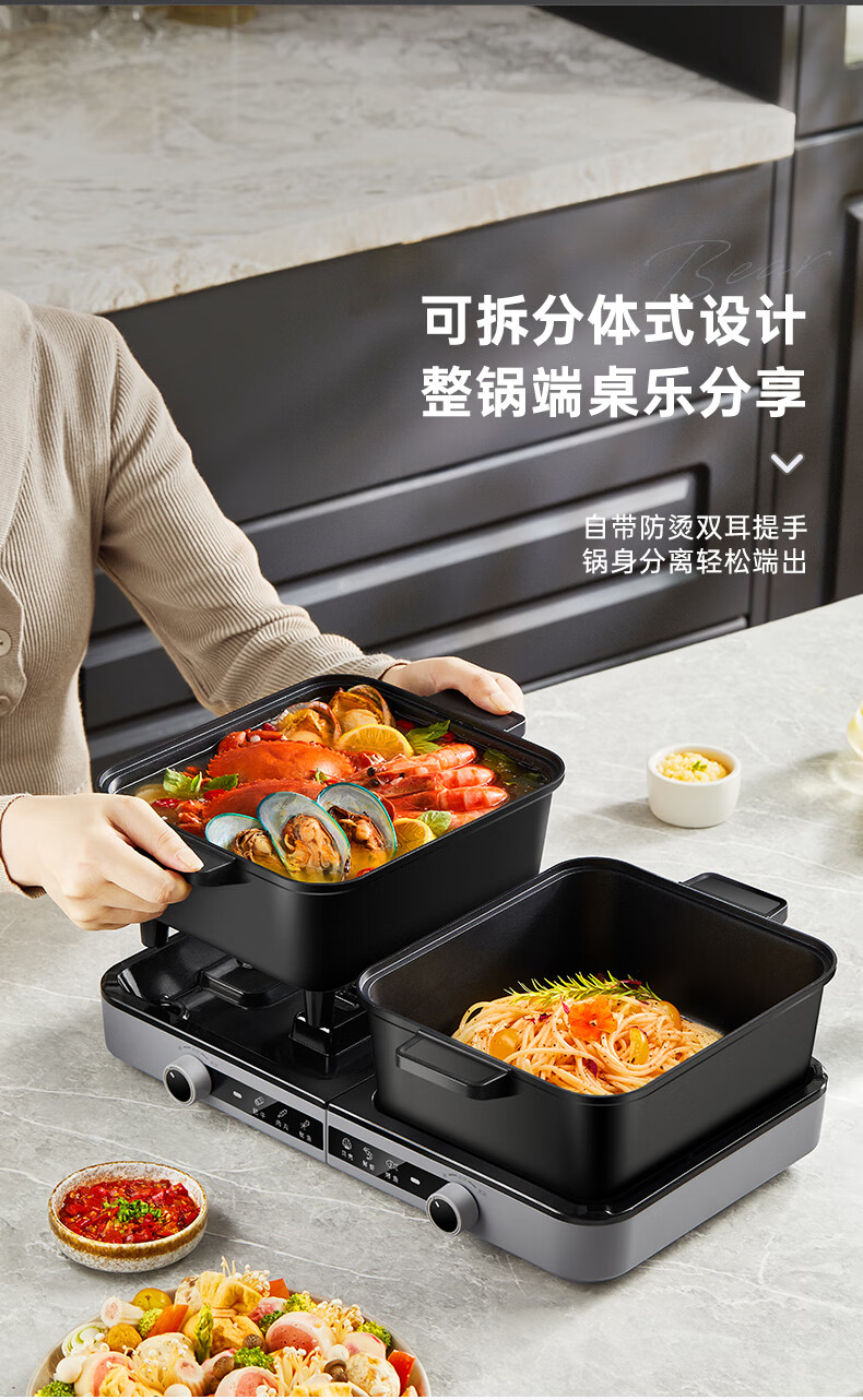 小熊(Bear)电火锅火锅专用锅分区控温鸳鸯锅家用分体多功能一锅多用电热锅独立双锅F60D3 6L叠叠锅1.0火锅版