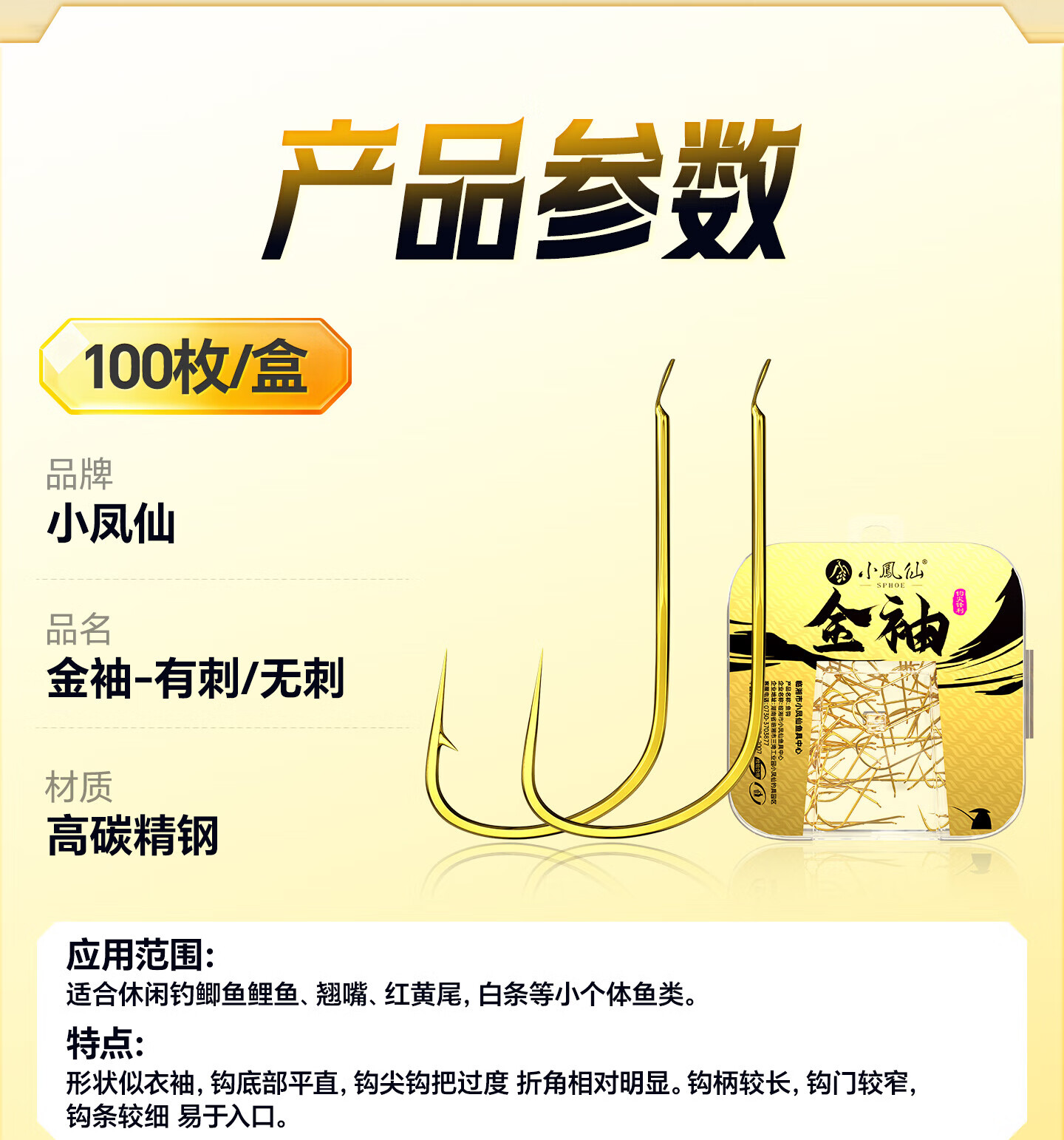 小凤仙100枚金袖鱼钩盒装正品官方野钓鲫鱼钩白条翘嘴有刺袖钩钓鱼钩 4# 金袖&有刺(100枚盒装)高碳精钢 散装鱼钩一盒