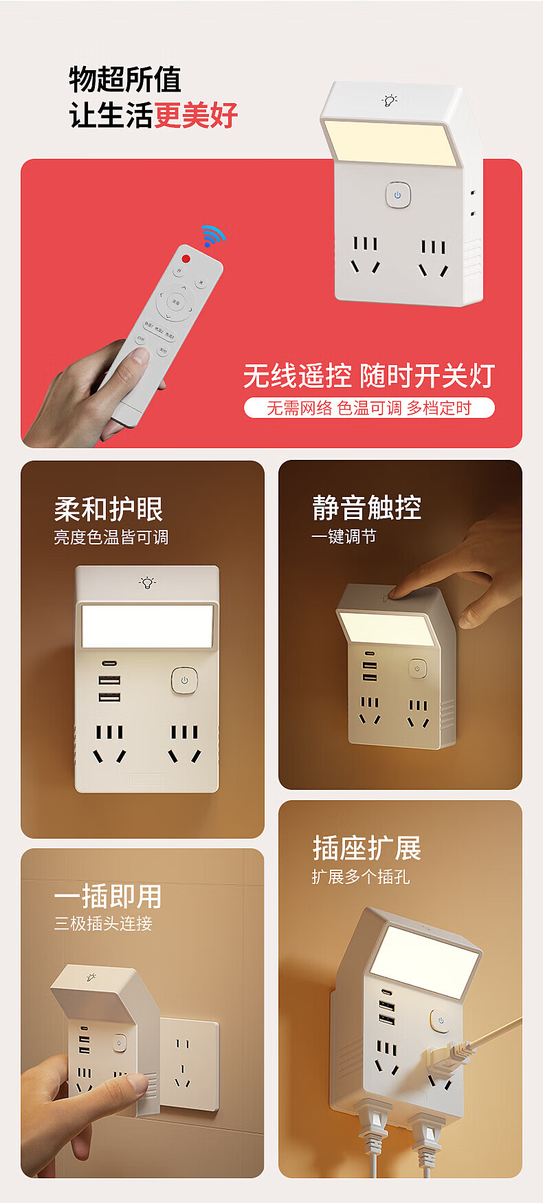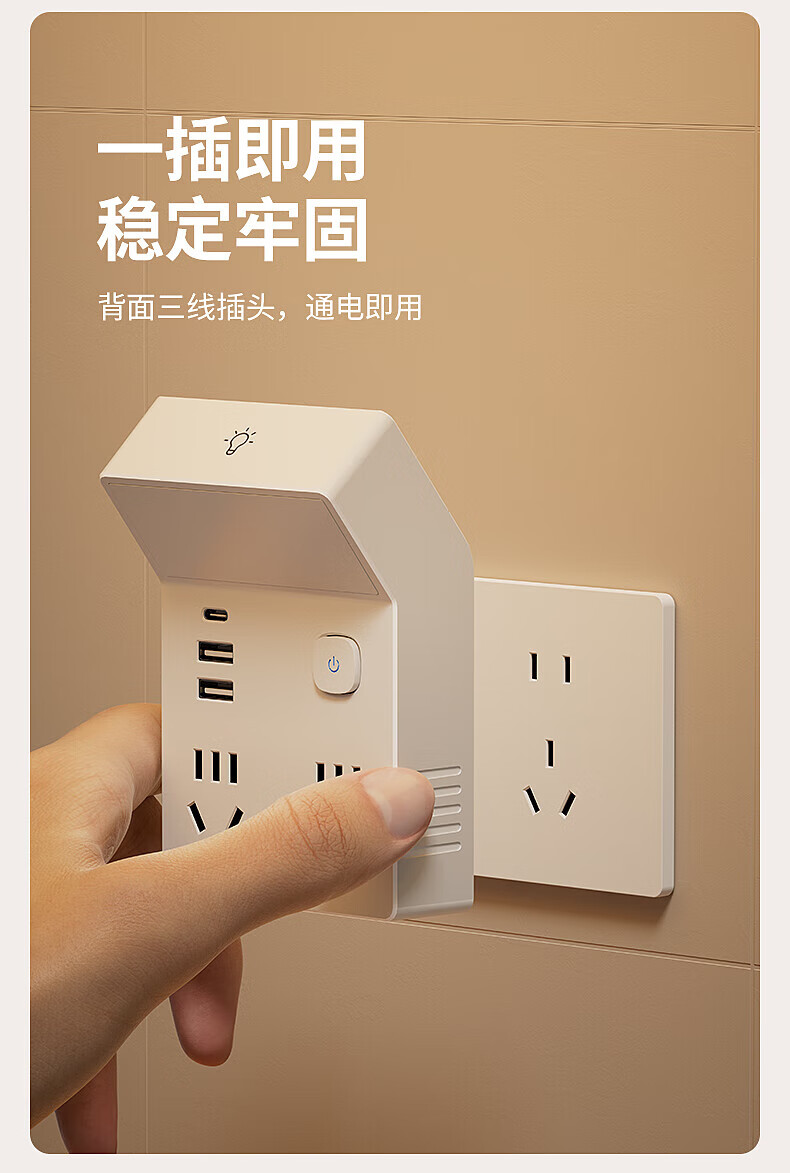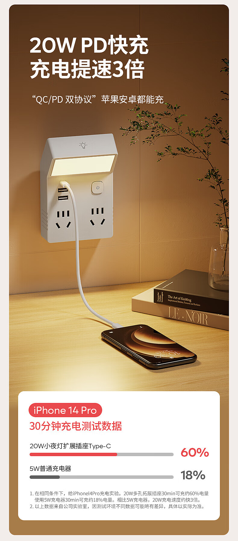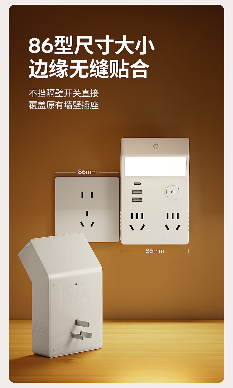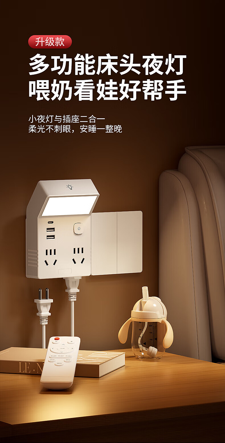 国际电工(FDD)直插式拓展插座一转四墙壁多功能无线转换插头床头86型扩展插座 黑色一转四带灯+USB/20W快充