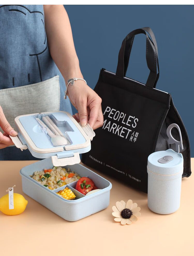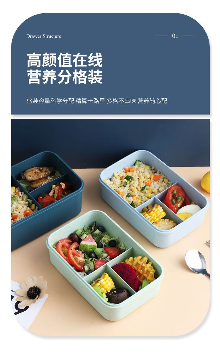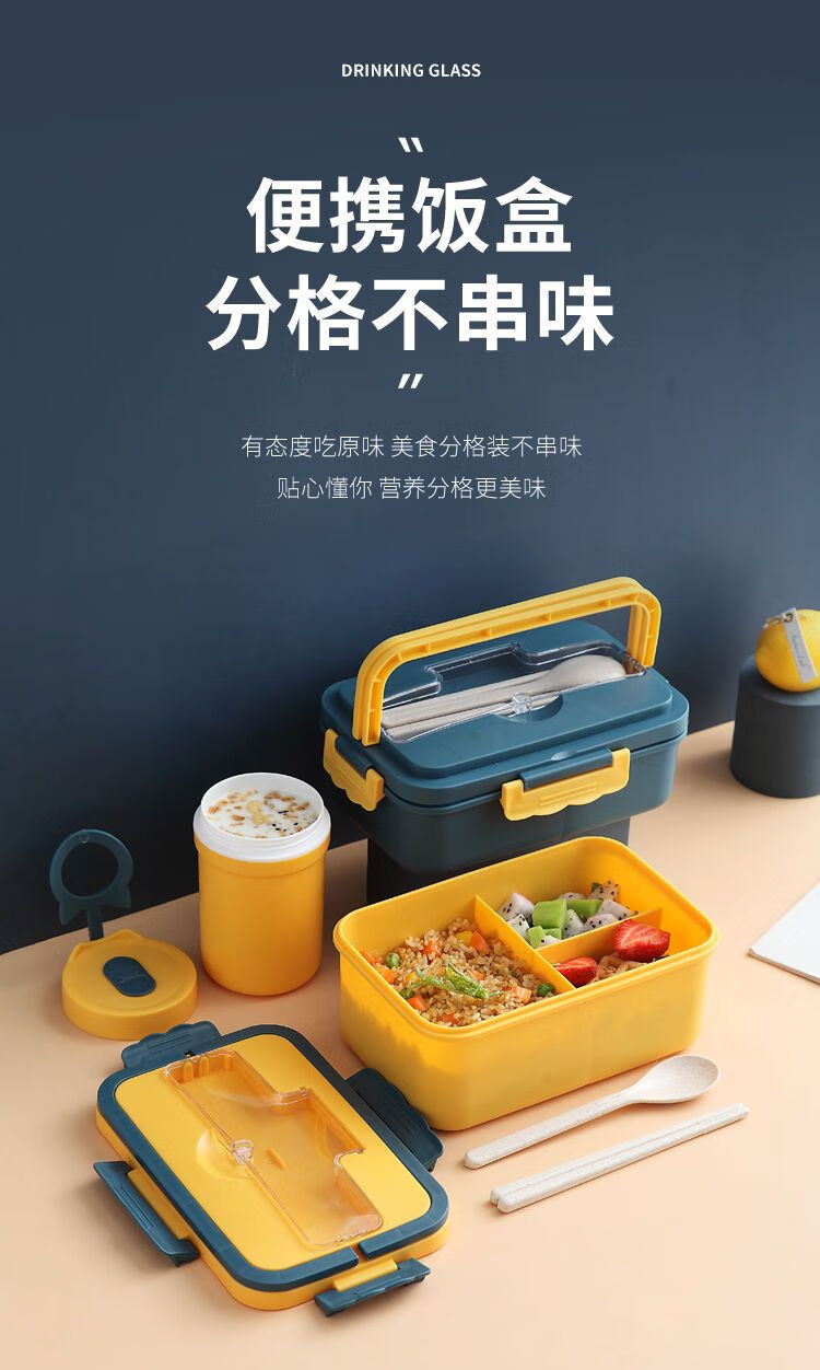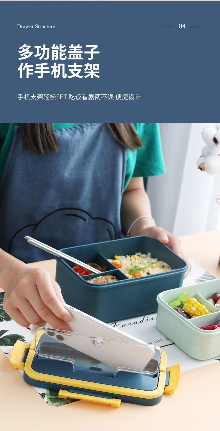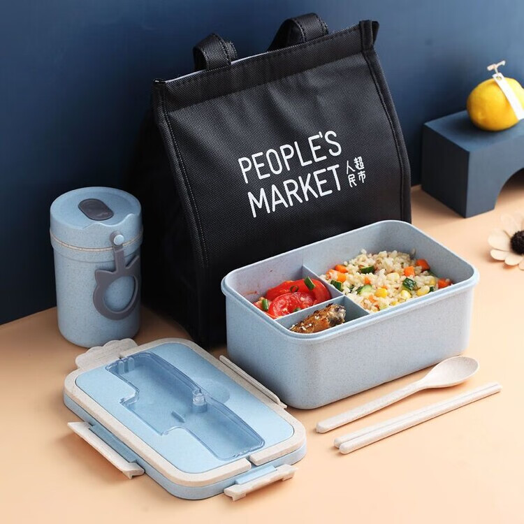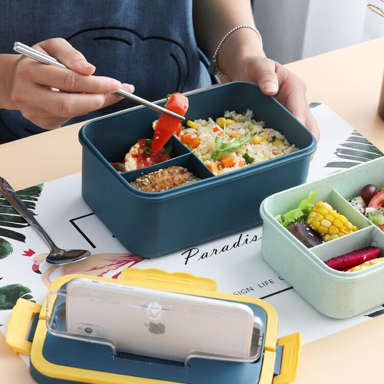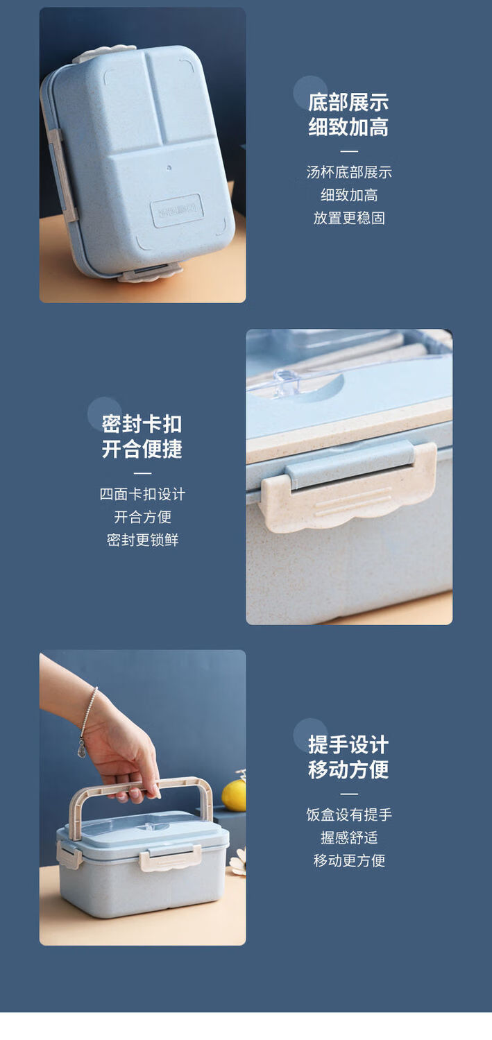 DEATKN德国小麦便携保温饭盒学生三格便当盒女手提大容量加热密封上班族 藏青蓝(三格1000ml) 贈(小麦)筷勺