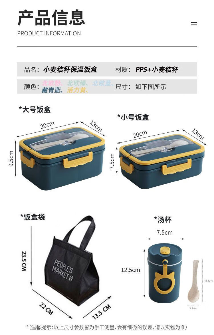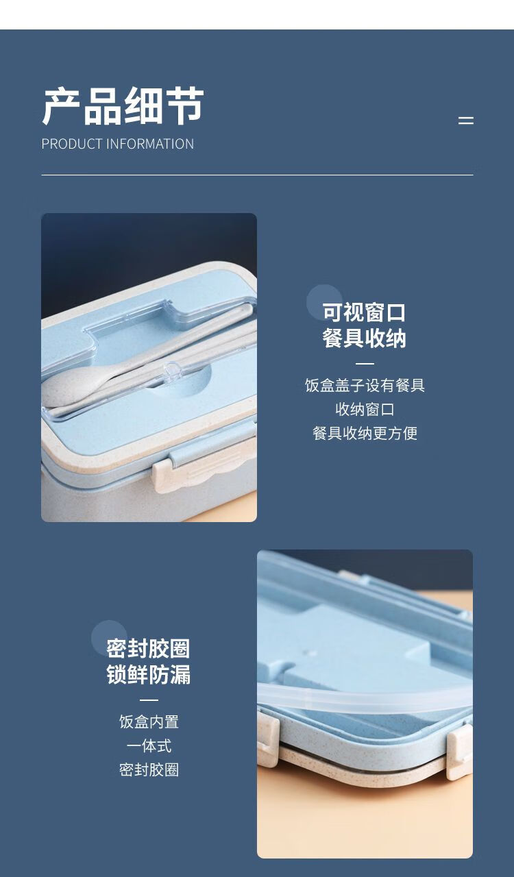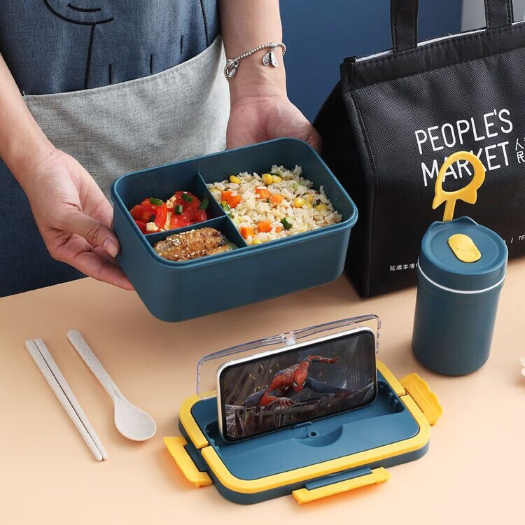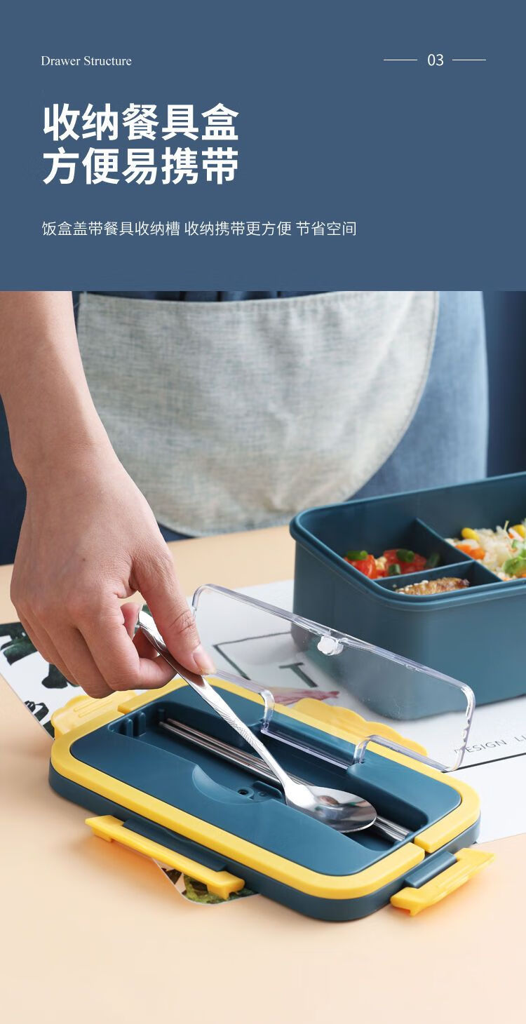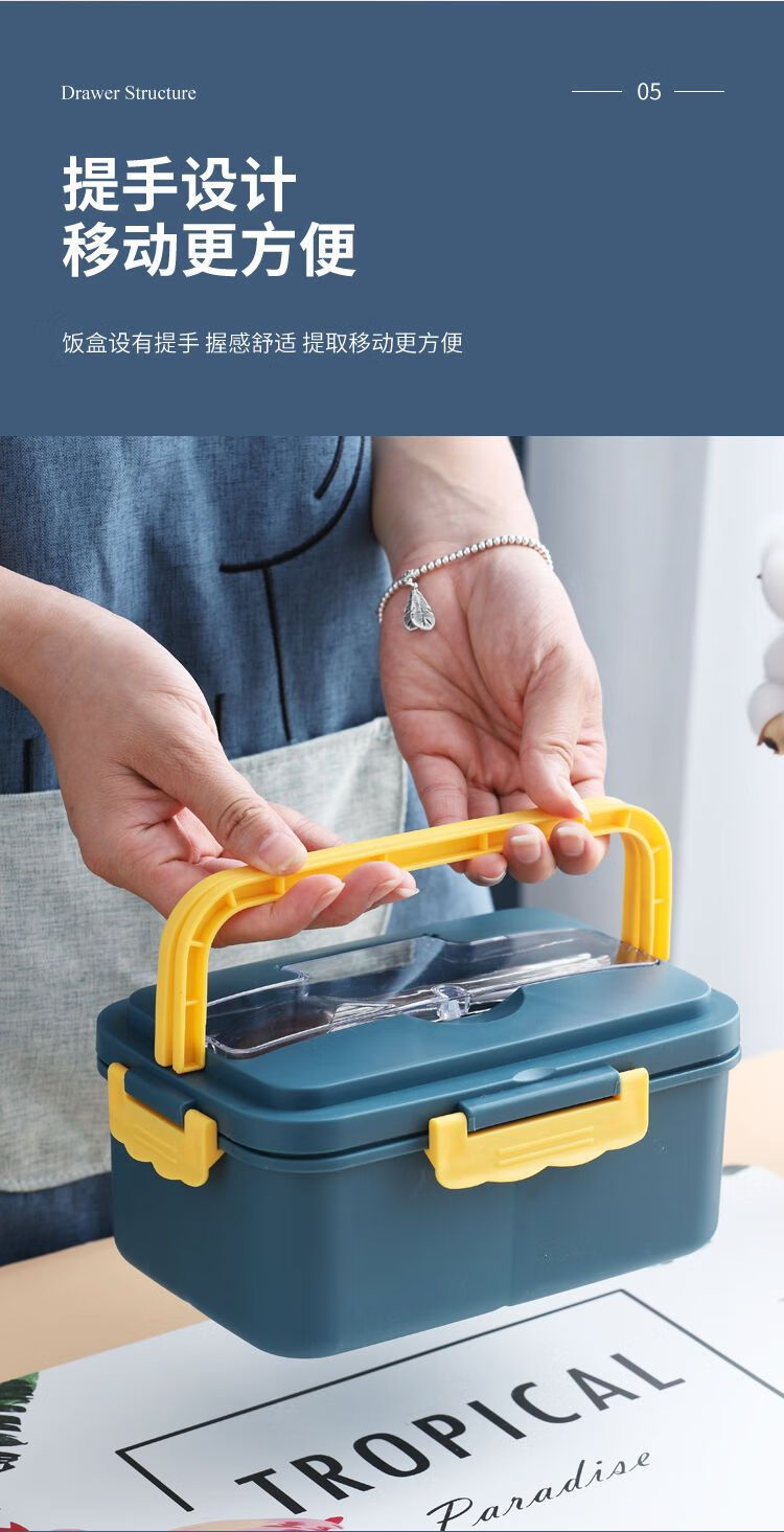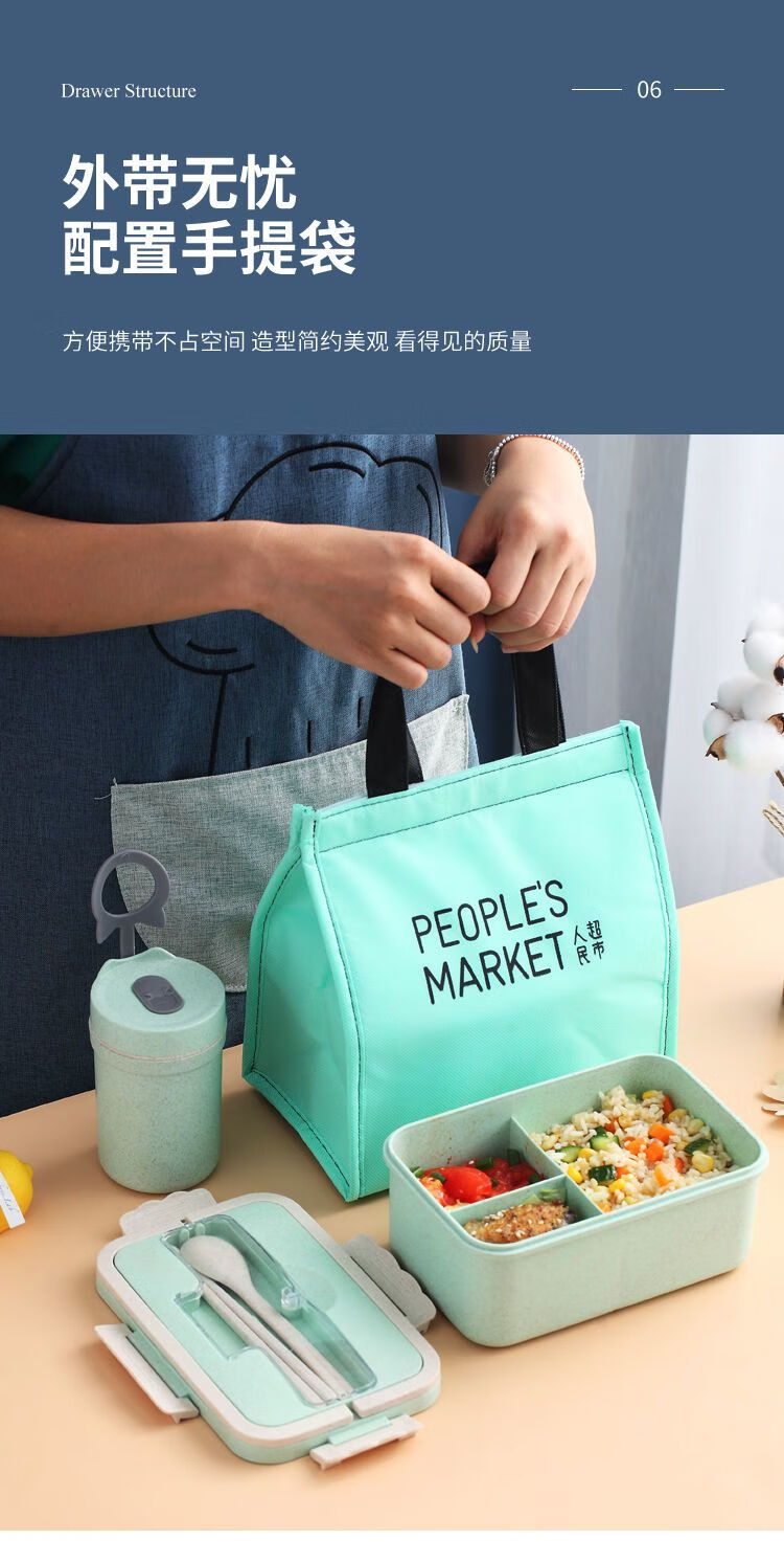 DEATKN德国小麦便携保温饭盒学生三格便当盒女手提大容量加热密封上班族 藏青蓝(三格1000ml) 贈(小麦)筷勺