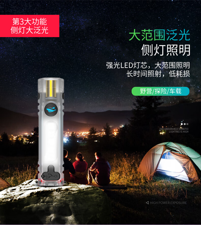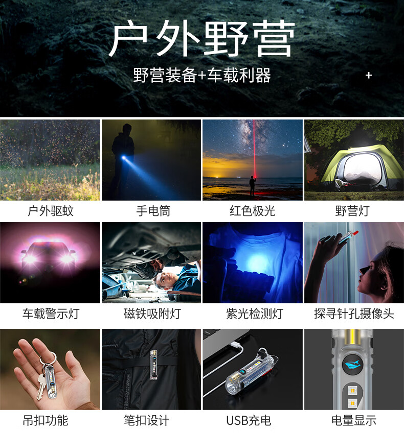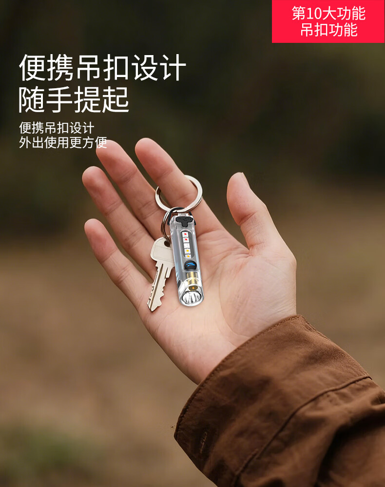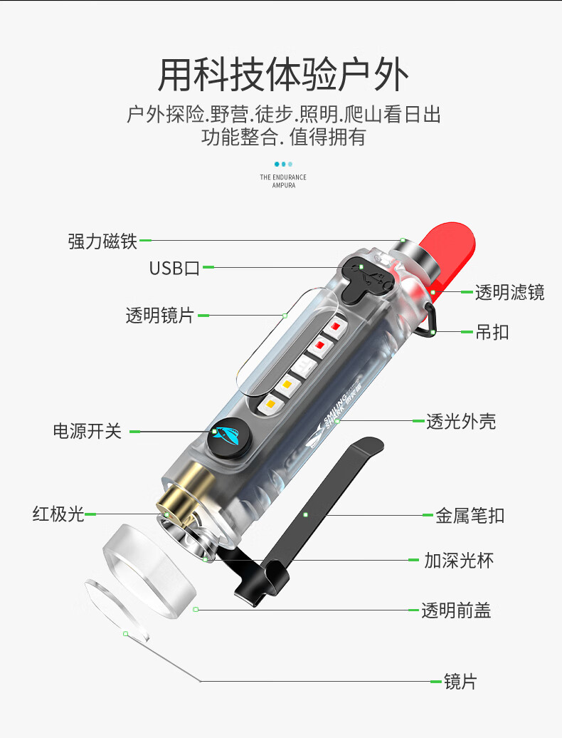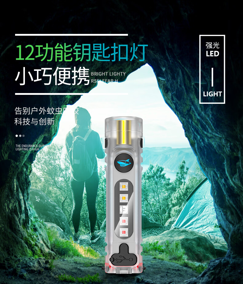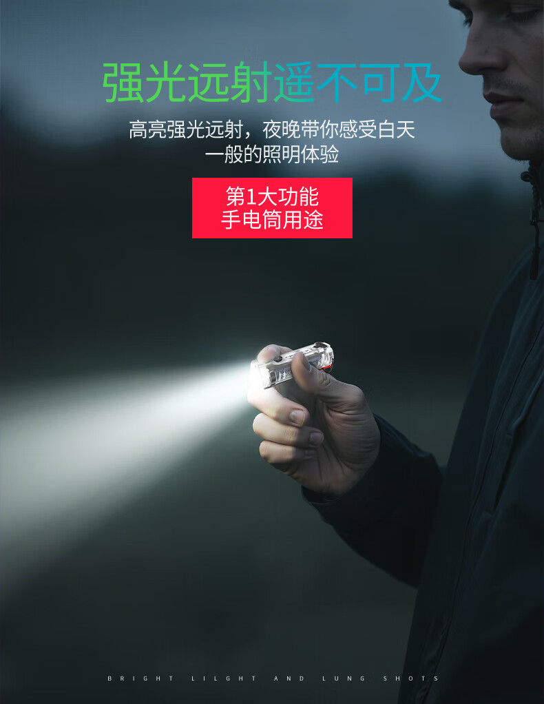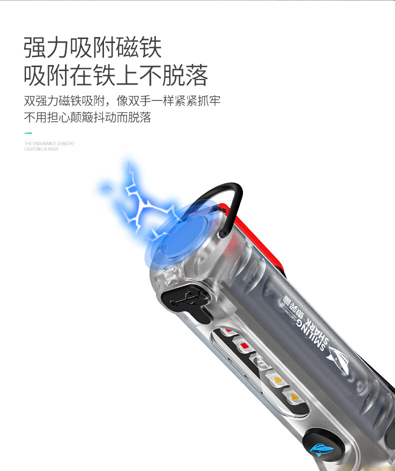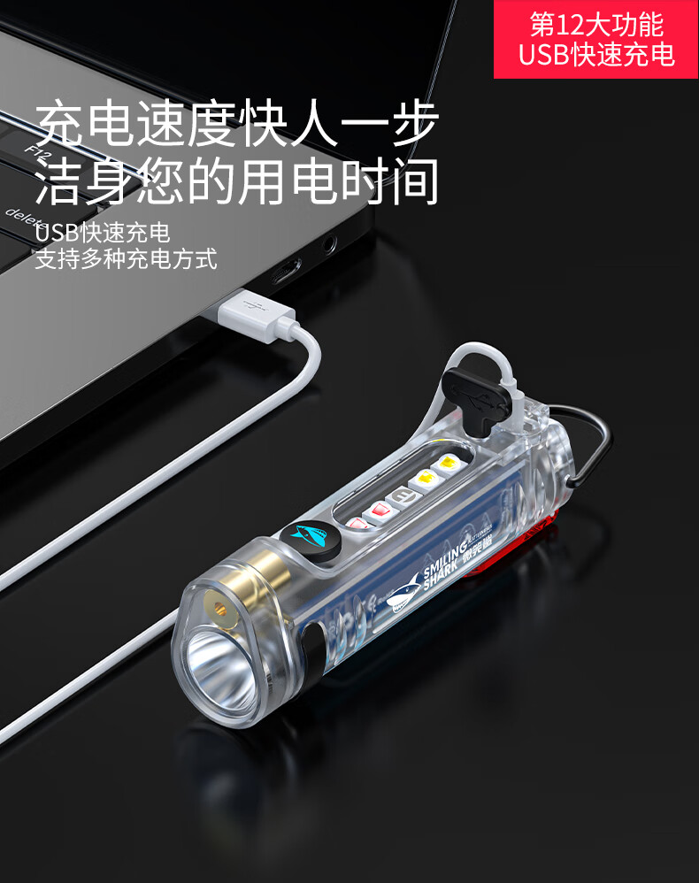 微笑鲨便携式迷你特小手电筒6060充电小型钥匙扣灯强光多功能强磁激光笔 透明色【8档钥匙扣灯】 尾部强磁-白红紫泛四光