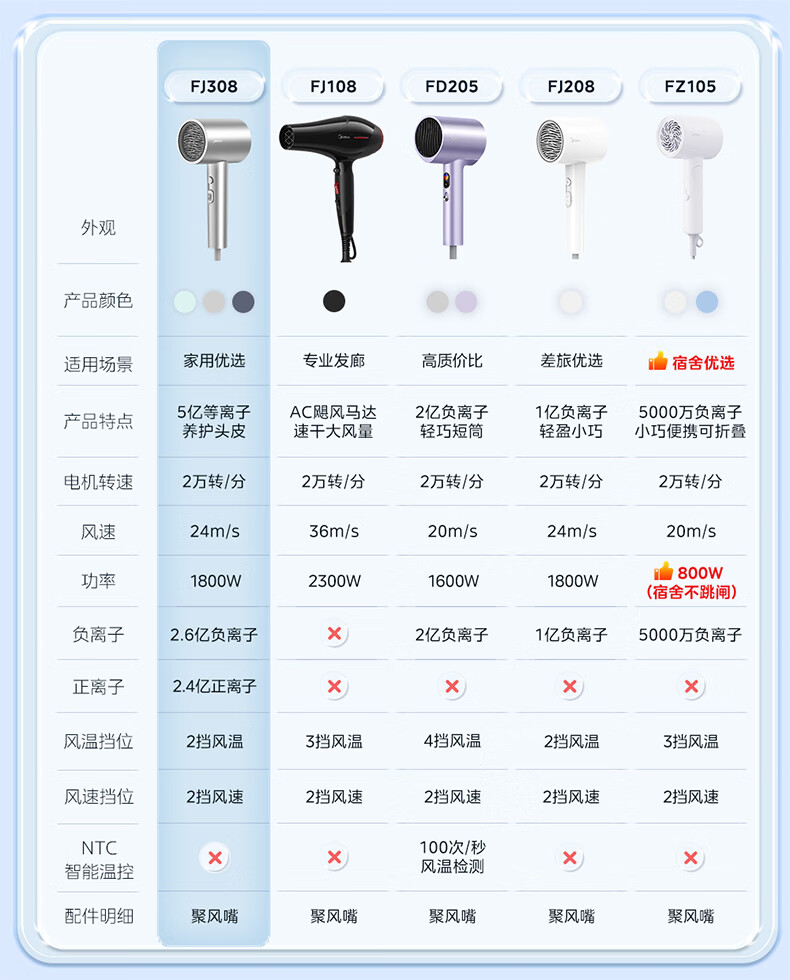美的(Midea)5亿等离子护发电吹风 家用负离子吹风筒 1800W大功率便携吹风机FJ308银 国家补贴 节日/生日礼物