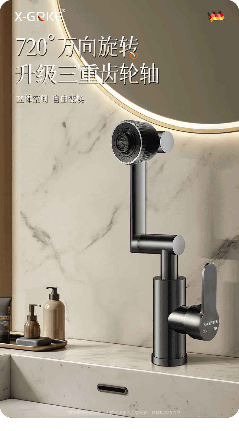 X-GRKE【德国】水龙头洗脸盆冷热水器二合一卫生间洗手盆防溅水面盆龙头 电镀银丨1080°机械臂面盆龙头 304不锈钢80cm管*2丨漏水包退换