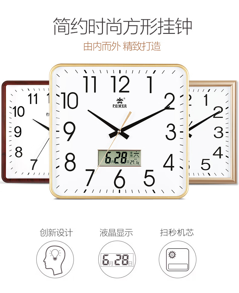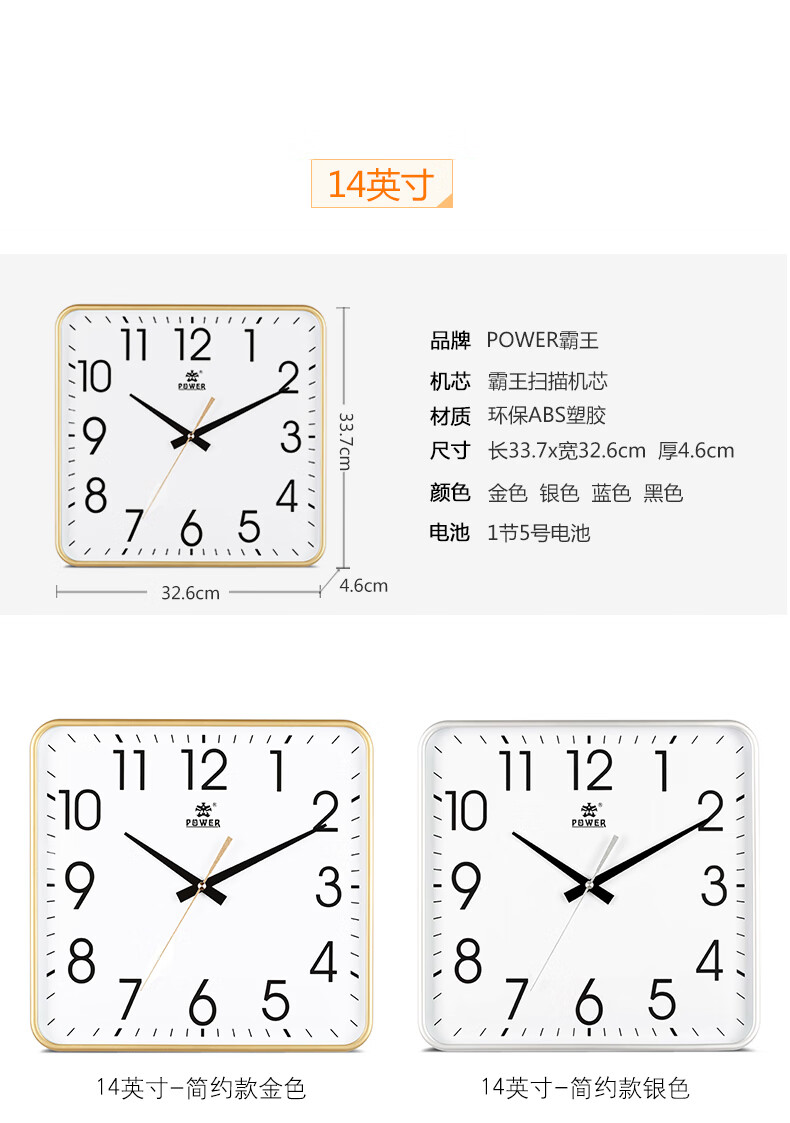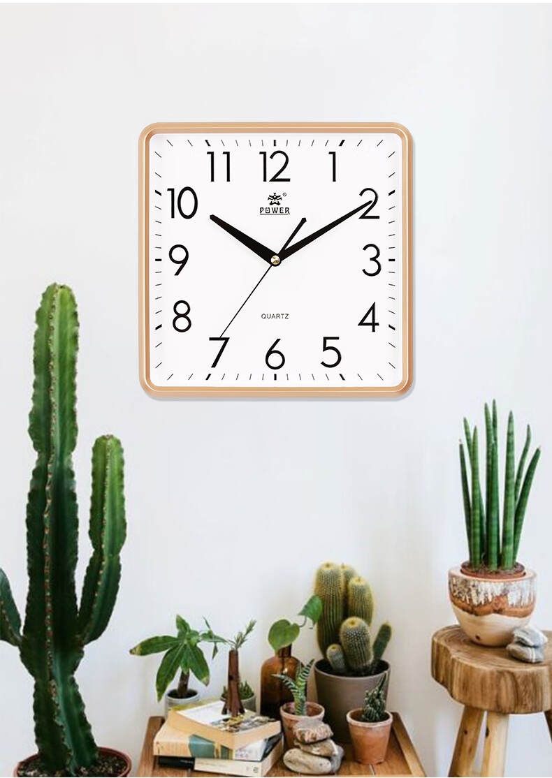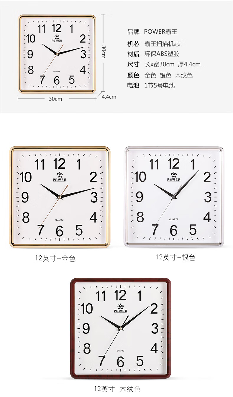 POWER霸王钟表挂钟方形客厅简约时钟立体字挂墙30cm银BW23005F