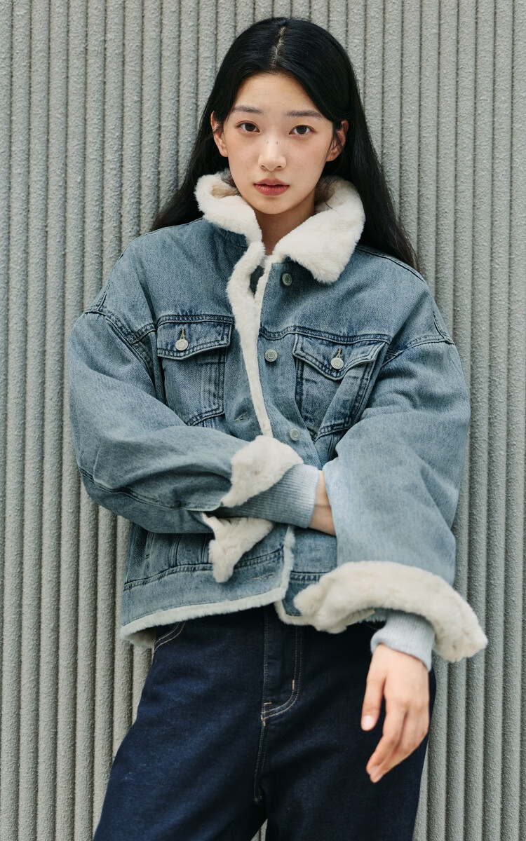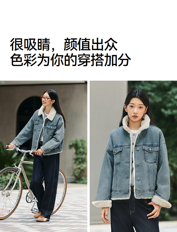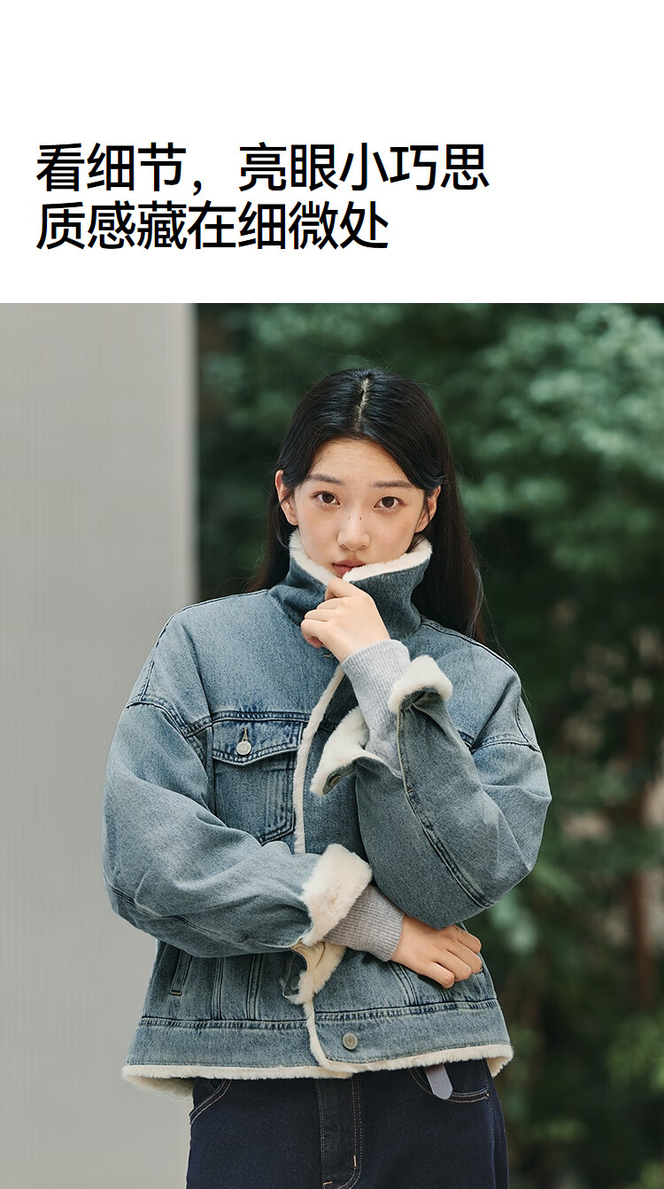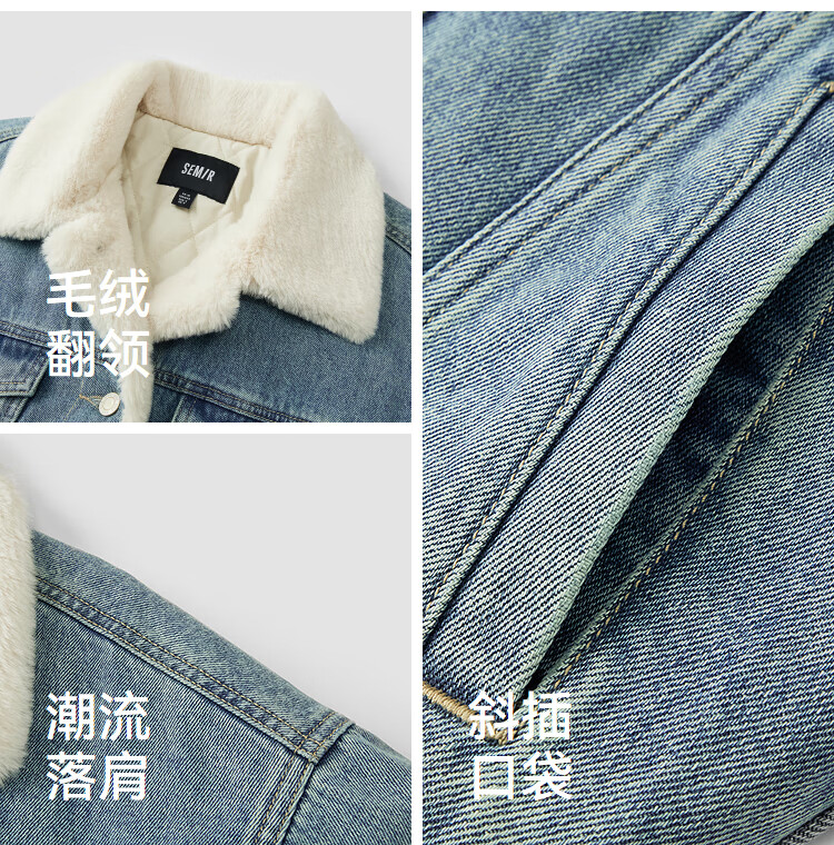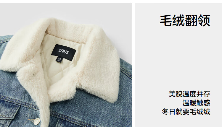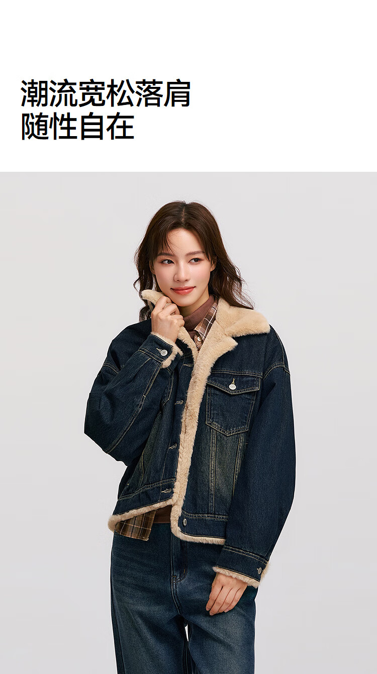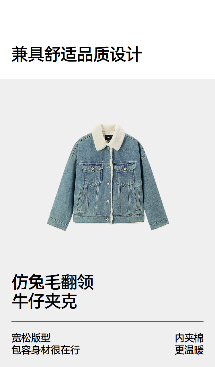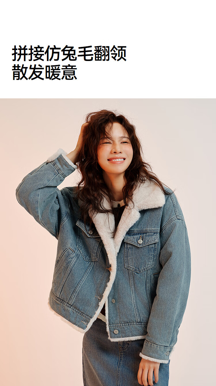 森马(Semir)牛仔外套女拼接仿兔毛翻领宽松港风冬季落肩夹棉夹克103724108001