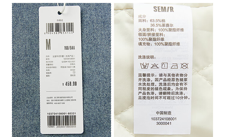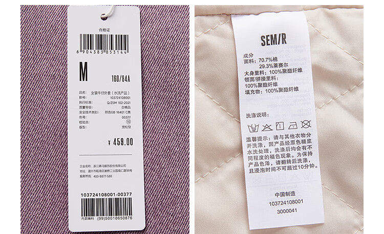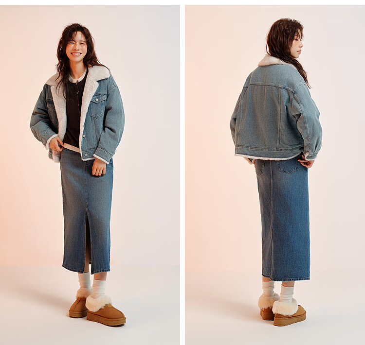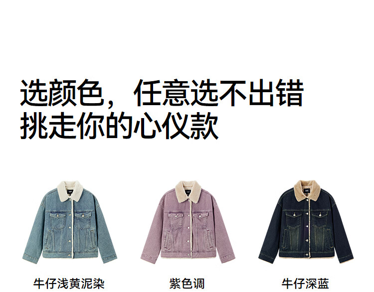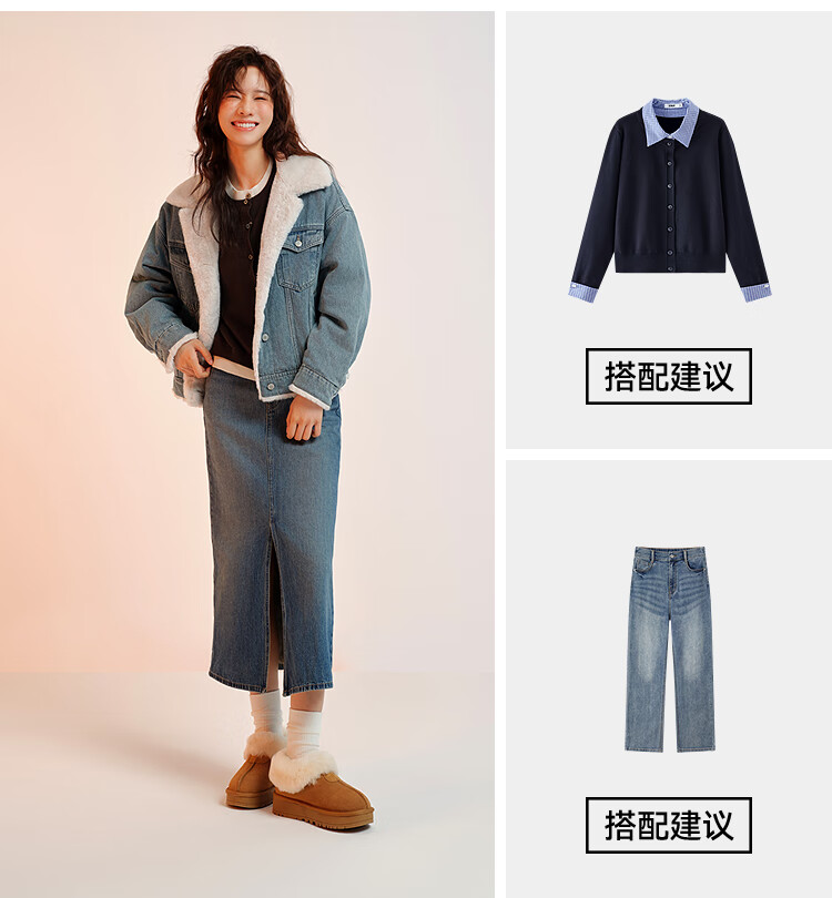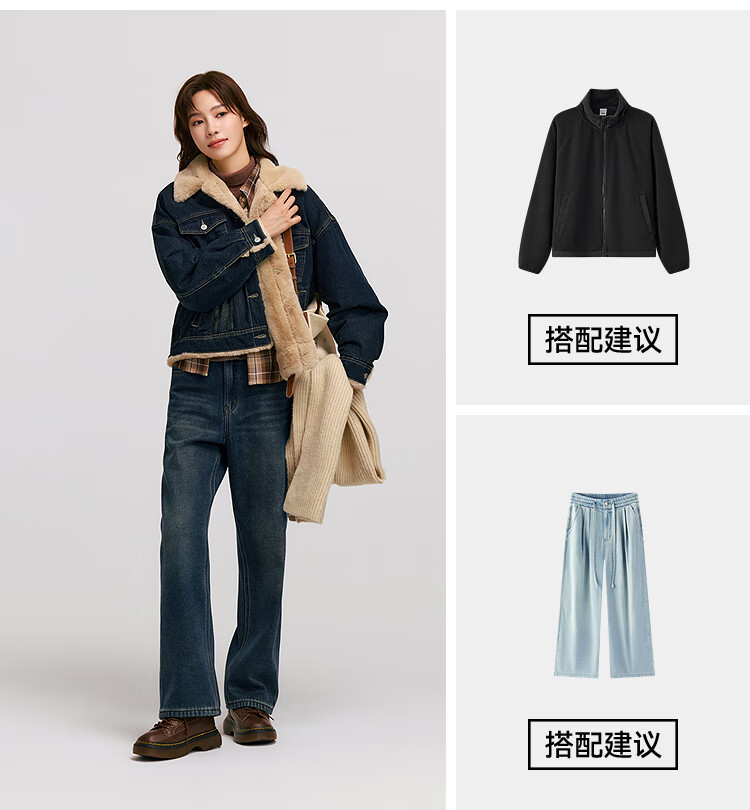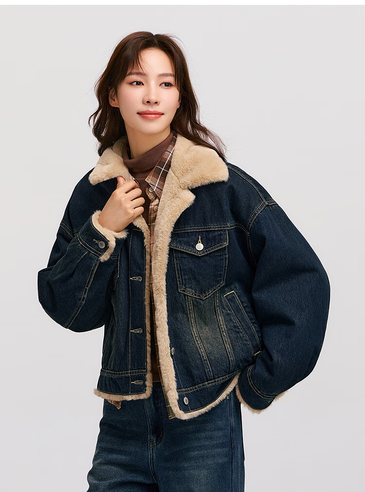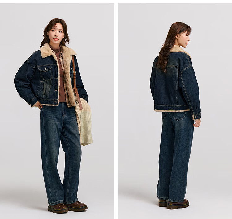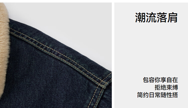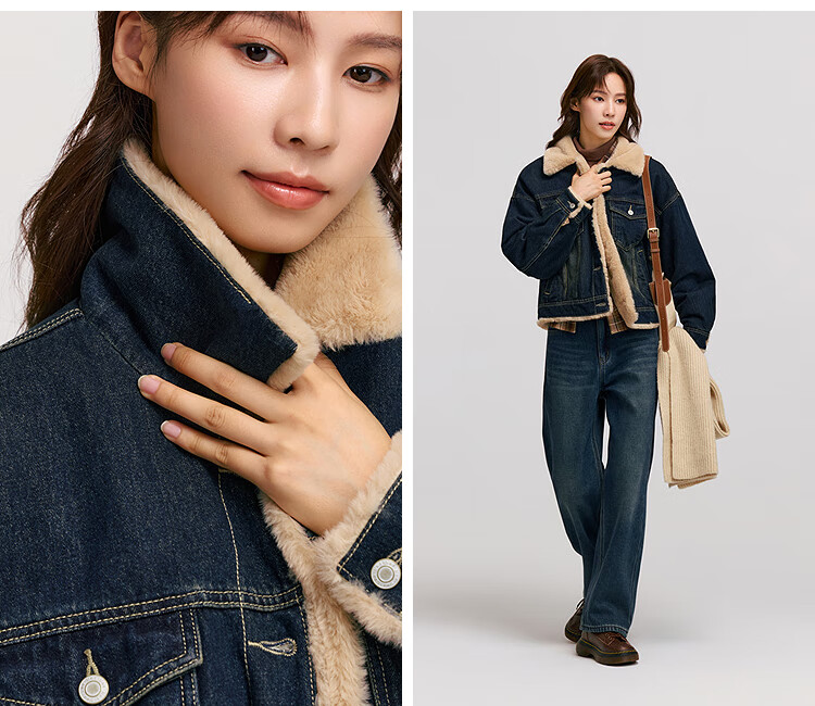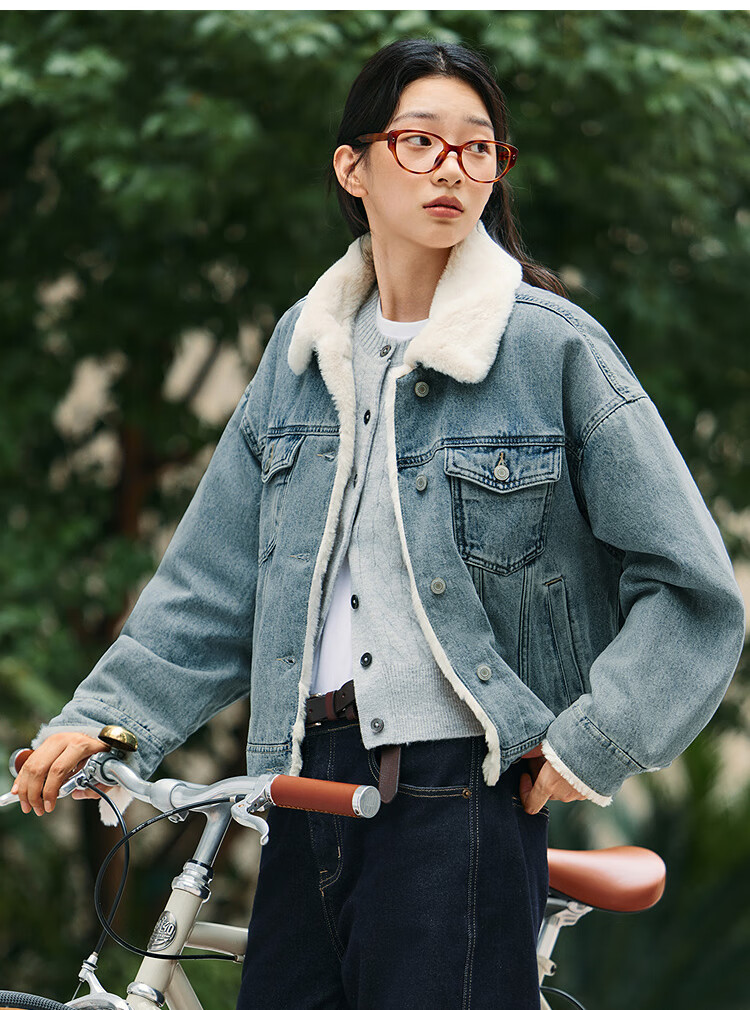 森马(Semir)牛仔外套女拼接仿兔毛翻领宽松港风冬季落肩夹棉夹克103724108001