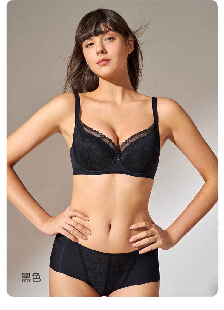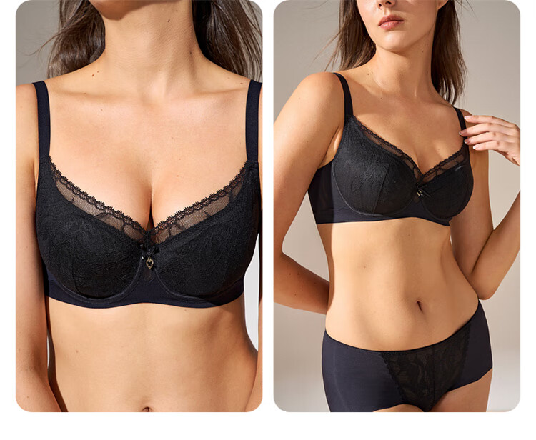 曼妮芬性感蕾丝大胸显小单层围文胸女士内衣舒适胸罩 黑色 75C