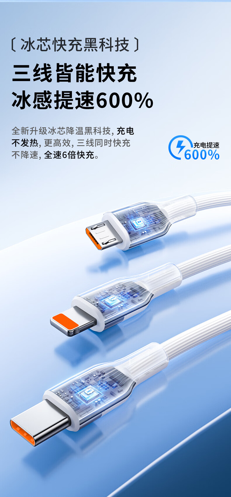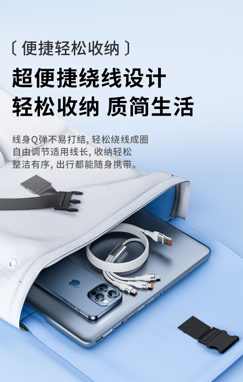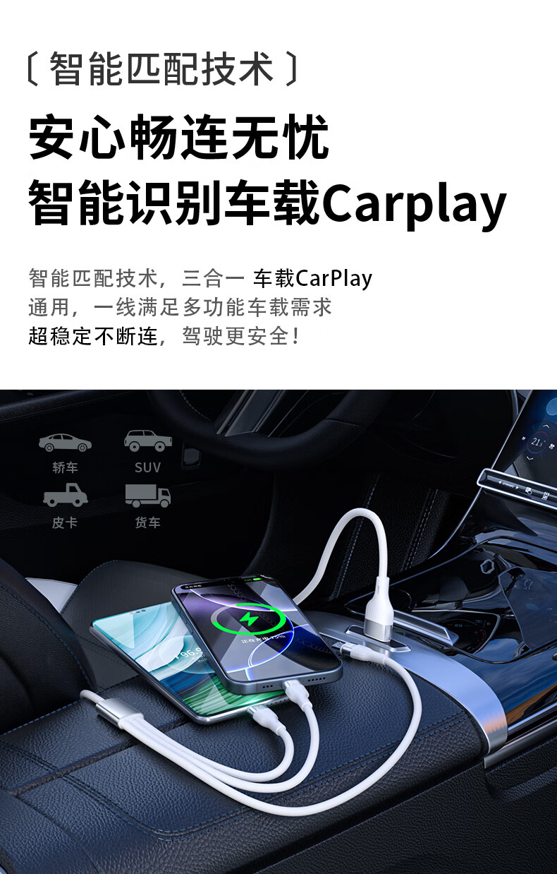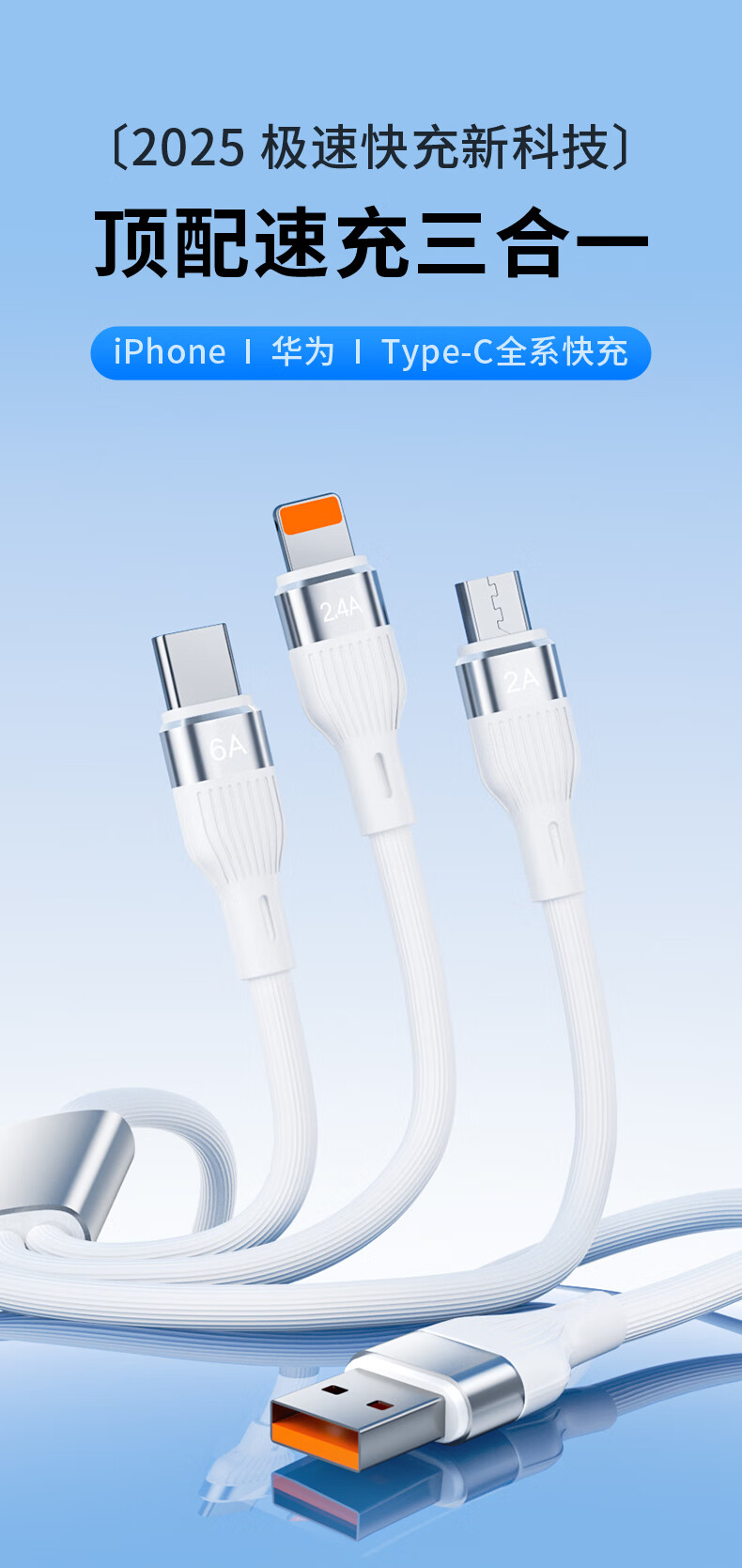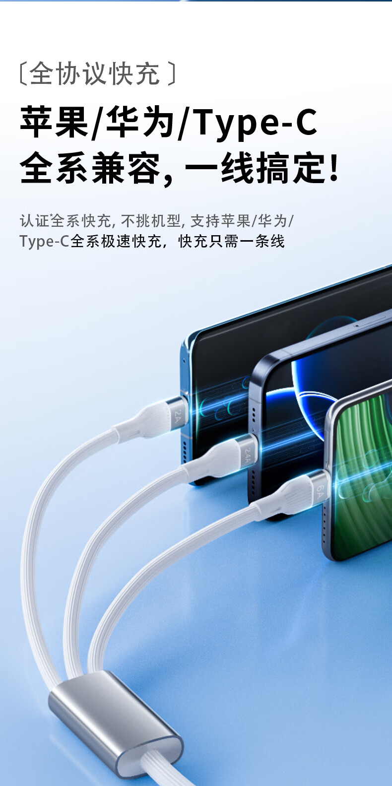AMKE充电线三合一数据线一拖三100W快充type-c多三头适用苹果iPhone小米OPPO三星华为vivo安卓车载
