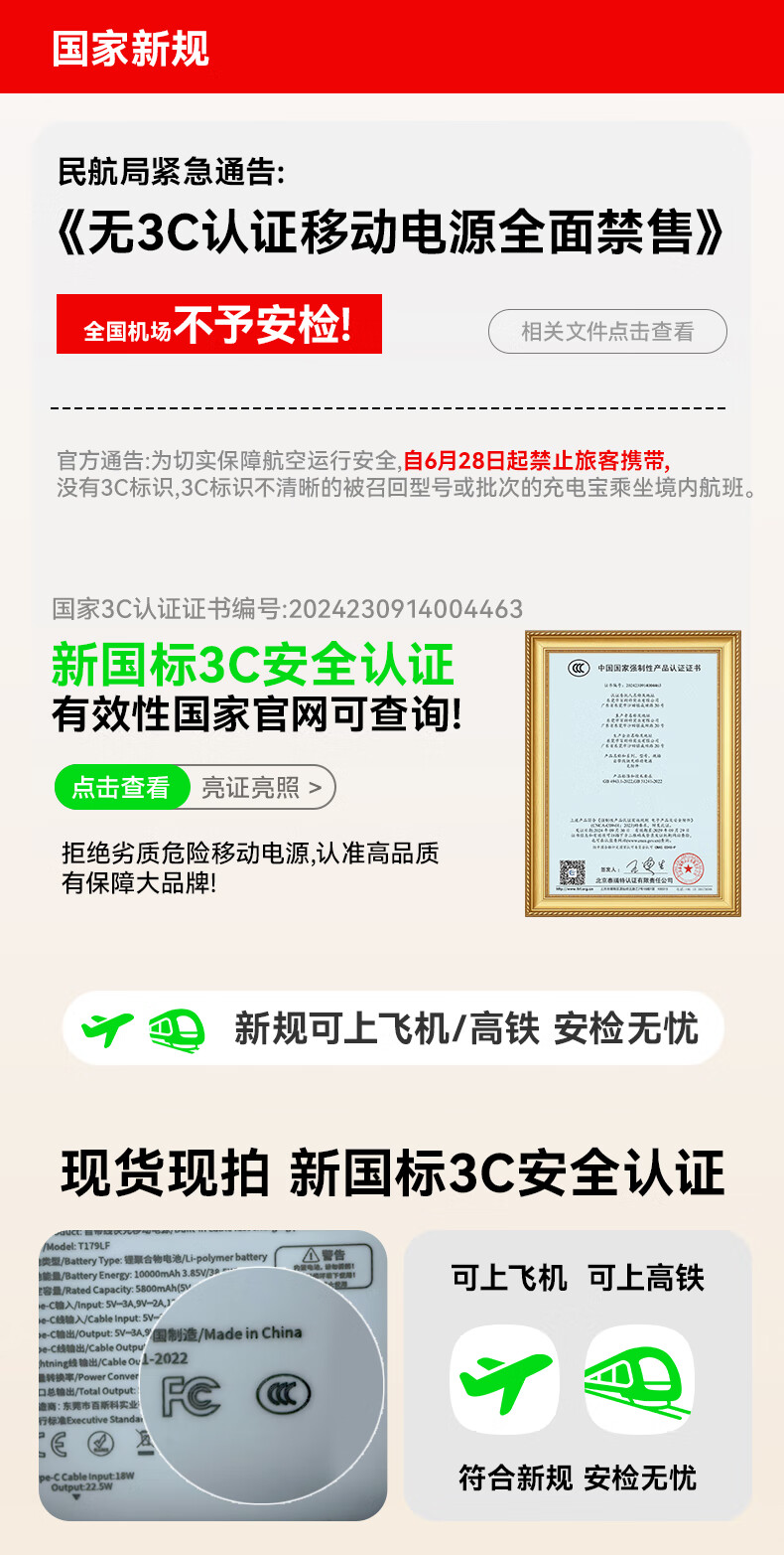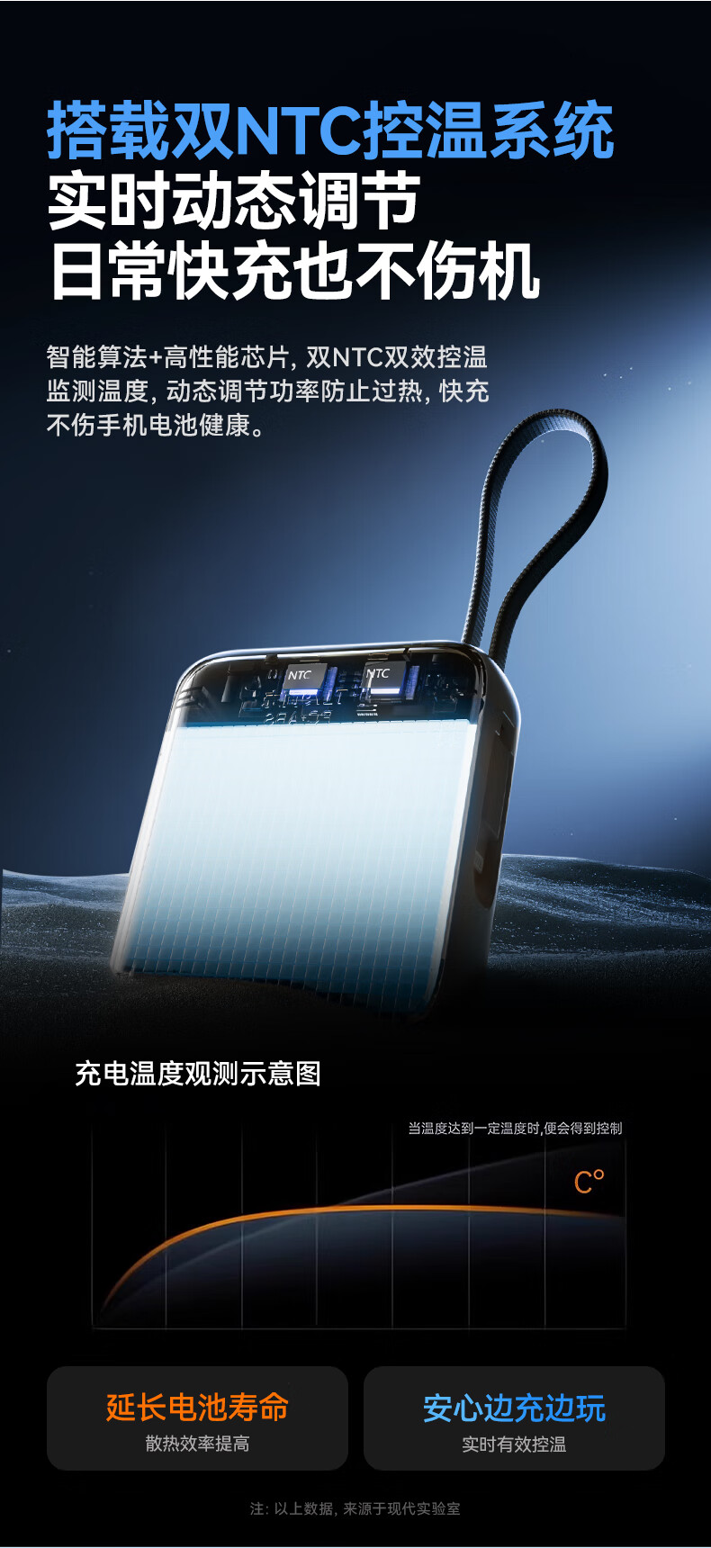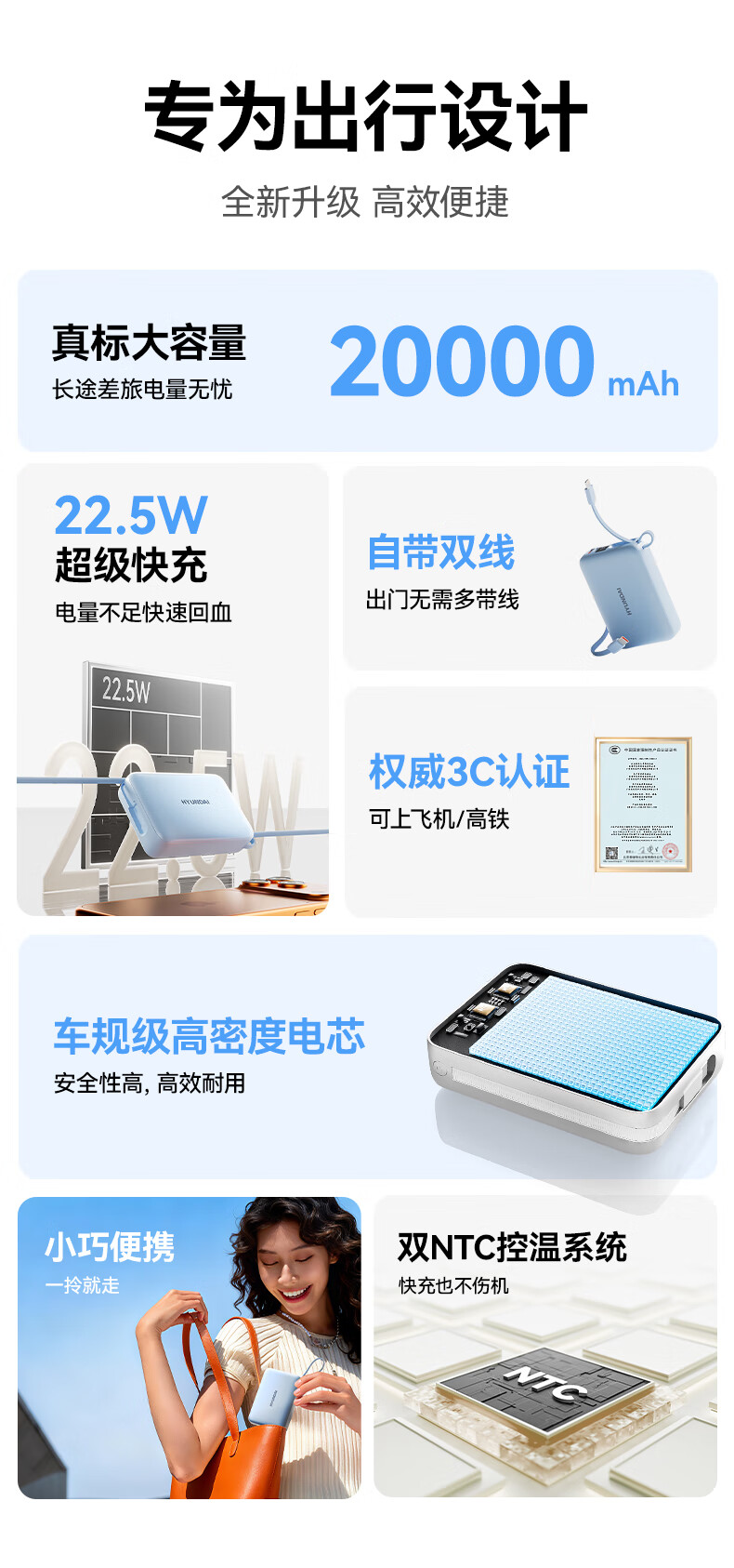Hichain和昌【3C认证可上飞机】自带双线10000毫安充电宝22.5W小巧便携快充移动电源适用苹果17小米华为