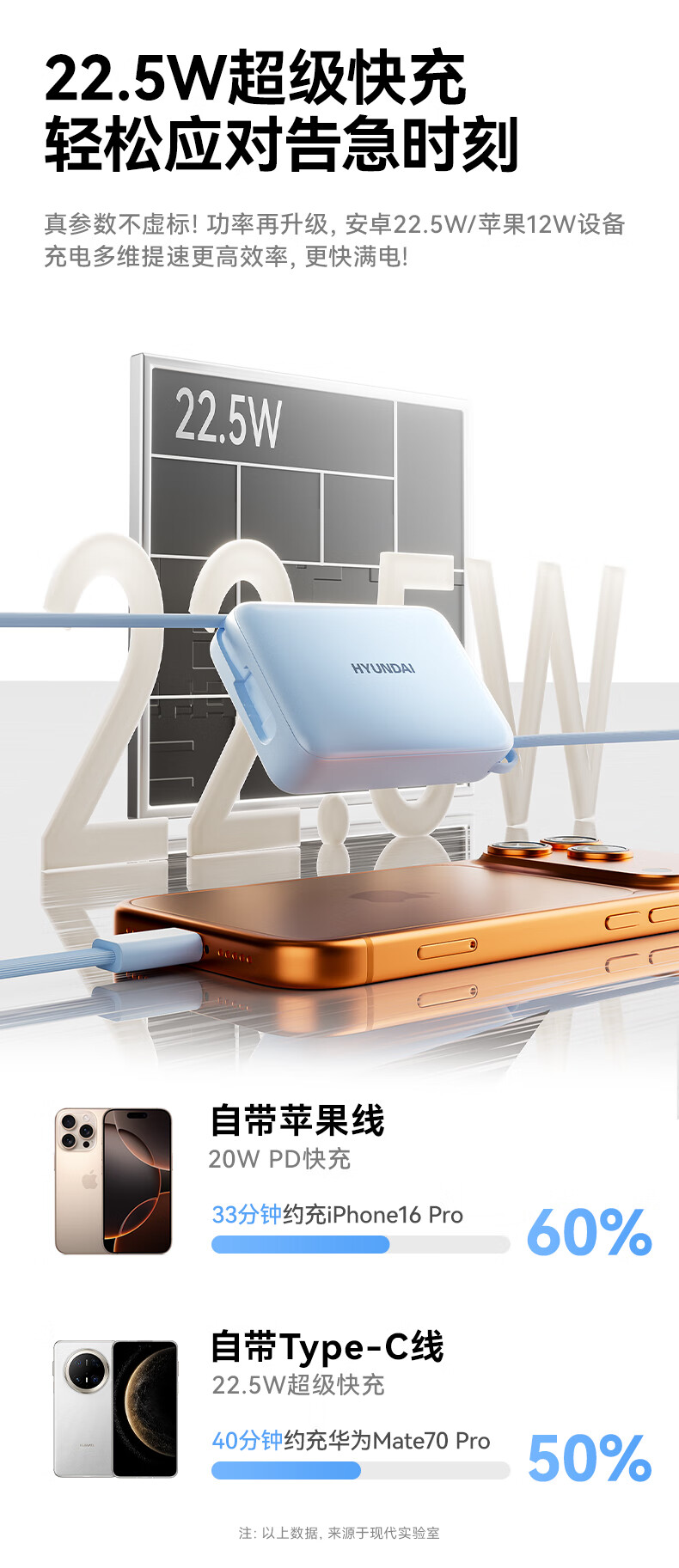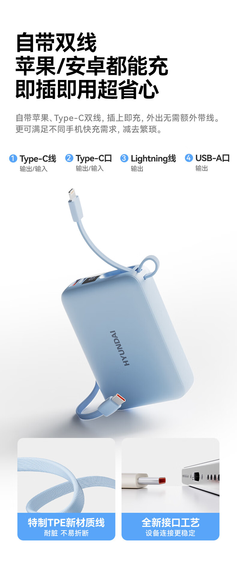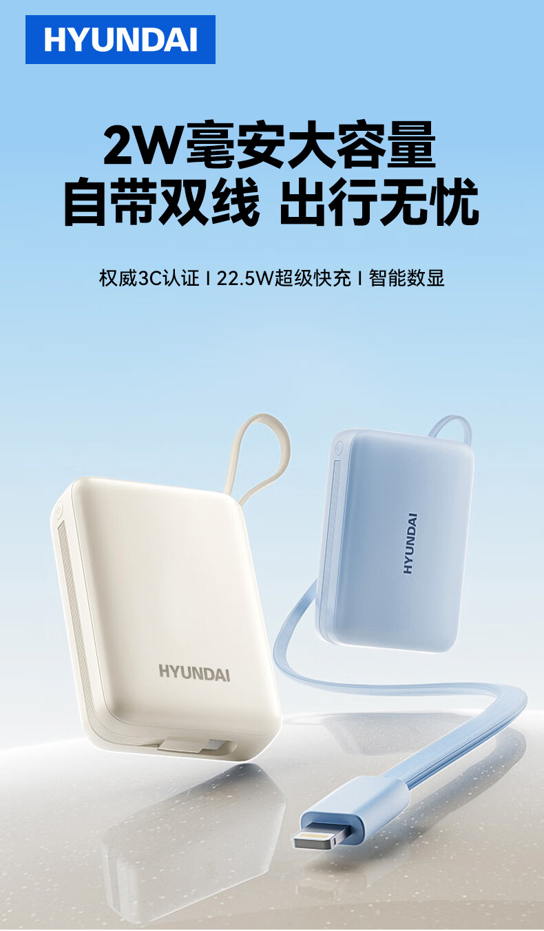 HYUNDAI现代充电宝20000毫安3c认证可带上飞机超大容量移动电源便携自带线超级快充22.5W国标3c认证小巧 蓝色丨20000mah丨22.5W双线快充