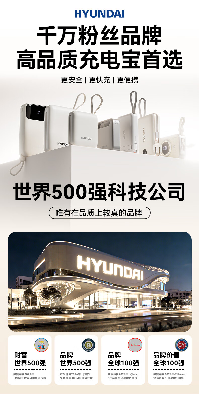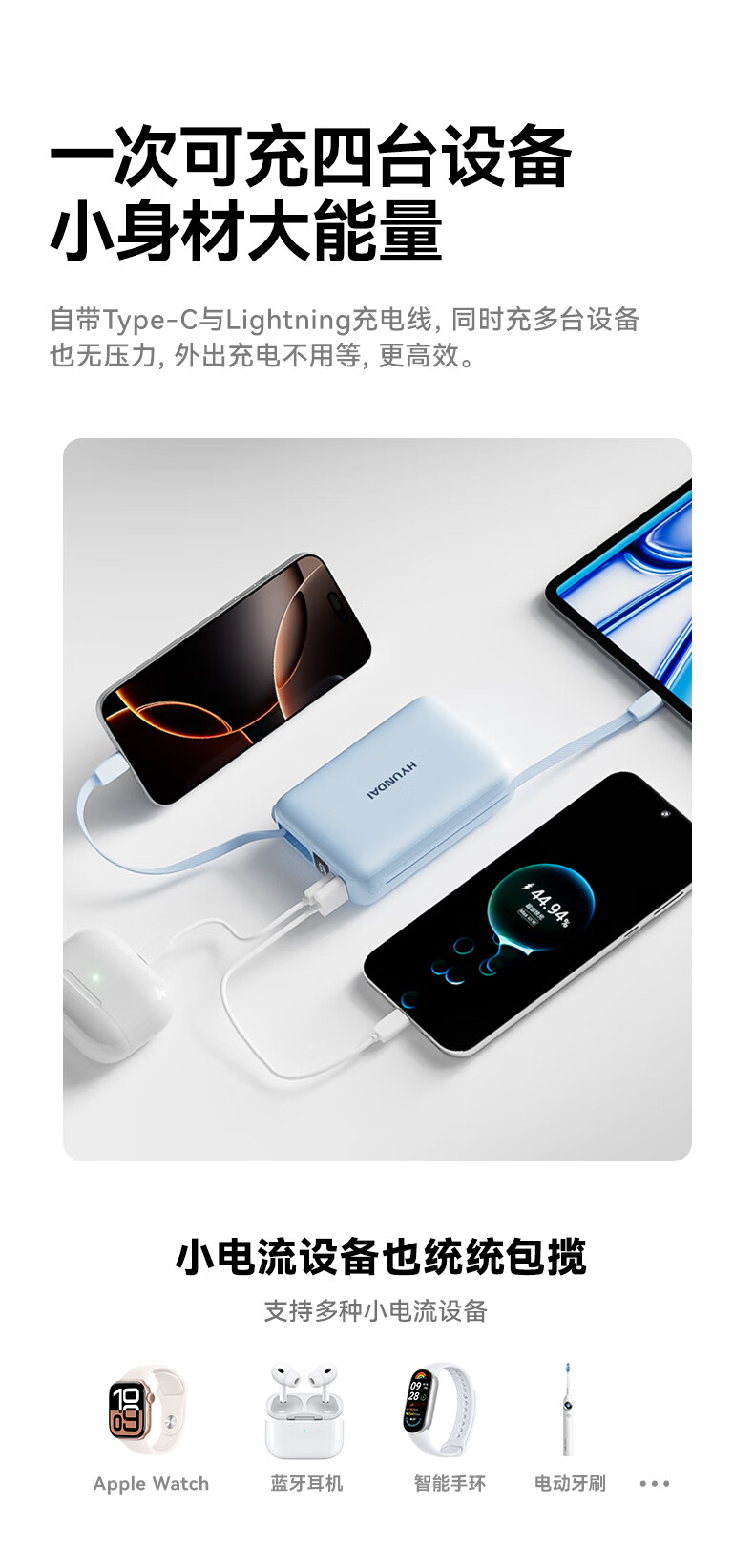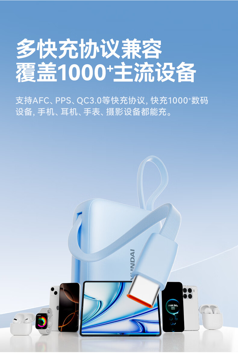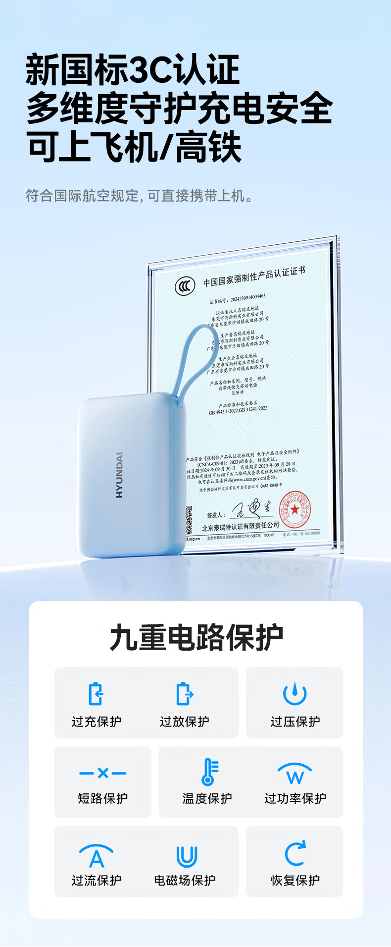 HYUNDAI现代充电宝20000毫安3c认证可带上飞机超大容量移动电源便携自带线超级快充22.5W国标3c认证小巧 蓝色丨20000mah丨22.5W双线快充