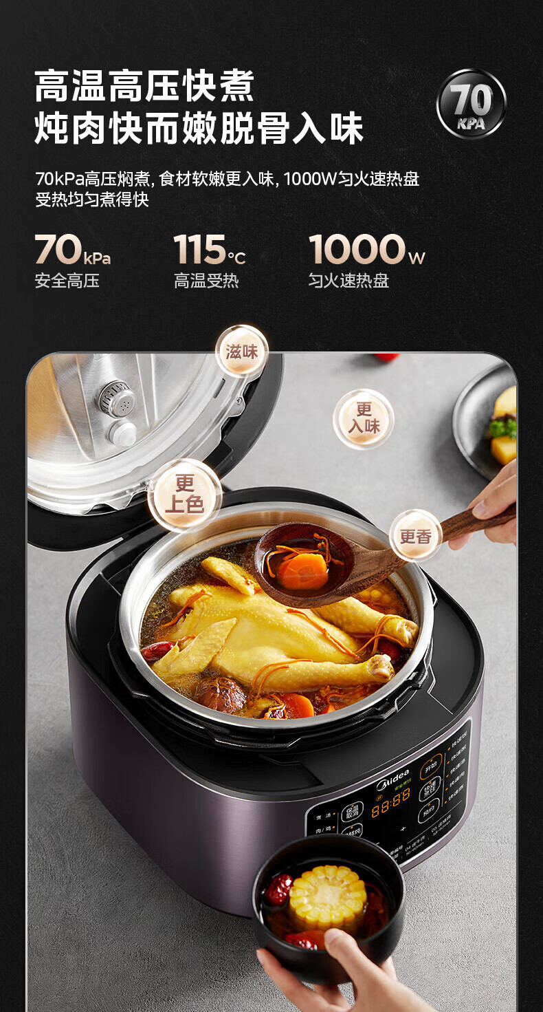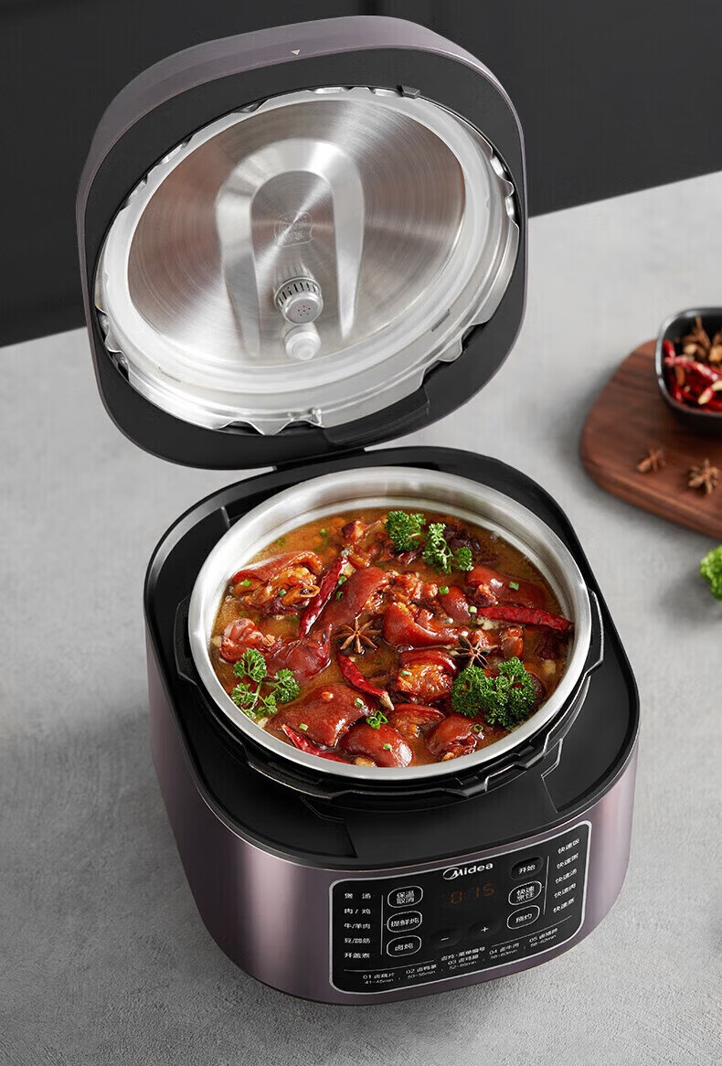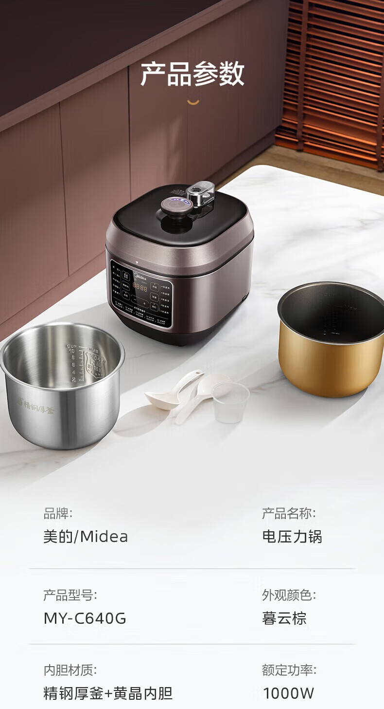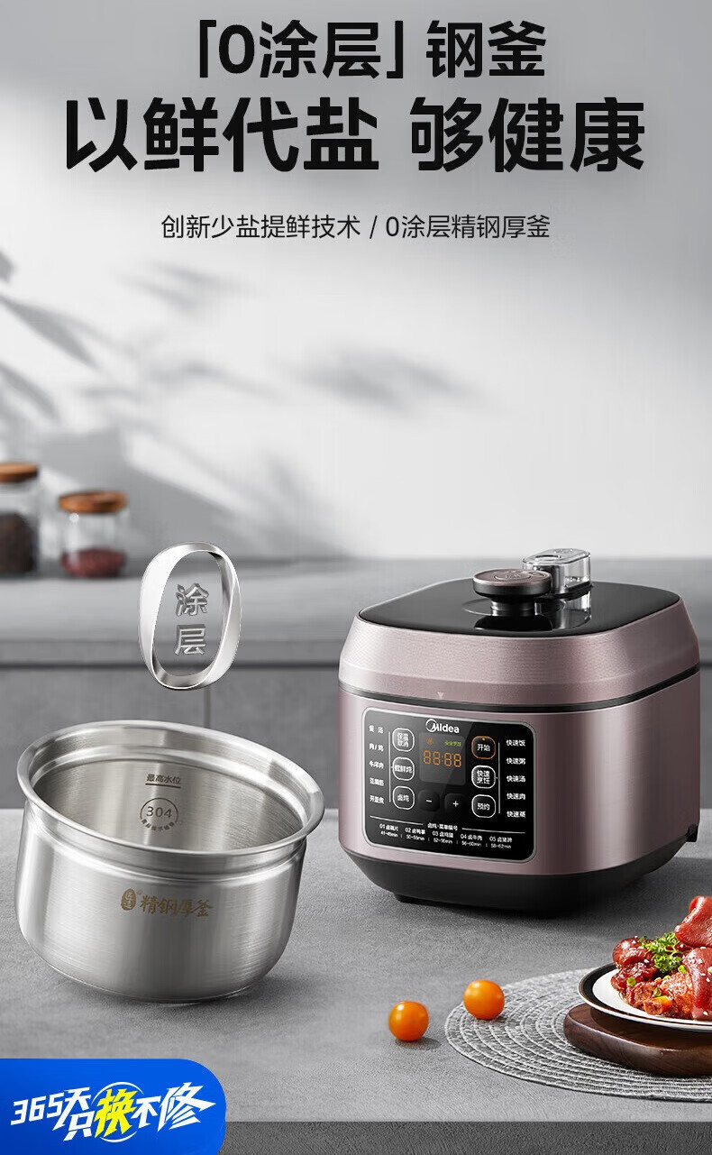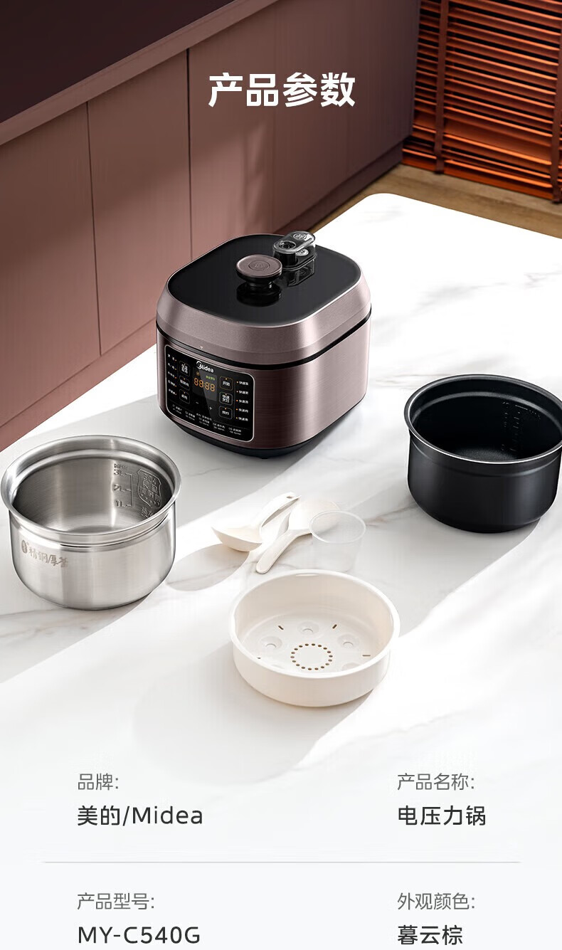 美的电压力锅 电高压锅家用0涂层 高压电饭锅 双内胆电压锅不锈钢内胆 自动排气 3-4-5-6-8-10人 【带蒸屉上蒸下煮】 5L
