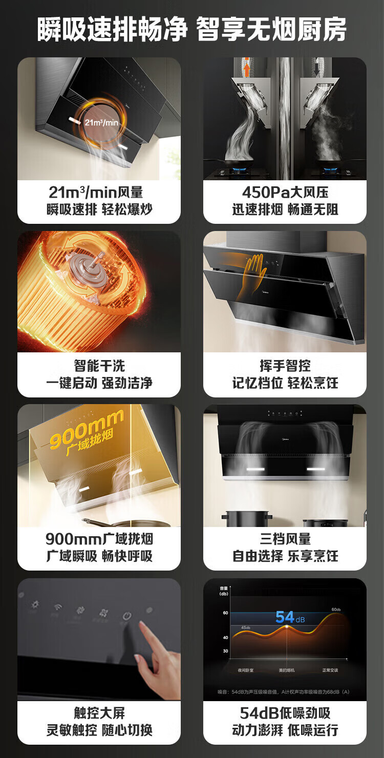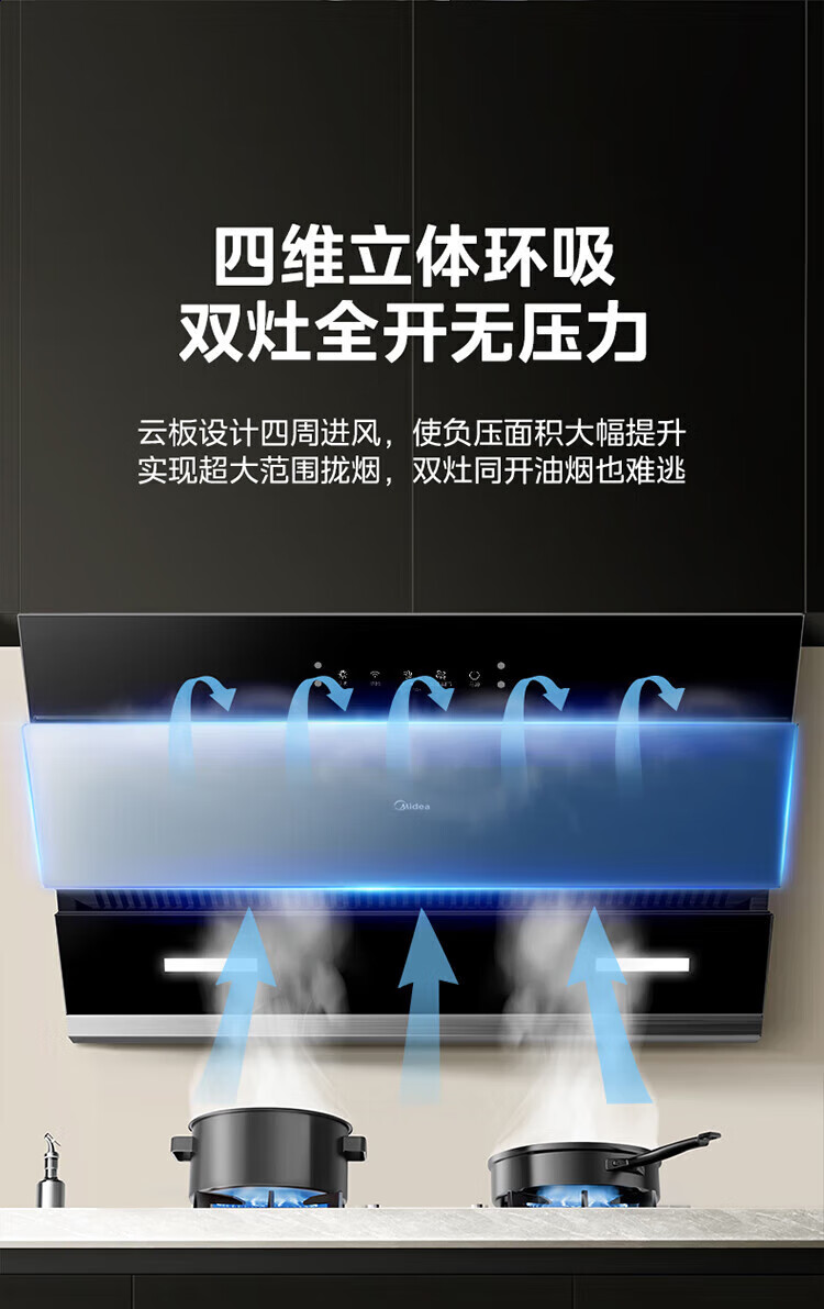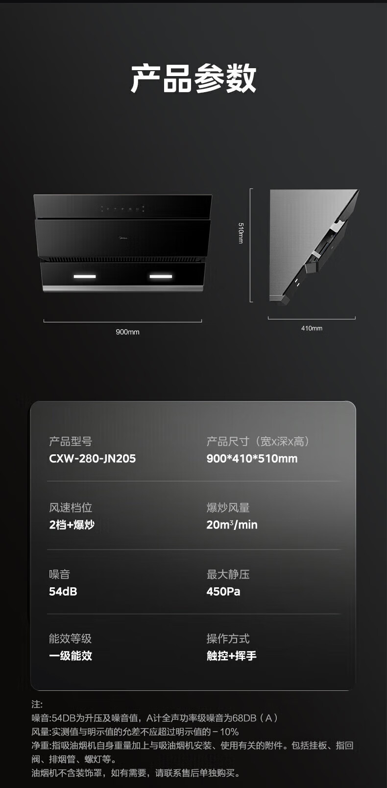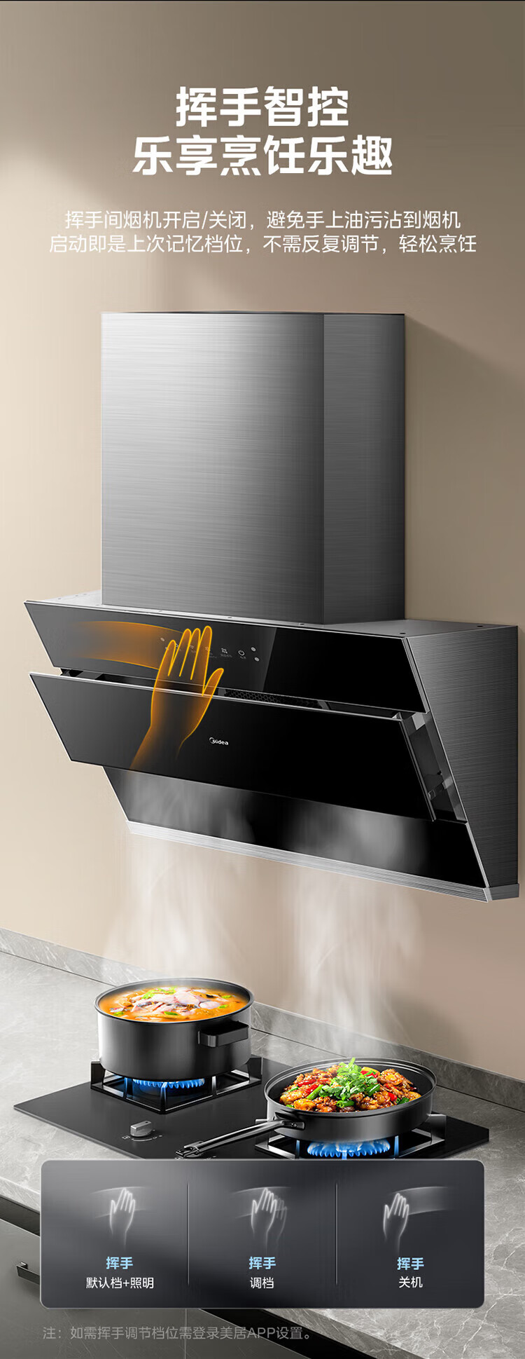 美的(Midea)【高性价比】家用抽油烟机21立方大吸力侧吸式挥手控制自动清洗燃气灶具厨房套装家电排烟机JN205 【21立方】【挥手控制 立体环吸】单烟机