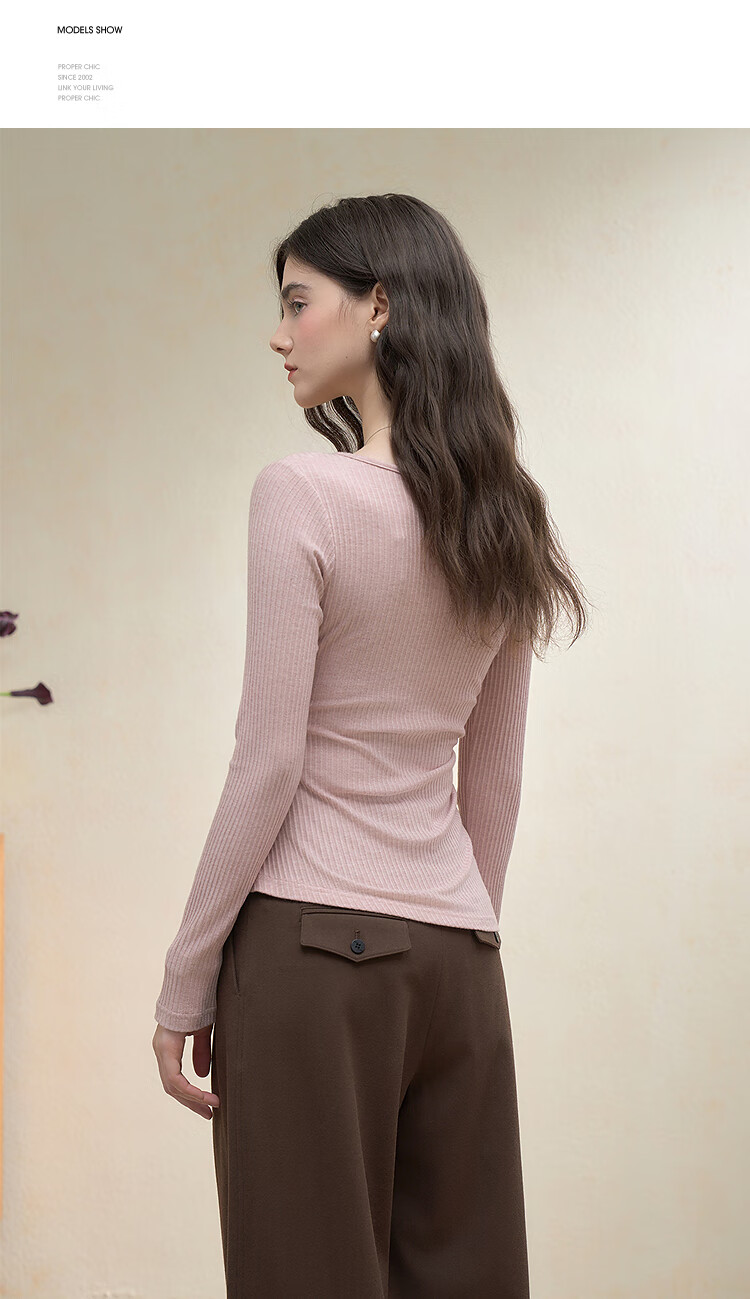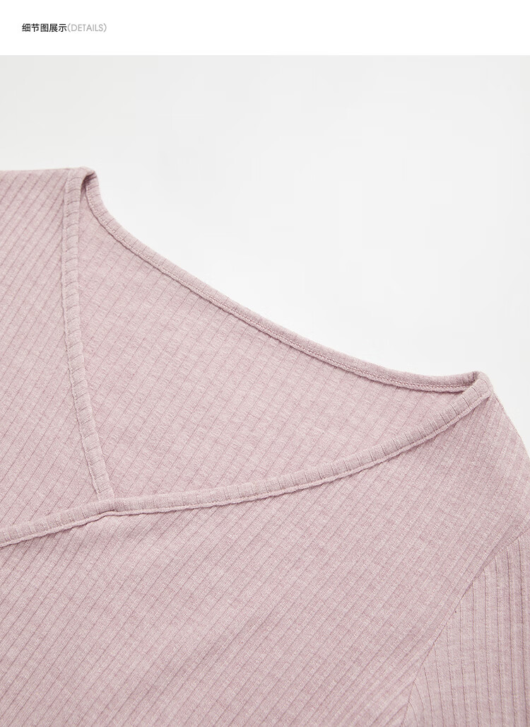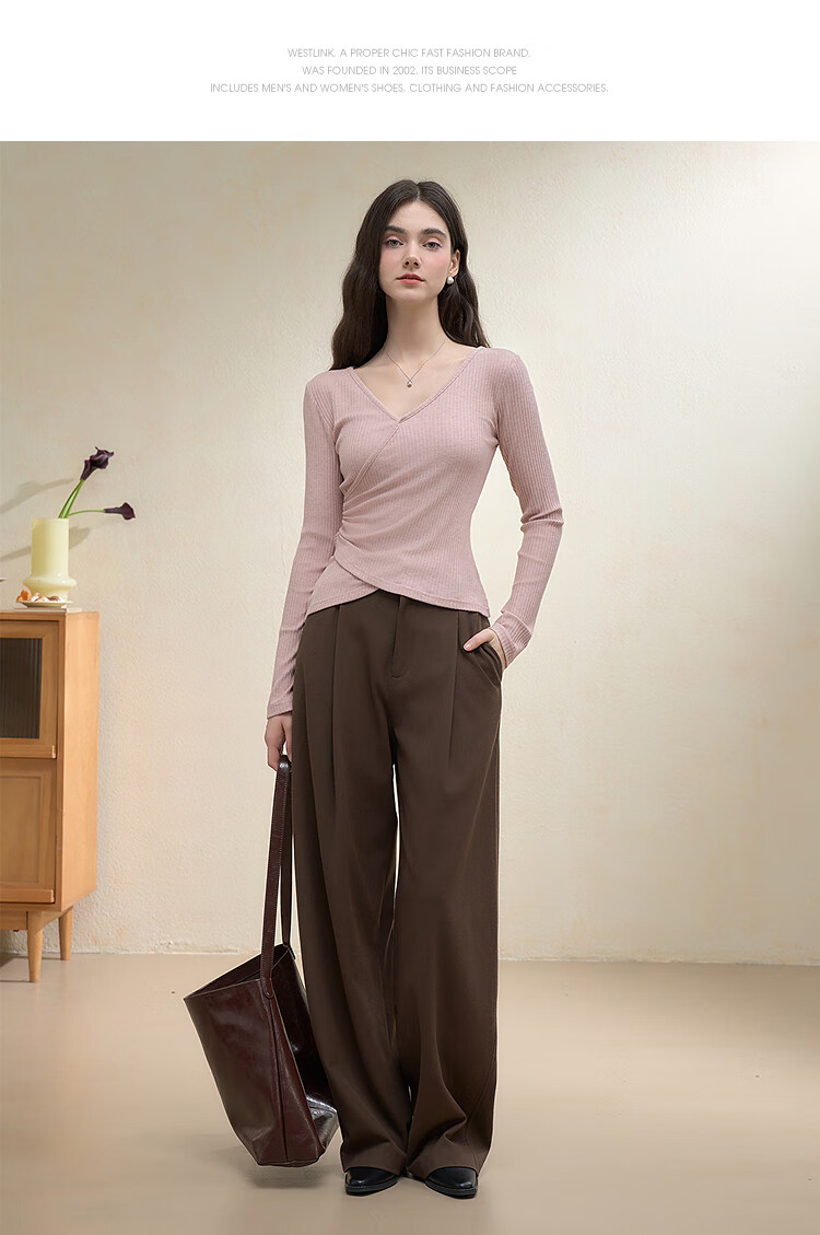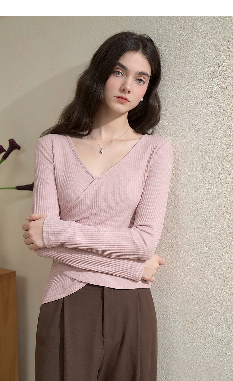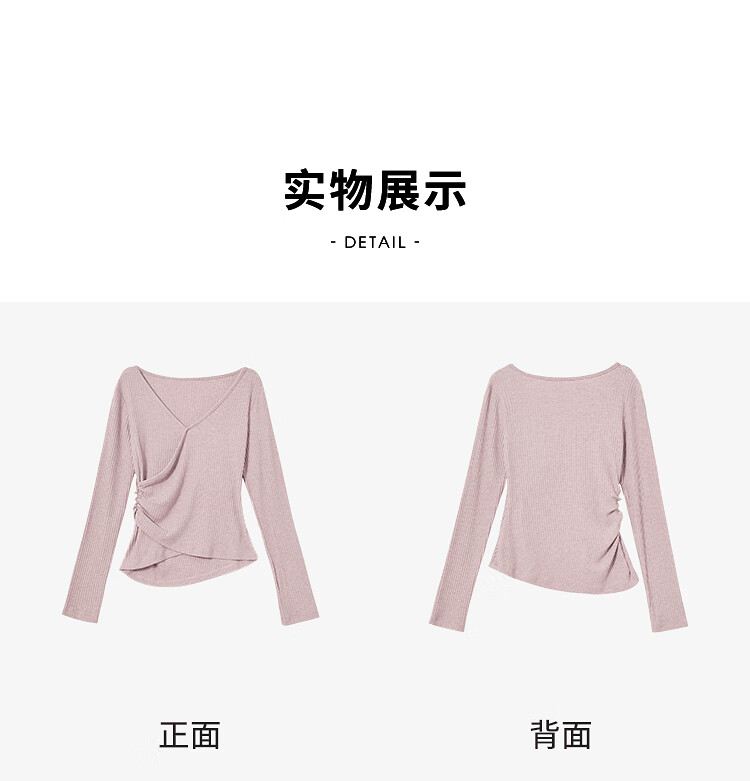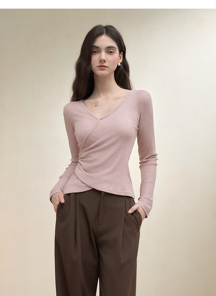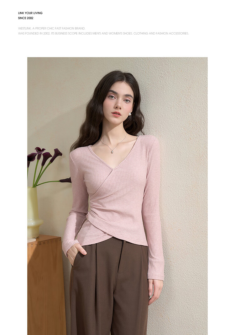 西遇法式气质V领交叉长袖针织衫女2025秋季捏摺收腰显瘦内搭T恤 粉色 (XL预售9月28) L (165)