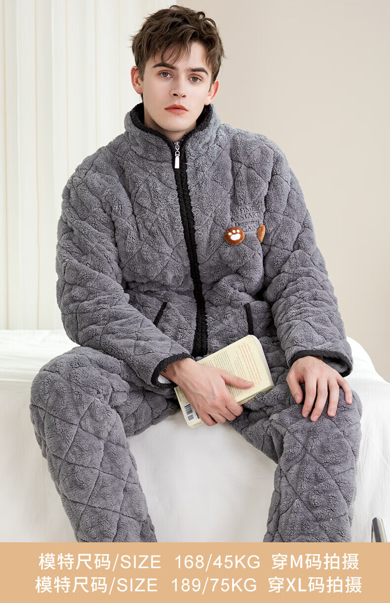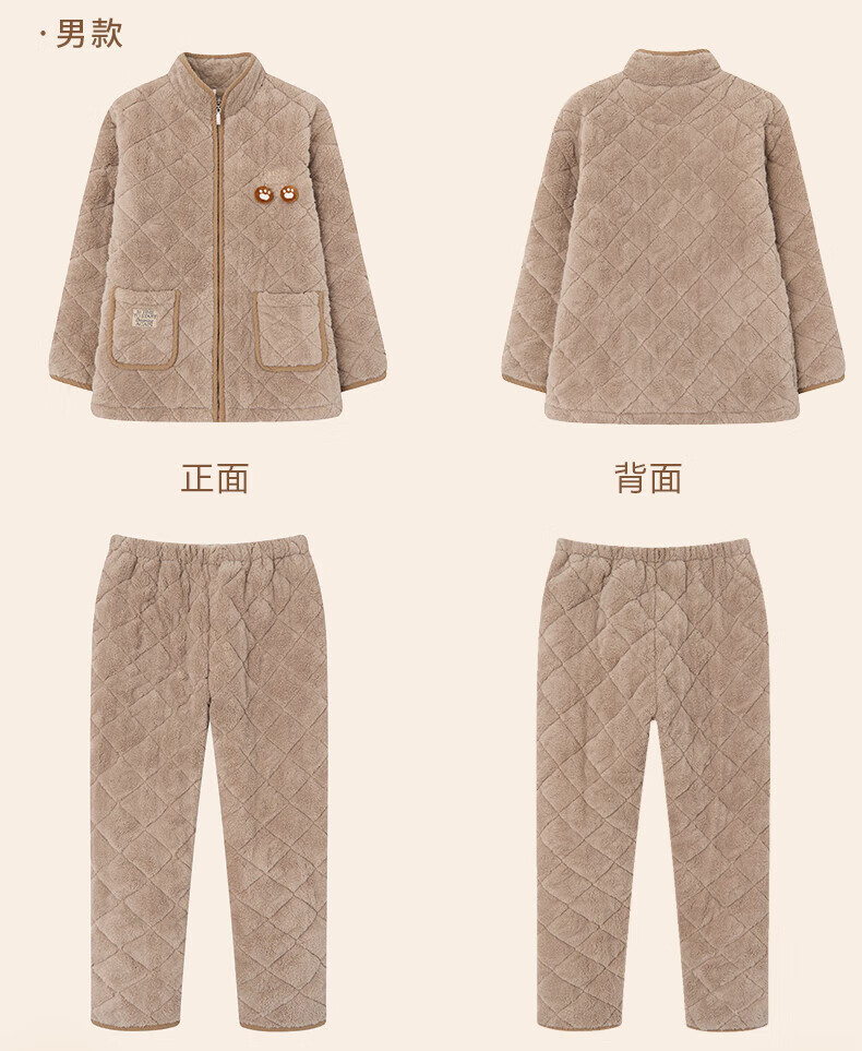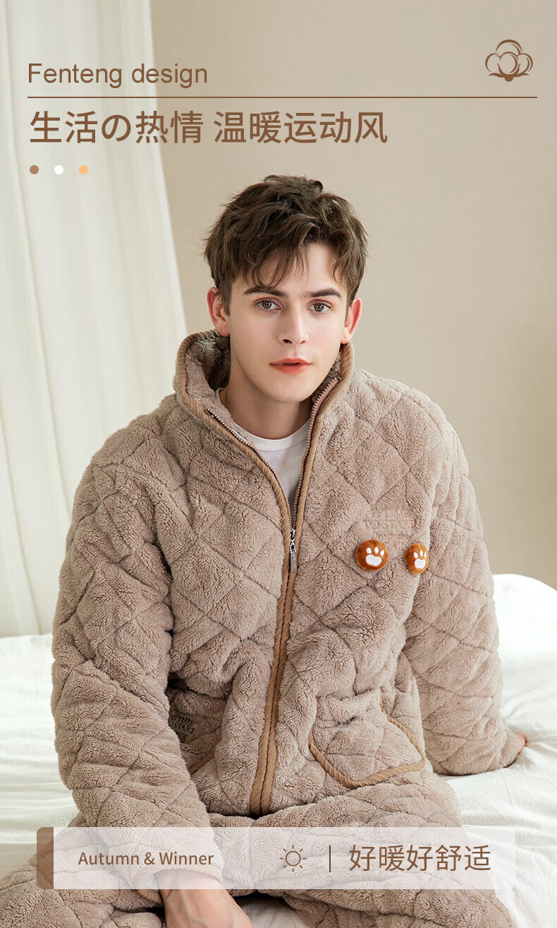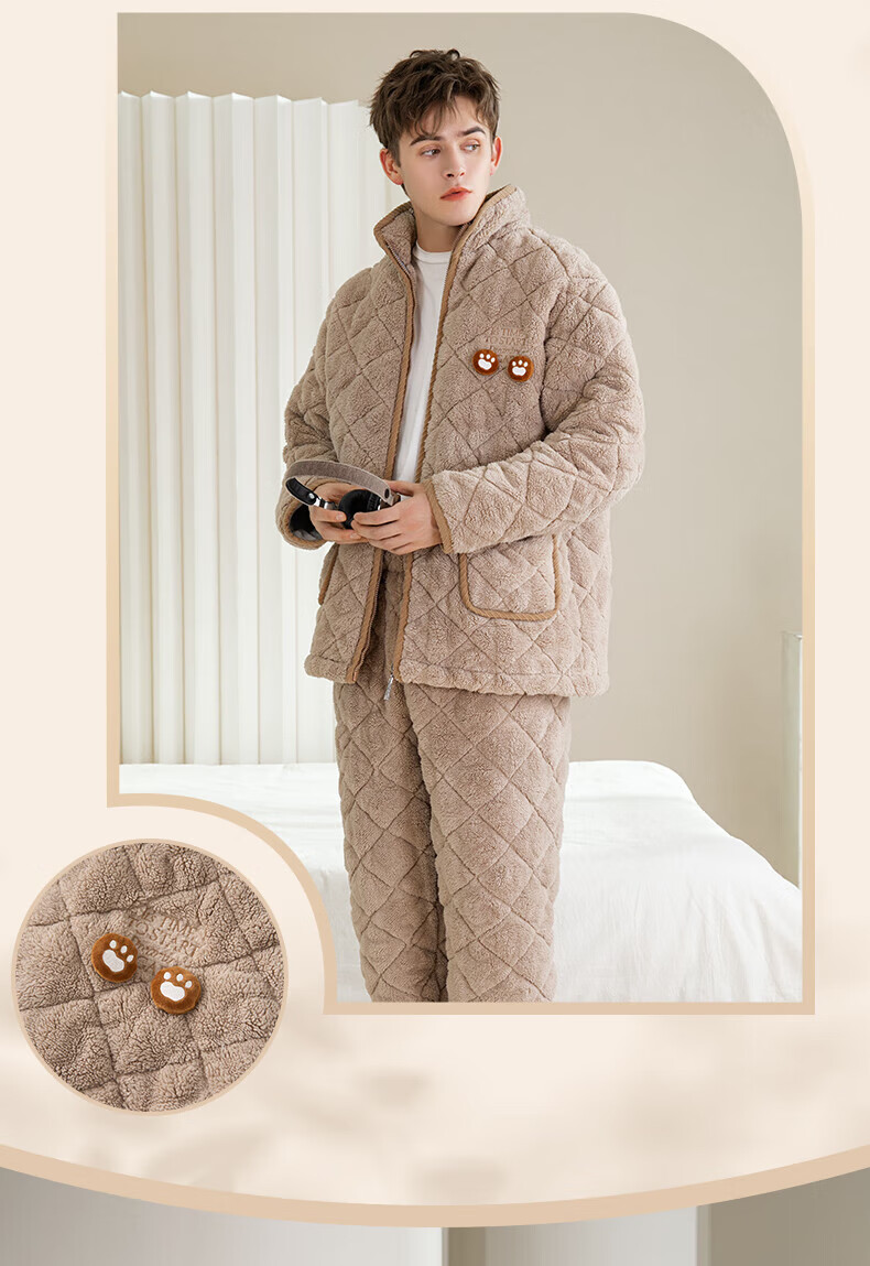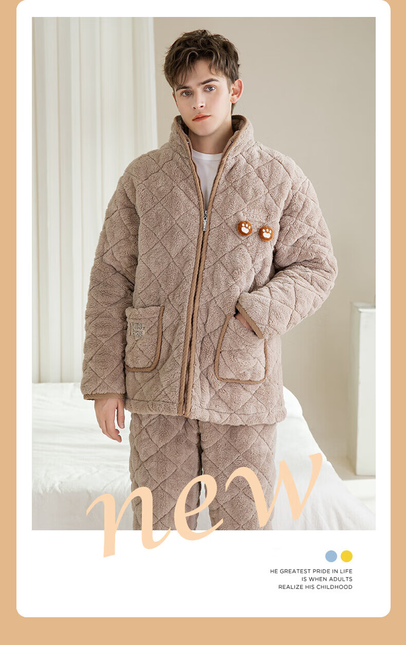 芬腾情侣睡衣三层夹棉加厚保暖卡通简约长袖翻领开衫家居服套装 卡其-男款 3XL
