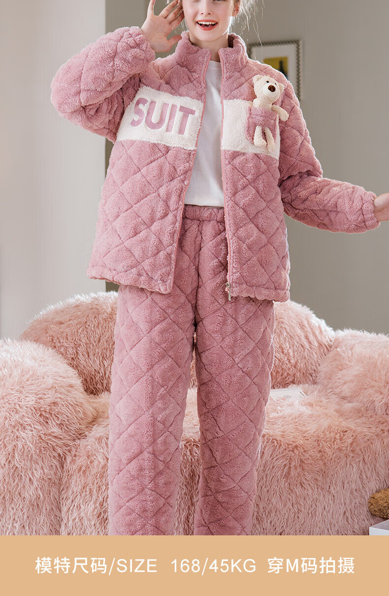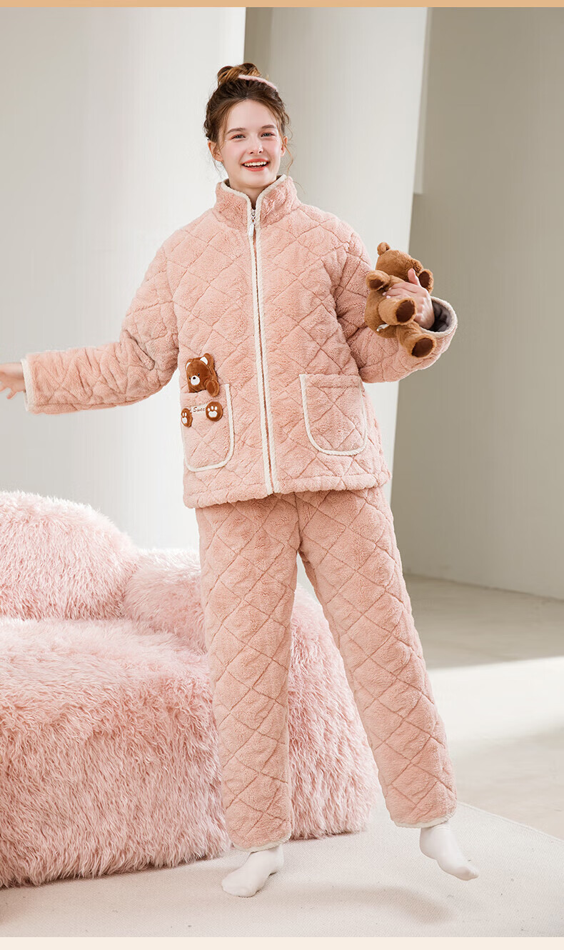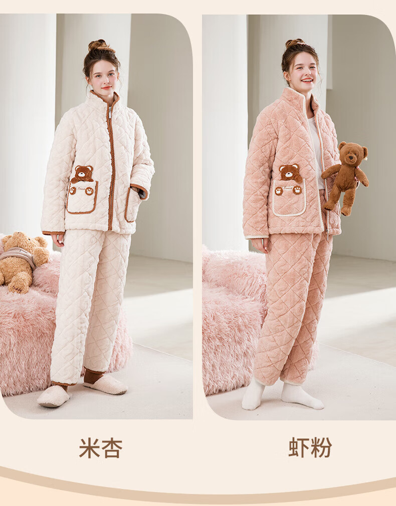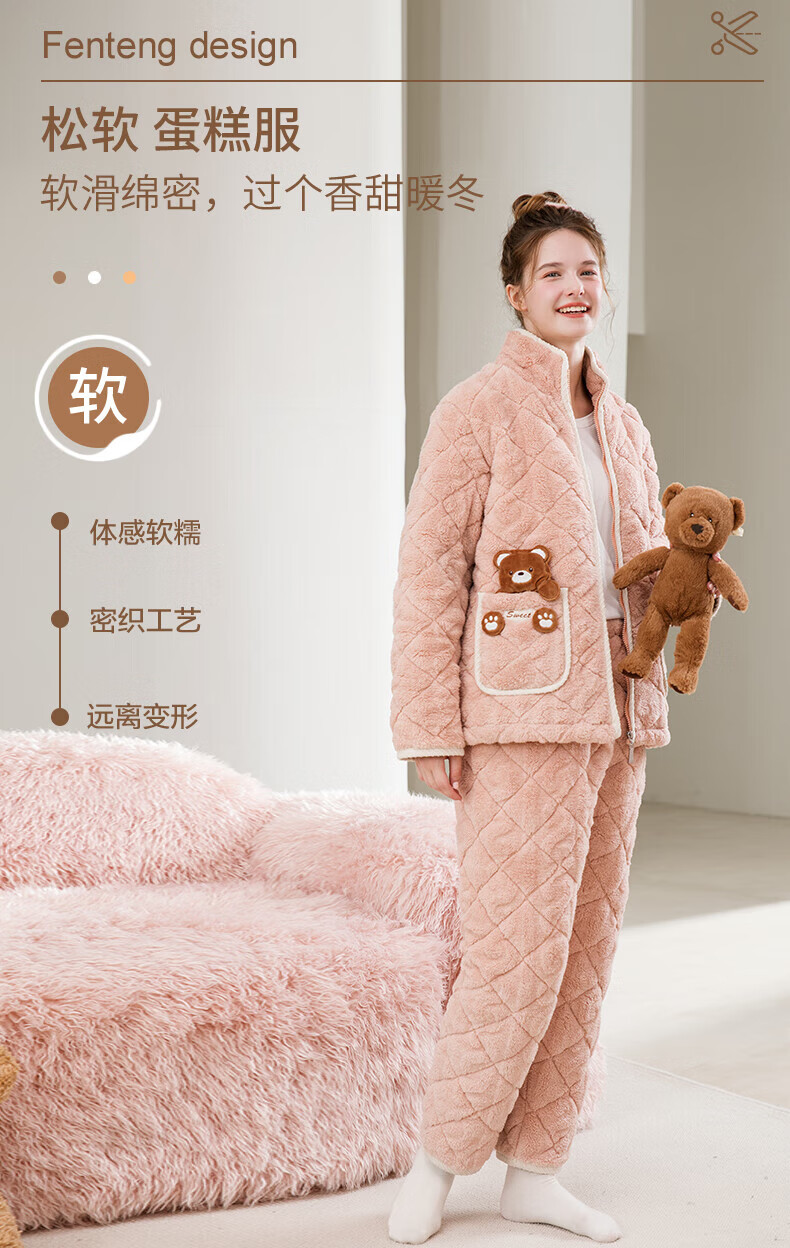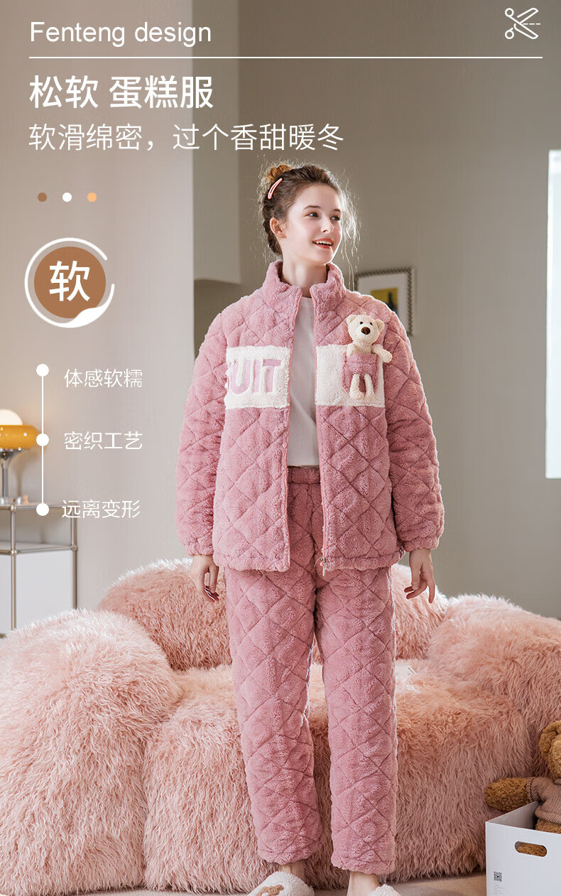 芬腾睡衣女夹棉三层加厚秋冬季温暖卡通开衫长袖家居服套装 冰兰 2XL