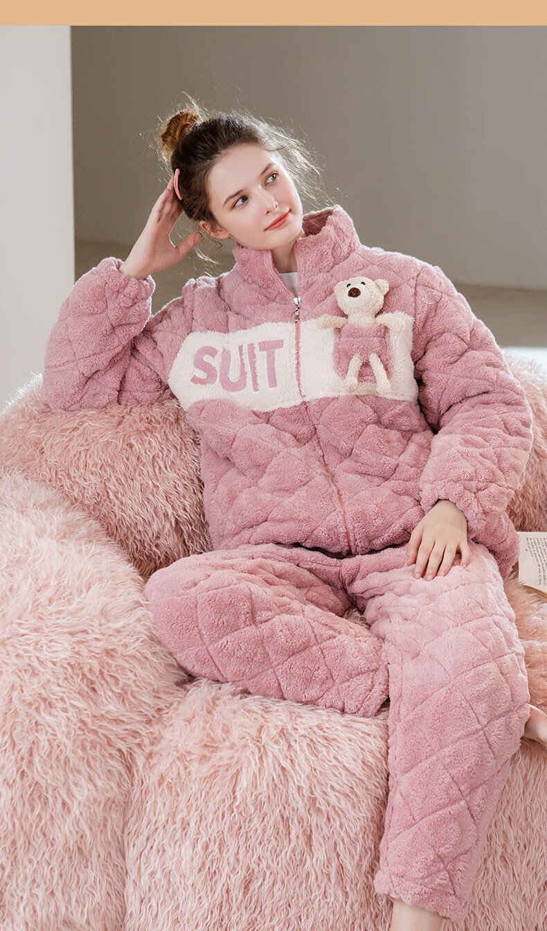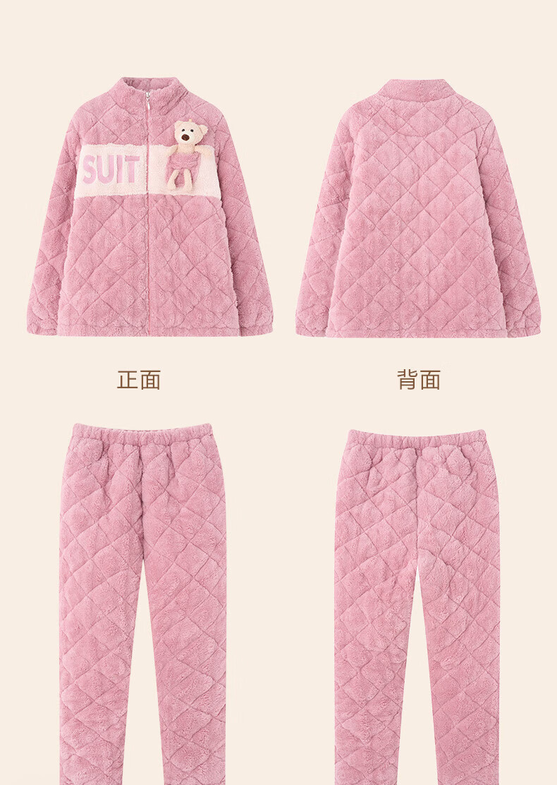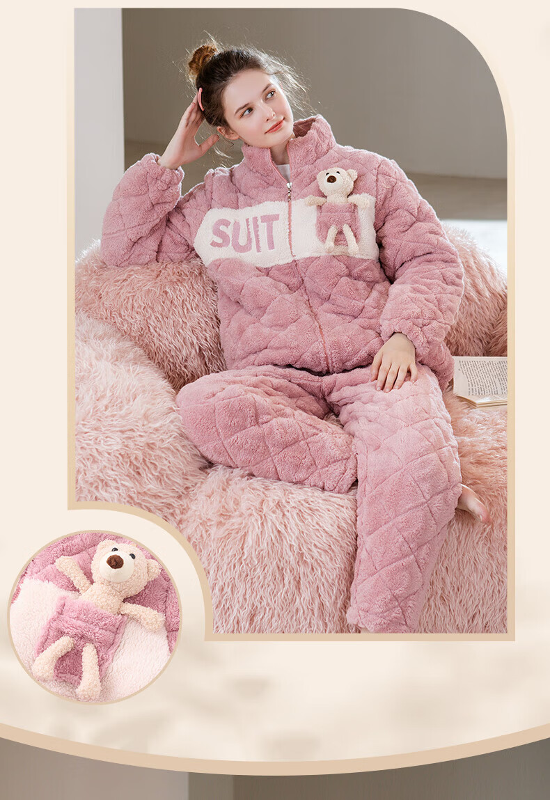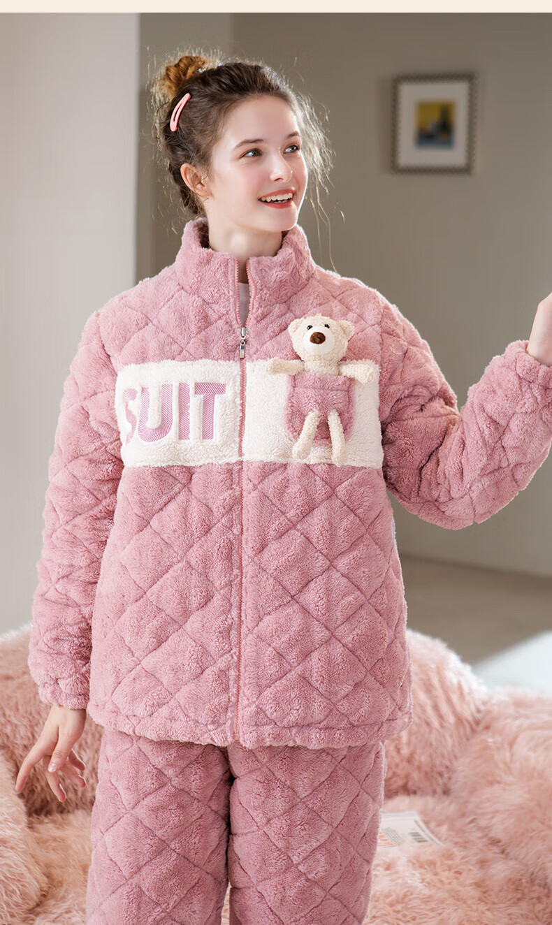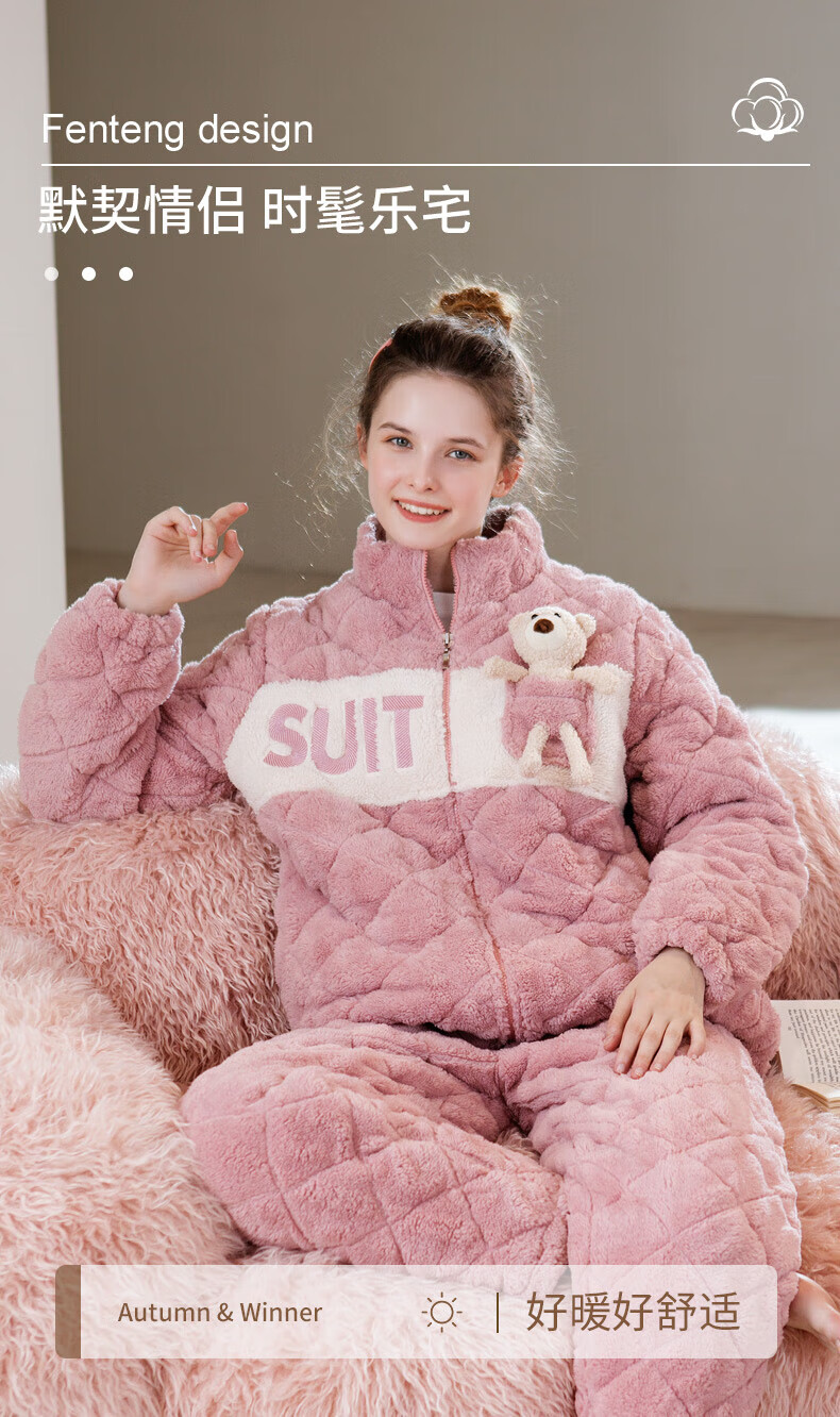 芬腾睡衣女夹棉三层加厚秋冬季温暖卡通开衫长袖家居服套装 冰兰 2XL