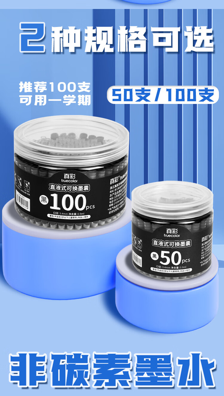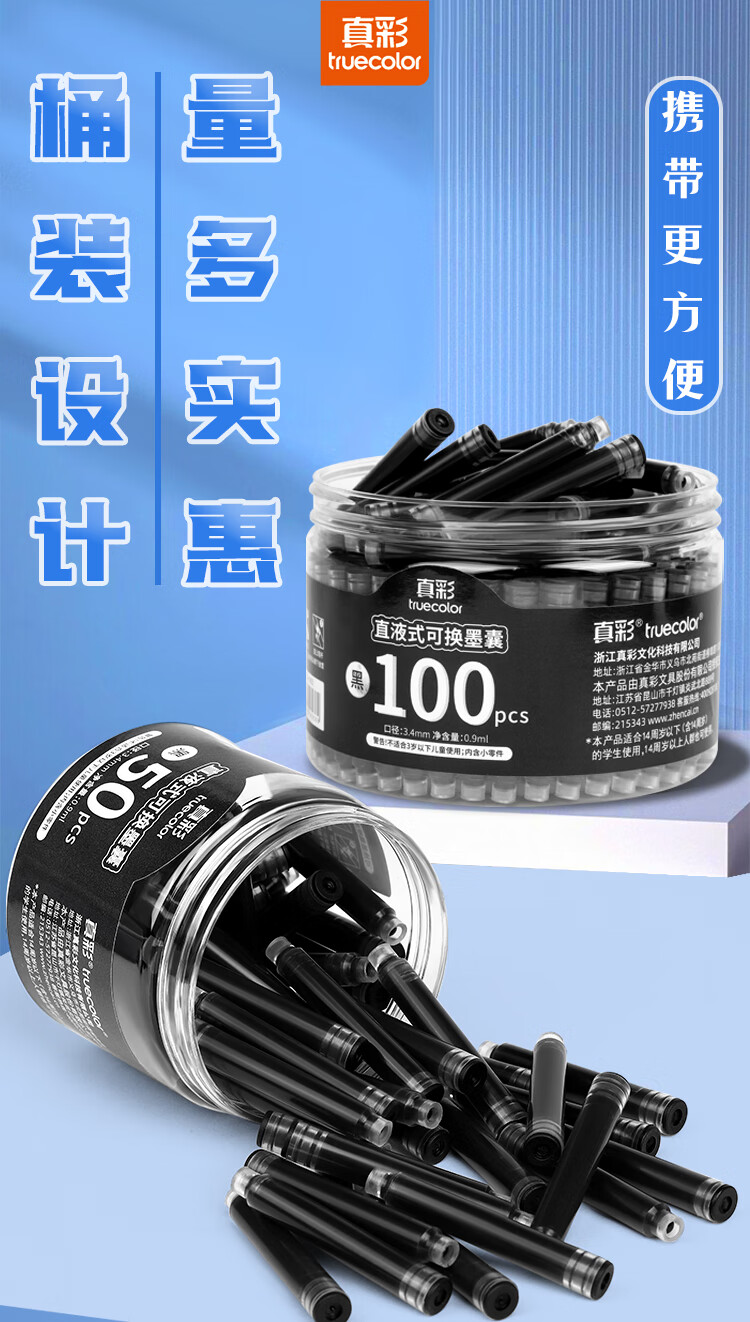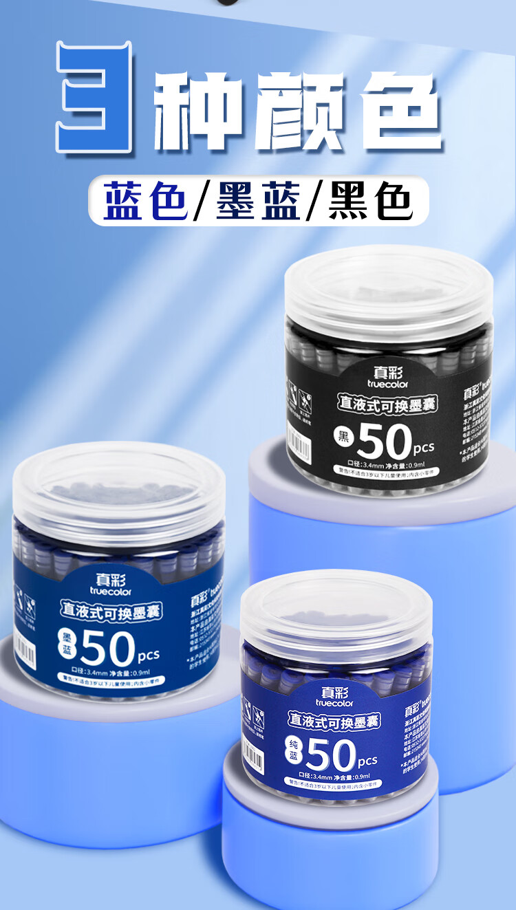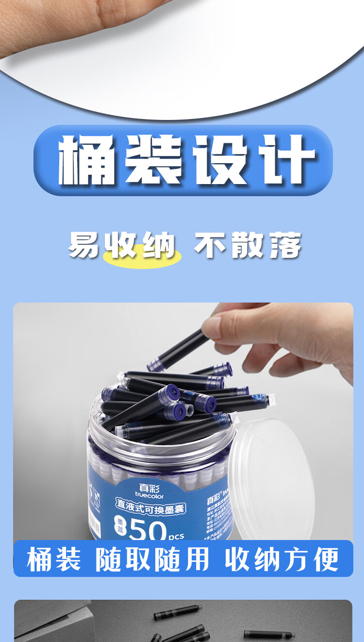 真彩(TRUECOLOR)钢笔墨囊小学生专用三年级通用可替换囊式墨水替换芯练字蓝色3.4mm口径不可擦50支桶装ZCW-1061B