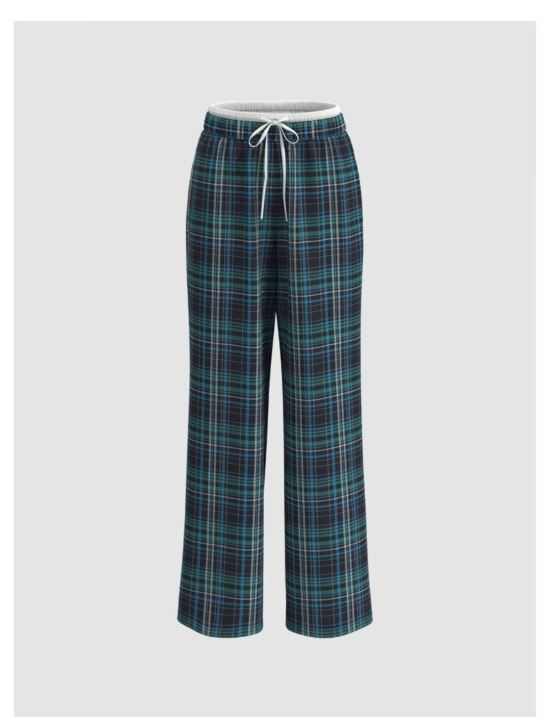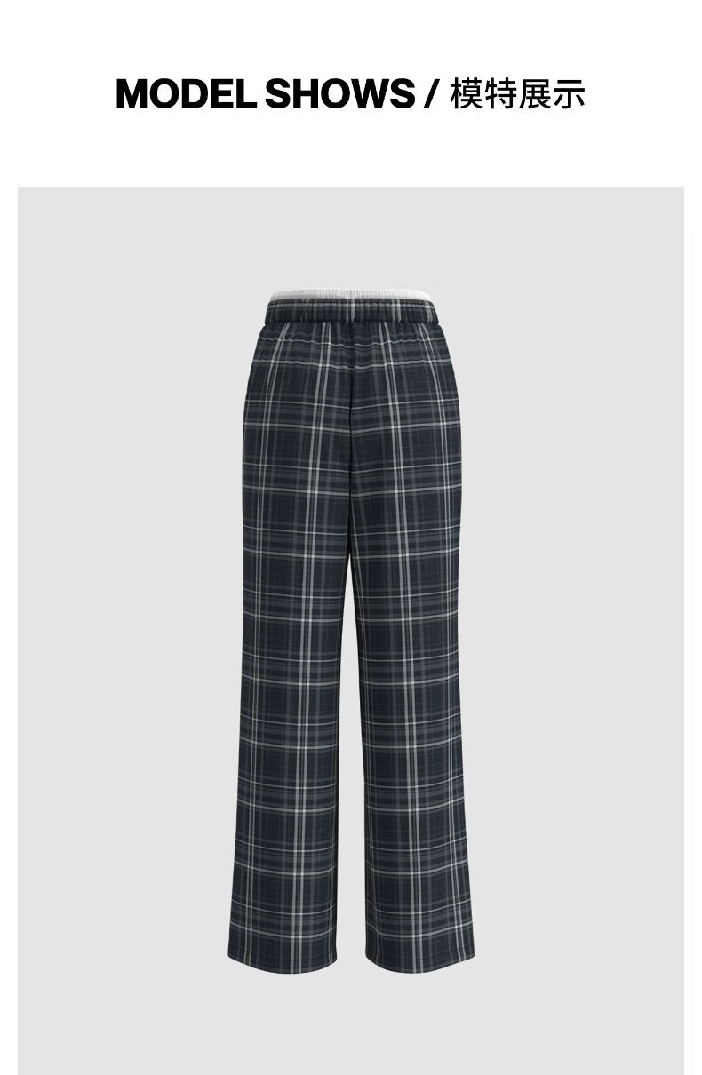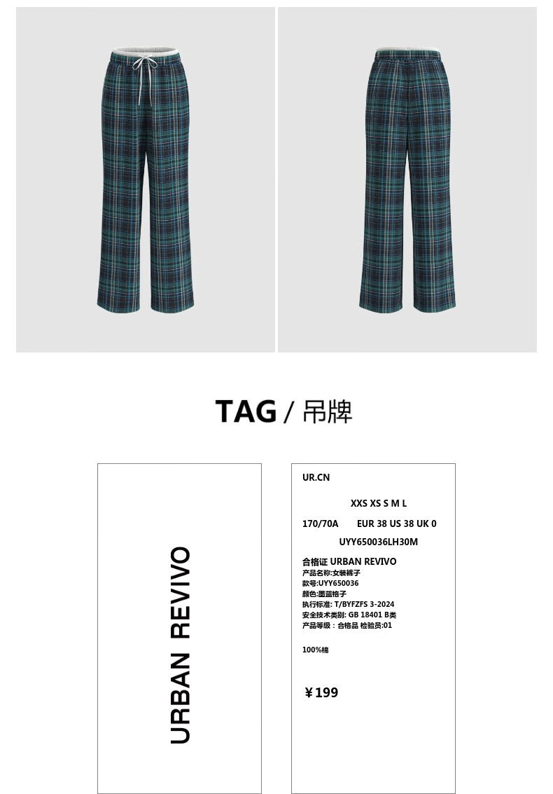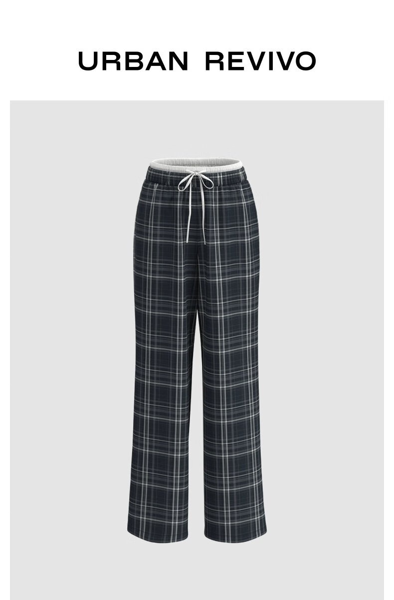 UR2025春季新款女装拼接腰头抽绳撞色格纹直筒裤UYY650036