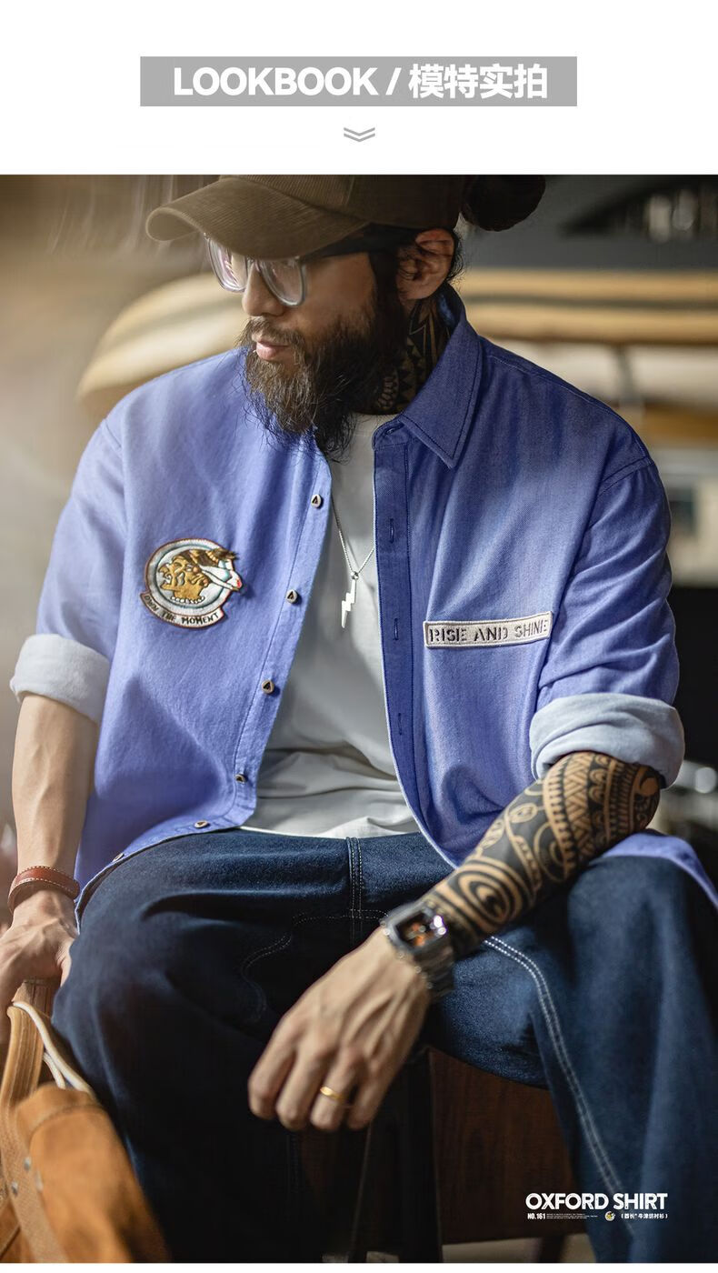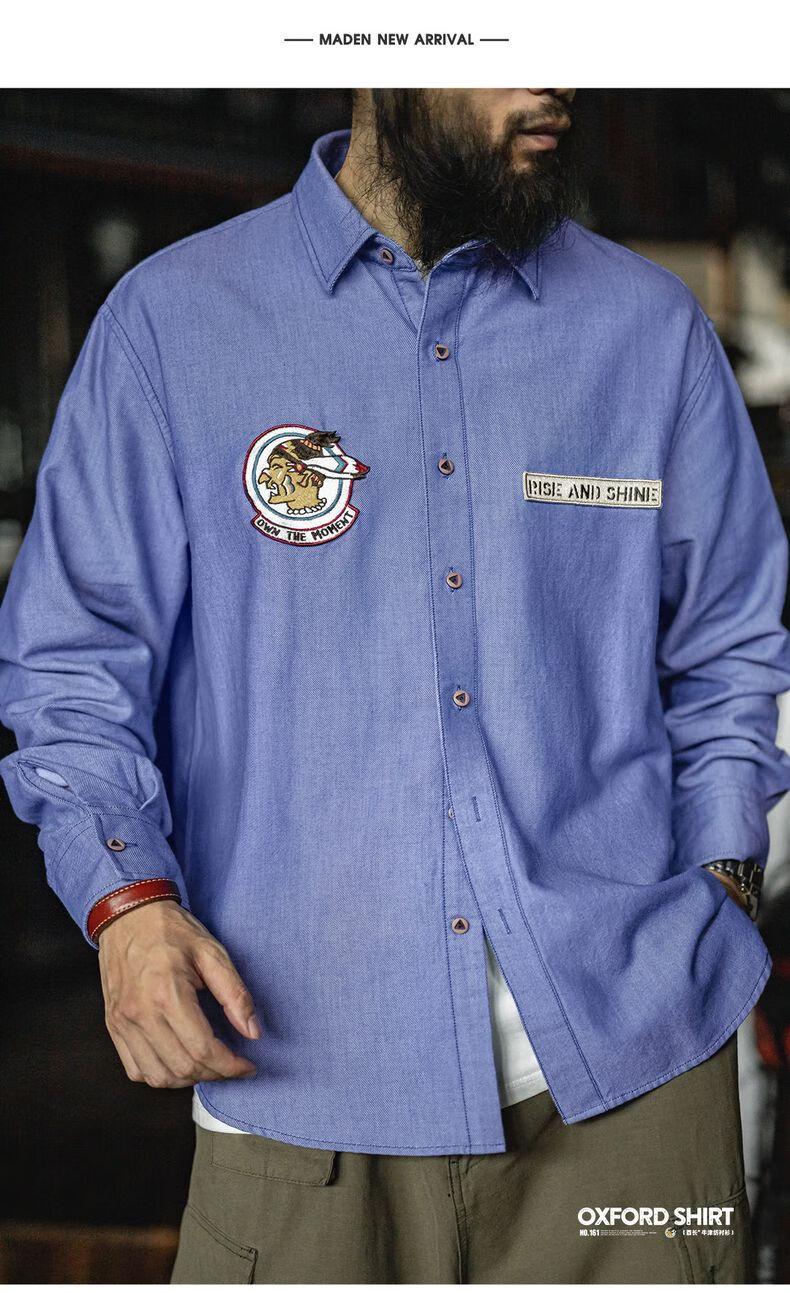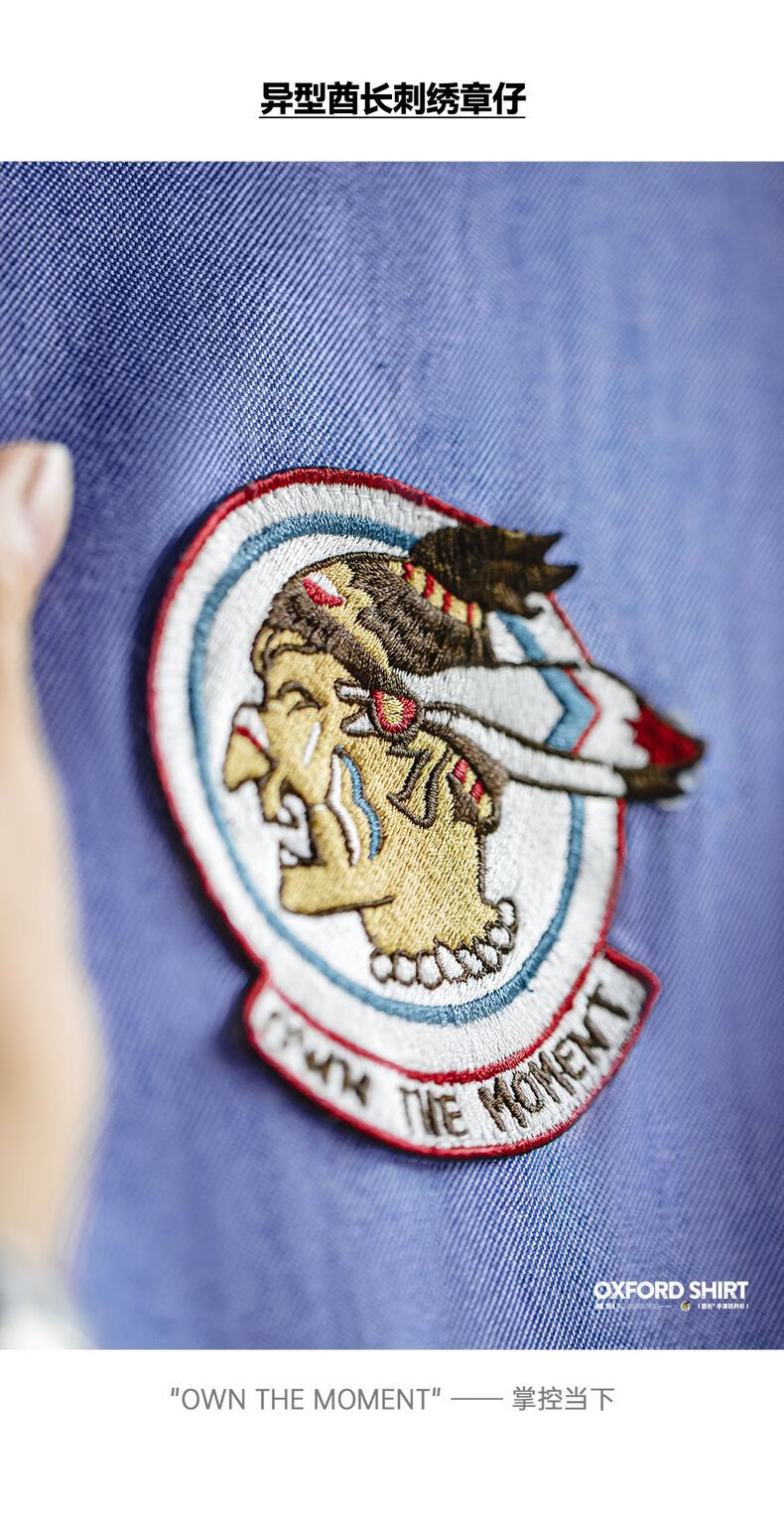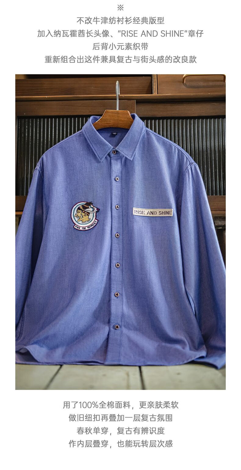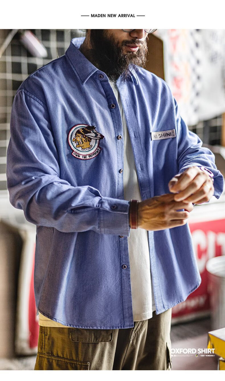 马登工装美式休闲牛津纺长袖衬衫男刺绣章仔纯棉男士衬衣外套秋季薄款 牛津蓝 L