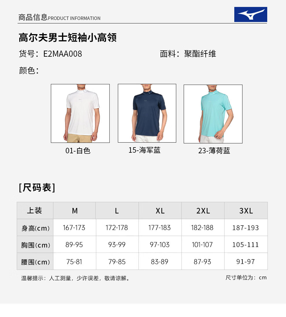 美津浓(MIZUNO)高尔夫服装男士夏季圆领短袖透气排汗golf运动休闲T恤 E2MAA008-15 海军蓝 L