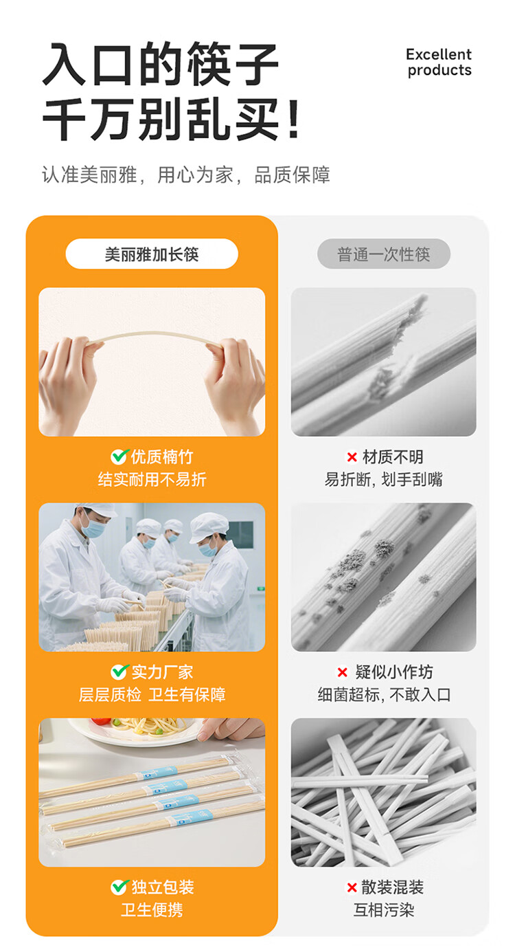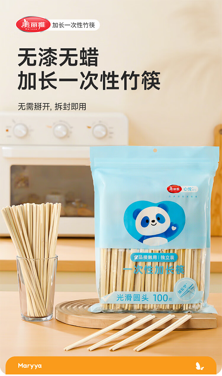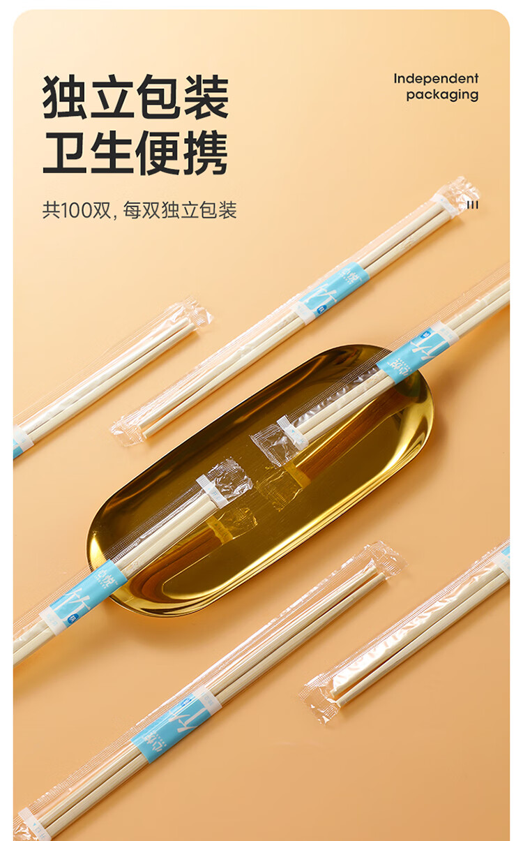 美丽雅一次性筷子 楠竹筷食品级加长独立包装家用野餐露营快餐打包餐具 【加长版】楠竹筷 100双
