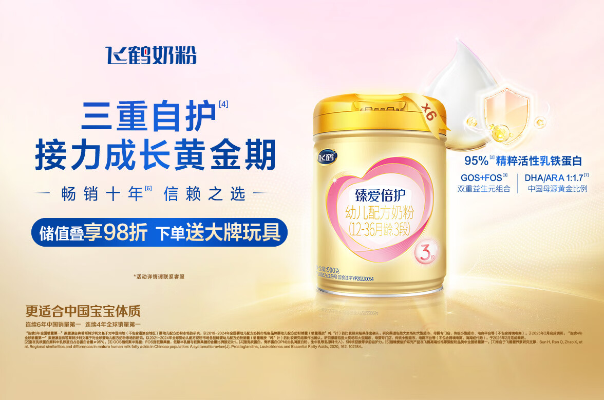 飞鹤臻爱倍护 幼儿配方奶粉3段(1-3岁) 900g*6 乳铁蛋白 育儿补贴
