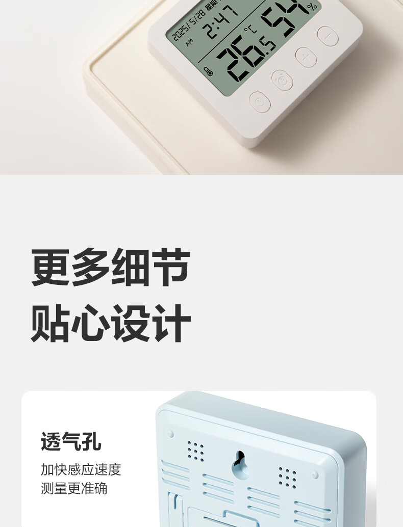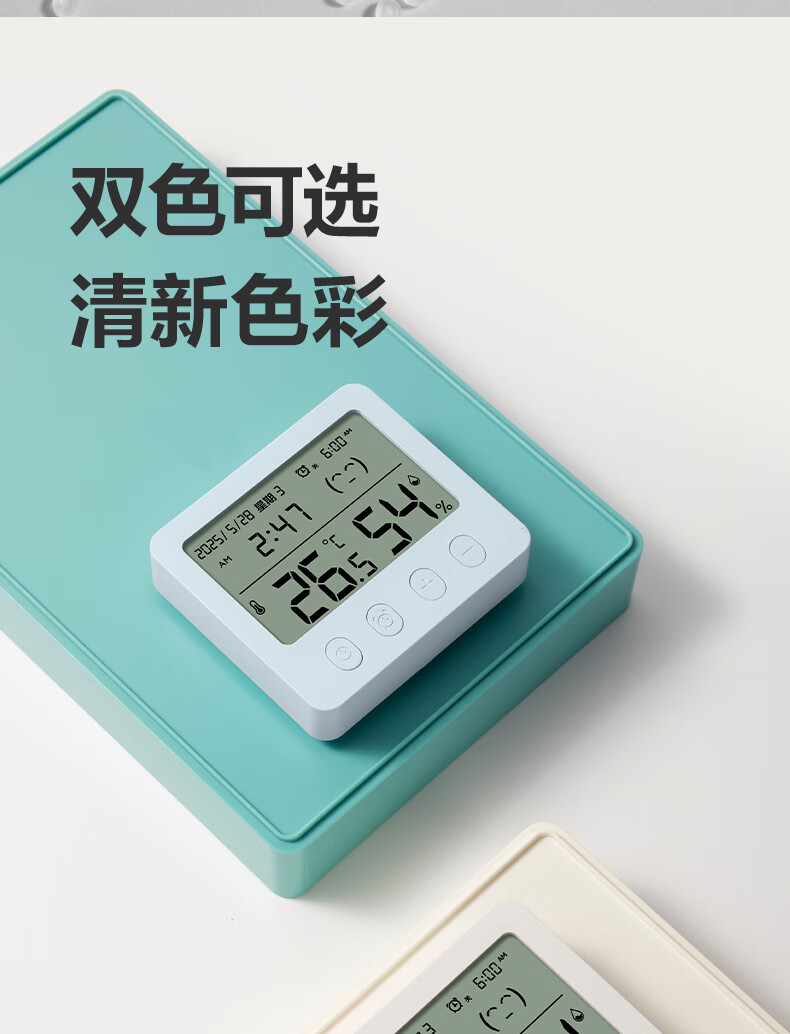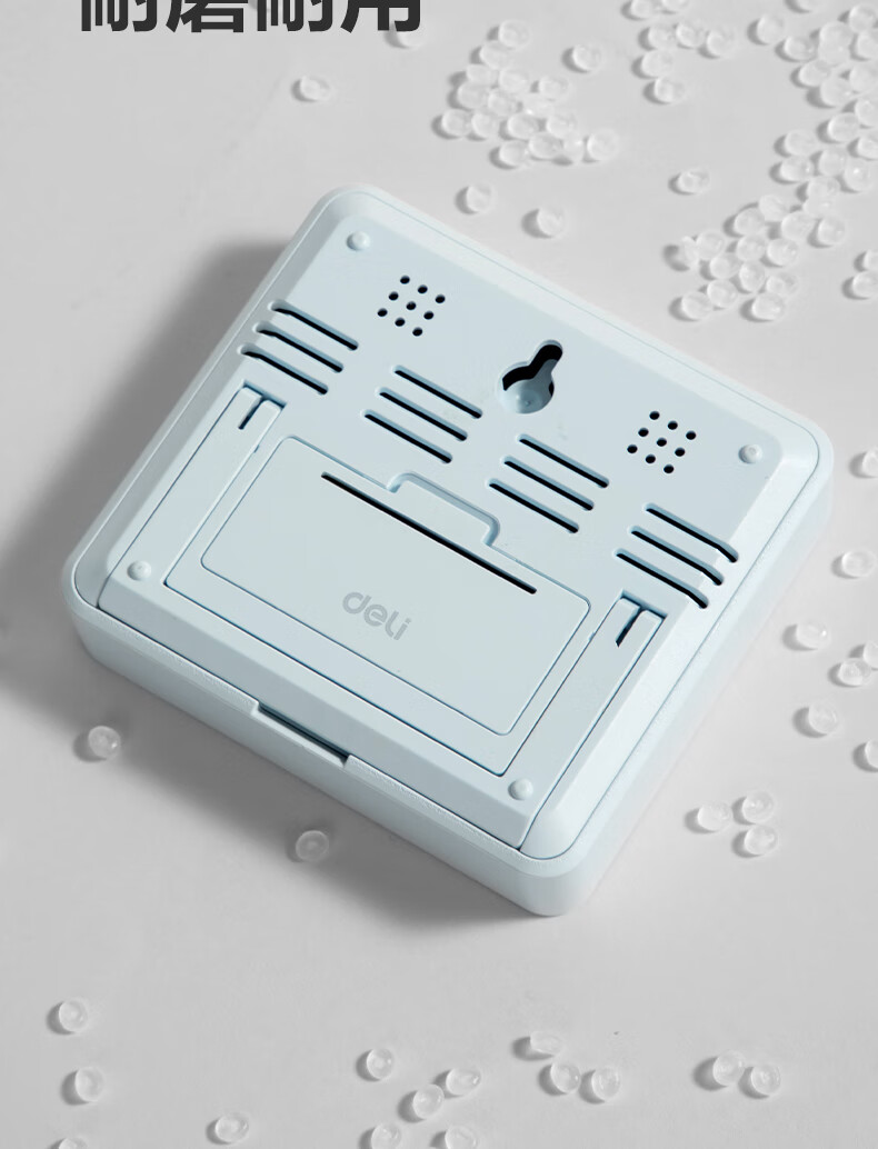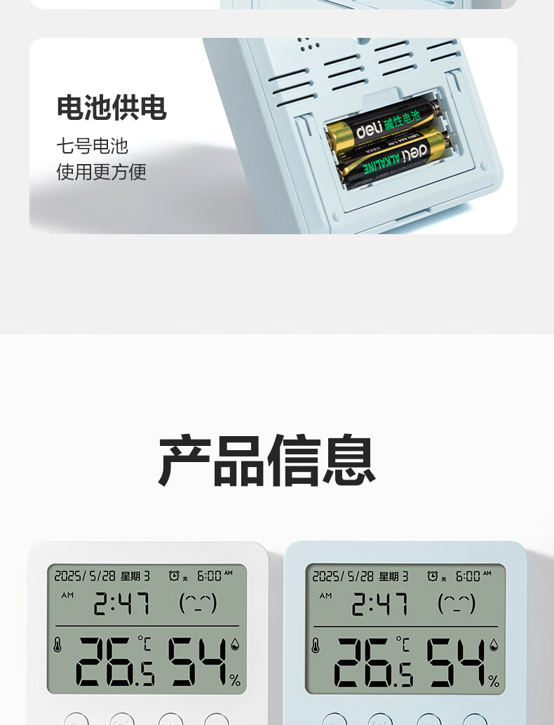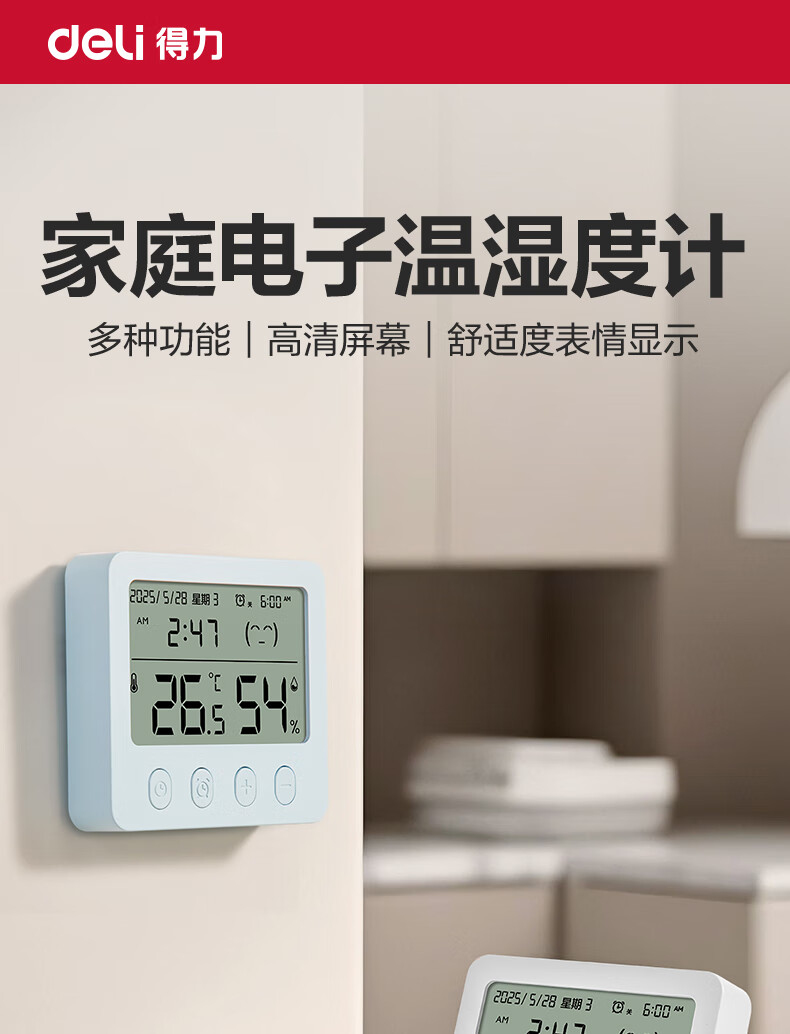 得力(deli)电子室内温湿度计闹钟叫醒背灯光婴儿房智能家居小巧高精度时间日期温湿度表天气智联测量LE525白