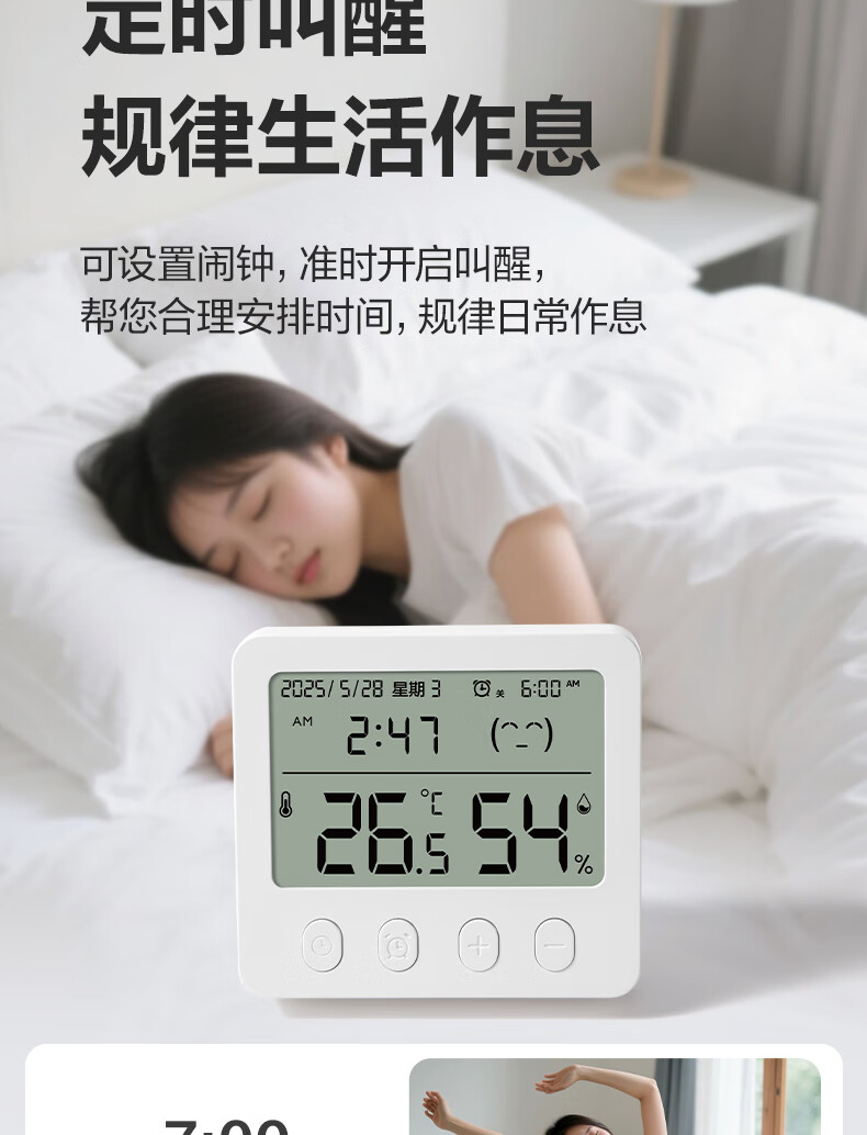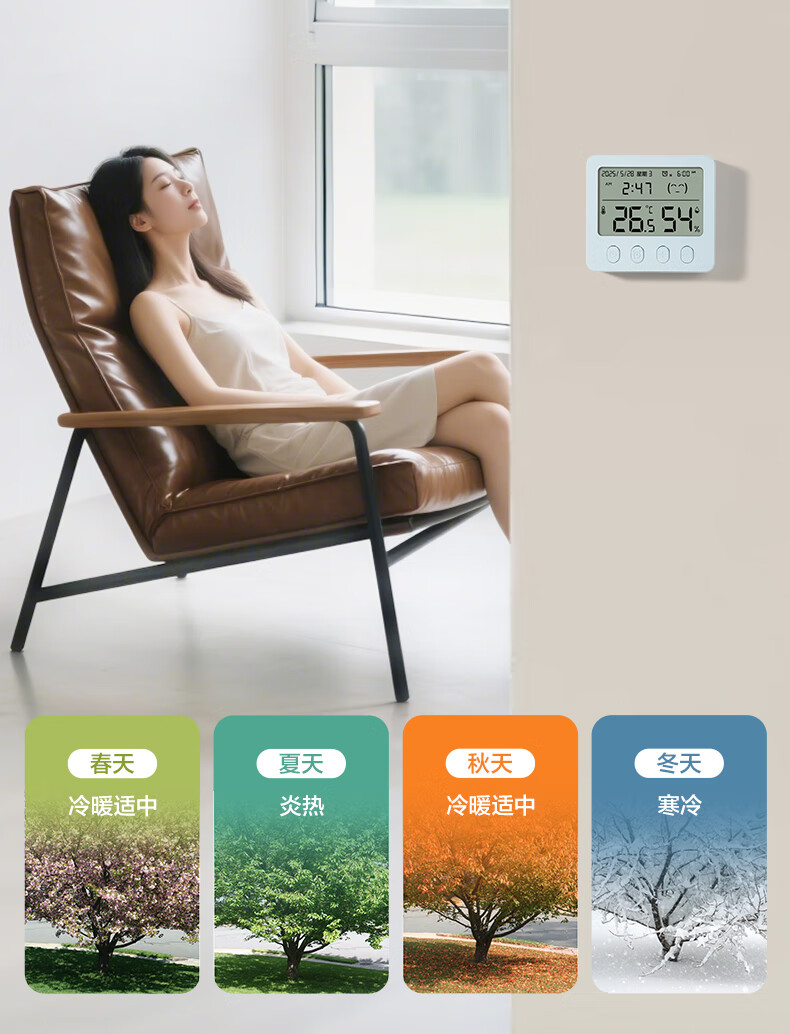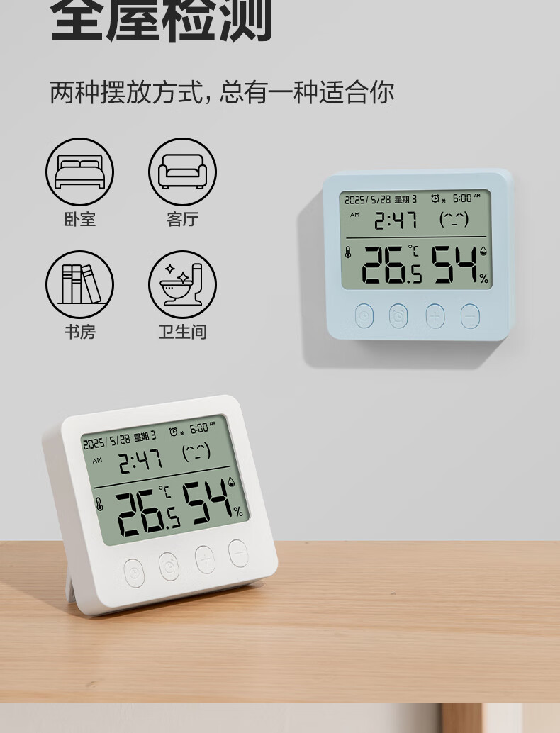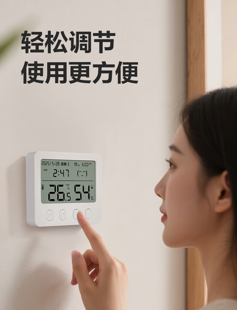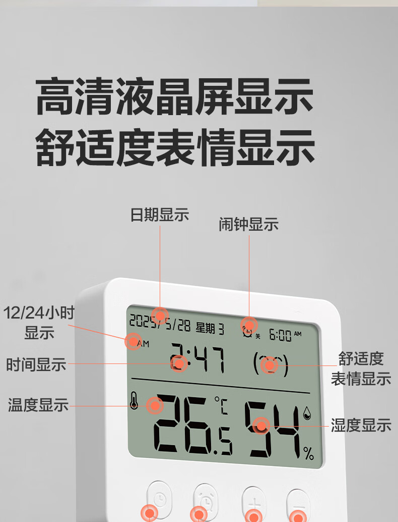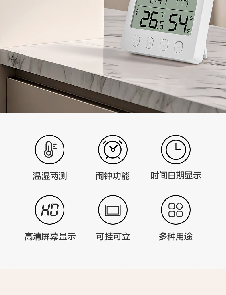 得力(deli)电子室内温湿度计闹钟叫醒背灯光婴儿房智能家居小巧高精度时间日期温湿度表天气智联测量LE525白