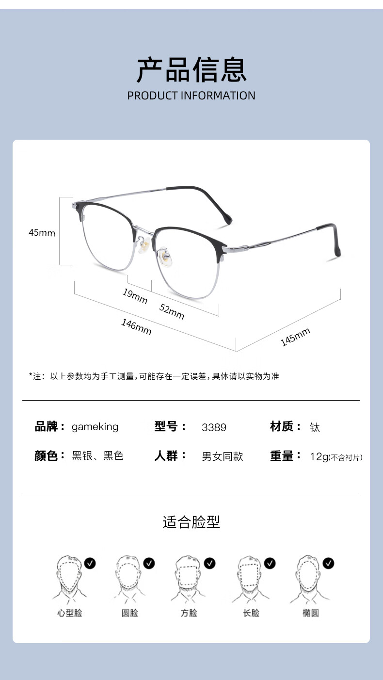 Gameking防蓝光眼镜防辐射男女平光护目可配度数超轻近视眼镜架 3389开学