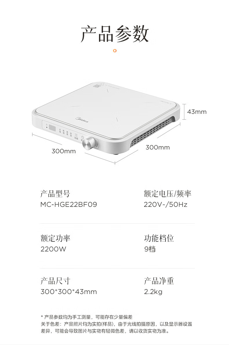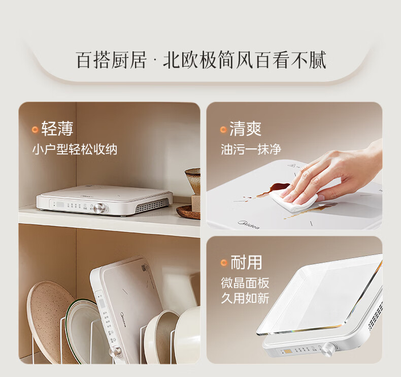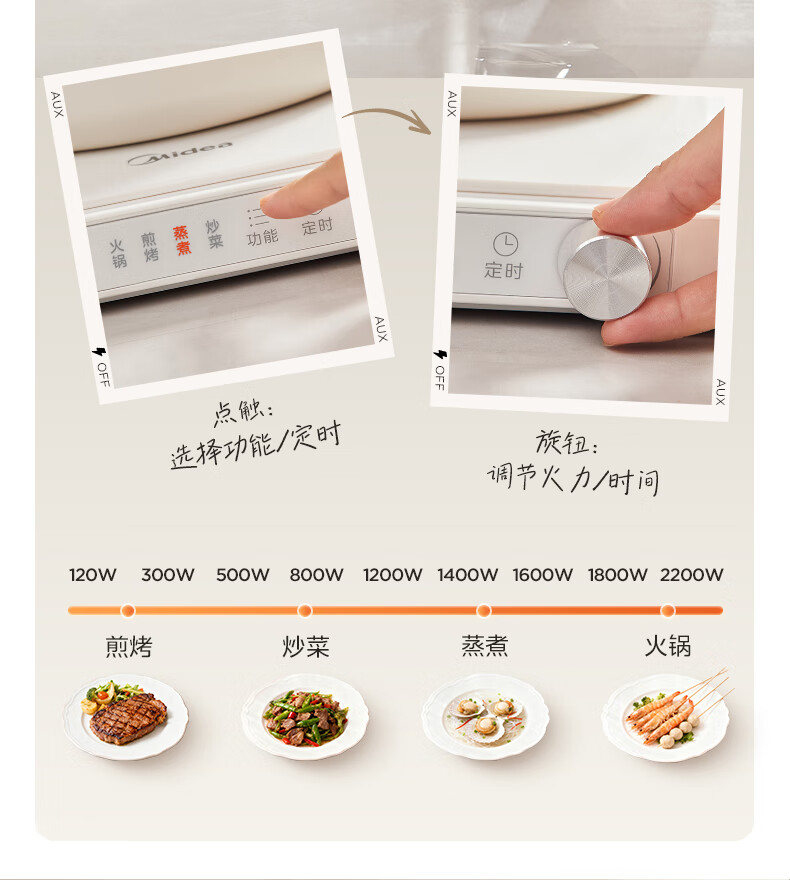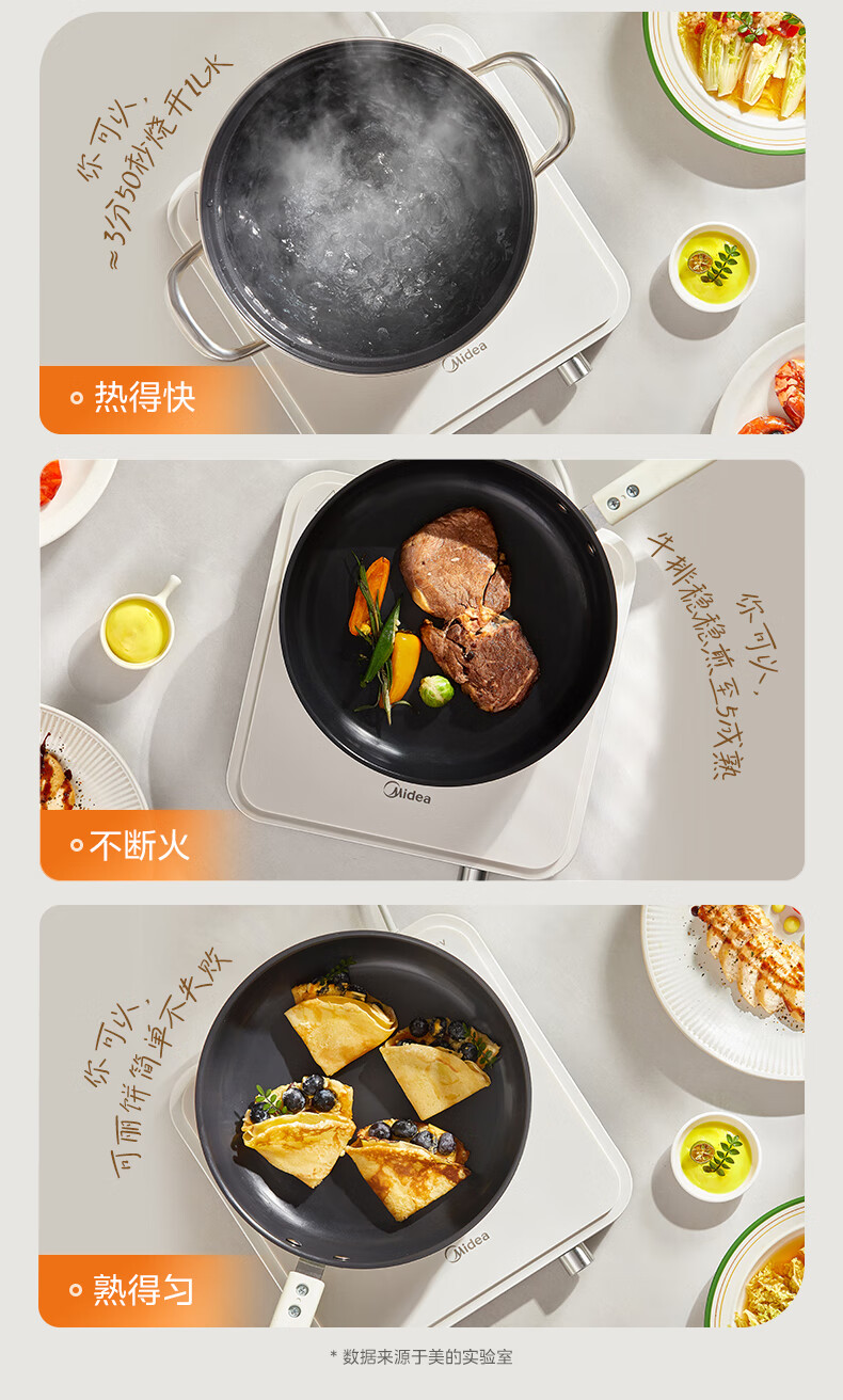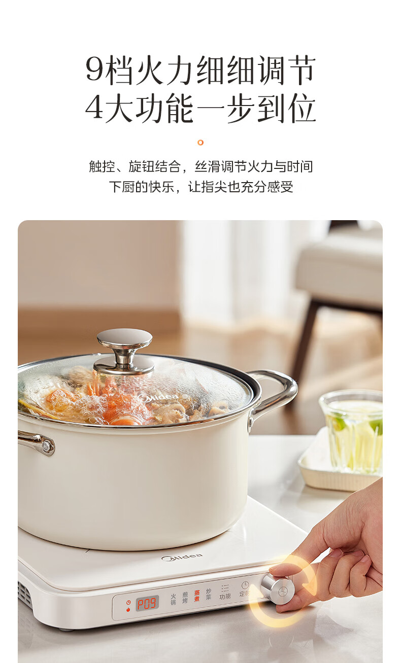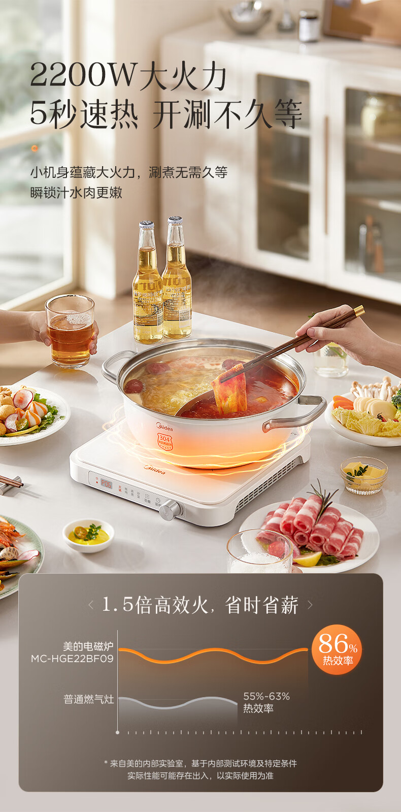 美的(Midea)家用电磁炉电陶炉电池炉2200W大功率猛火新型电磁灶一体微晶面板爆炒炒菜定时火锅炉MC-HGE22BF09