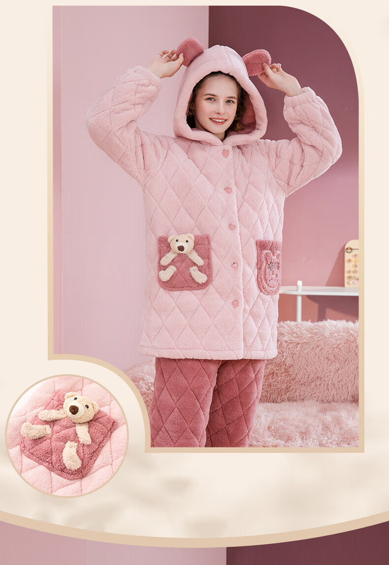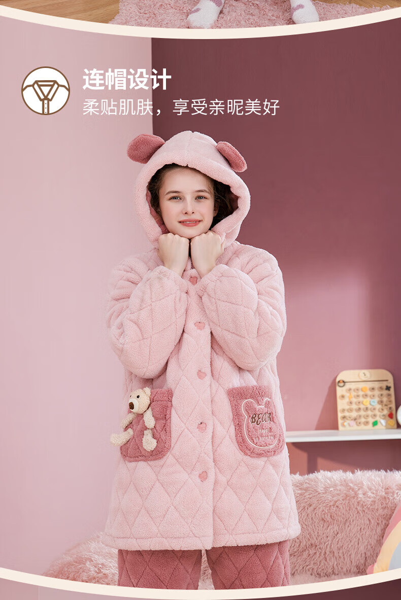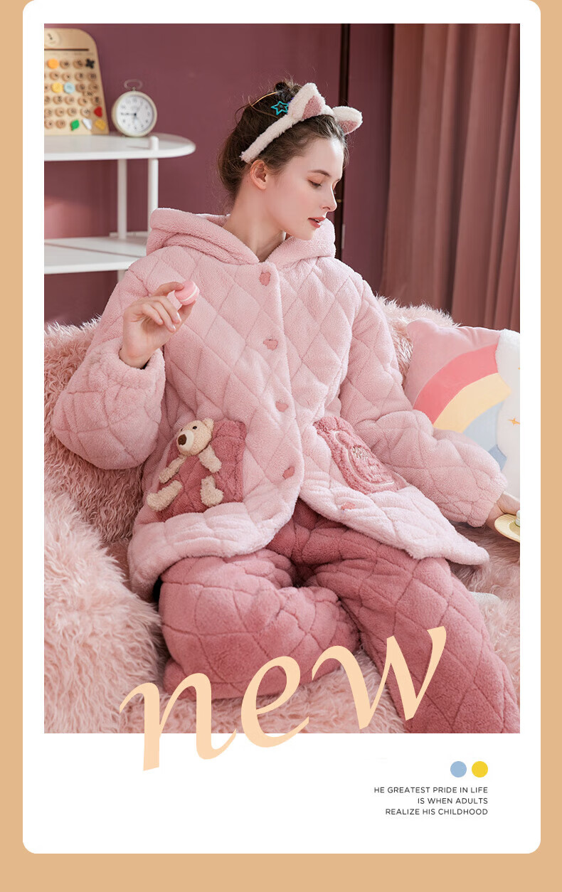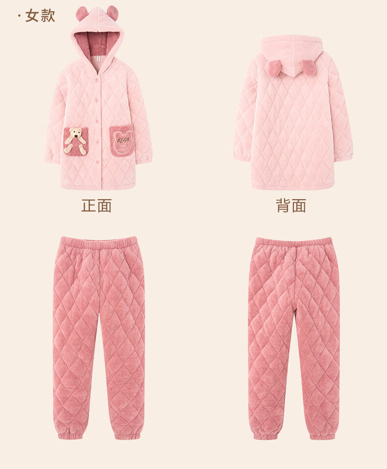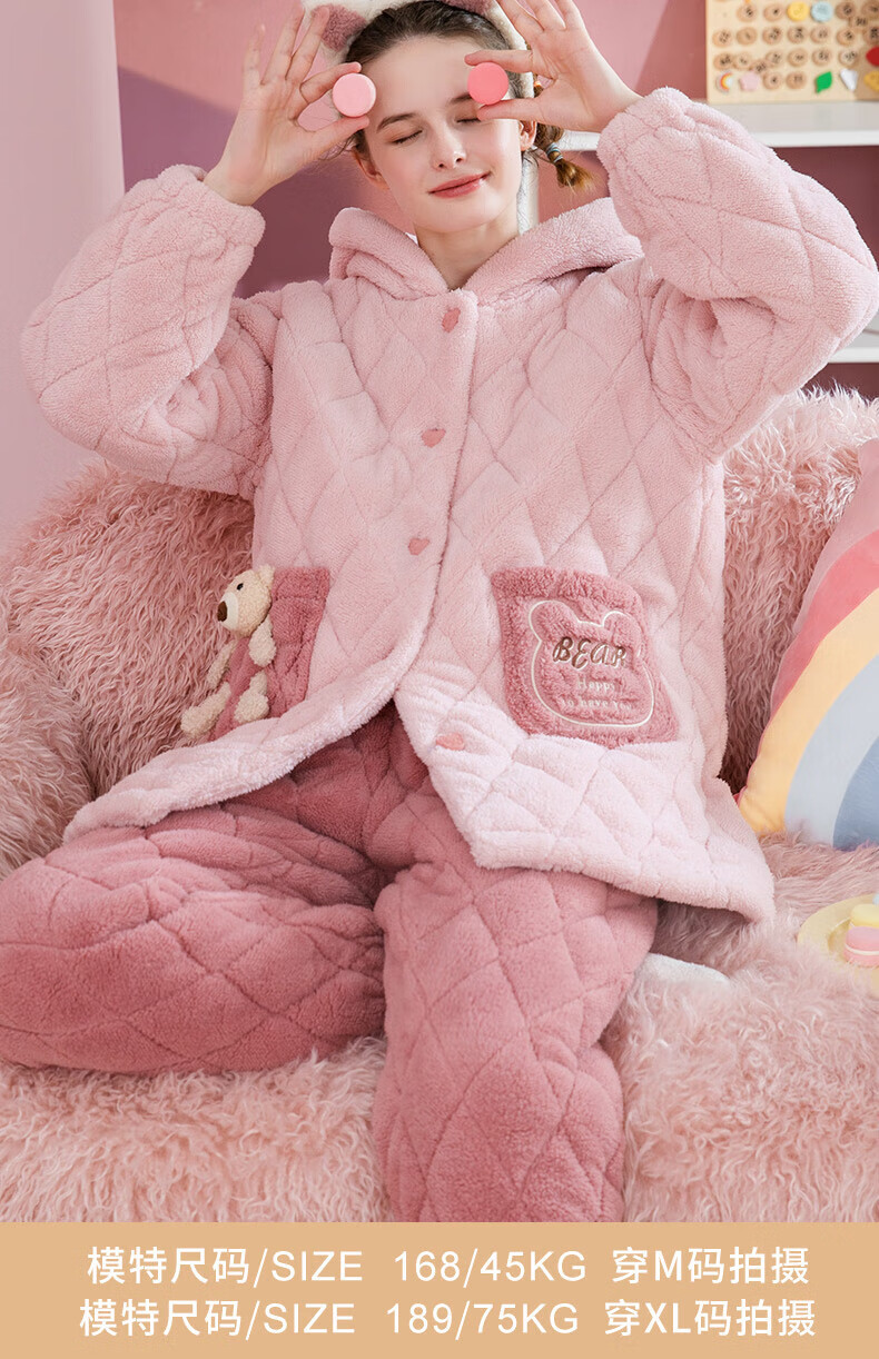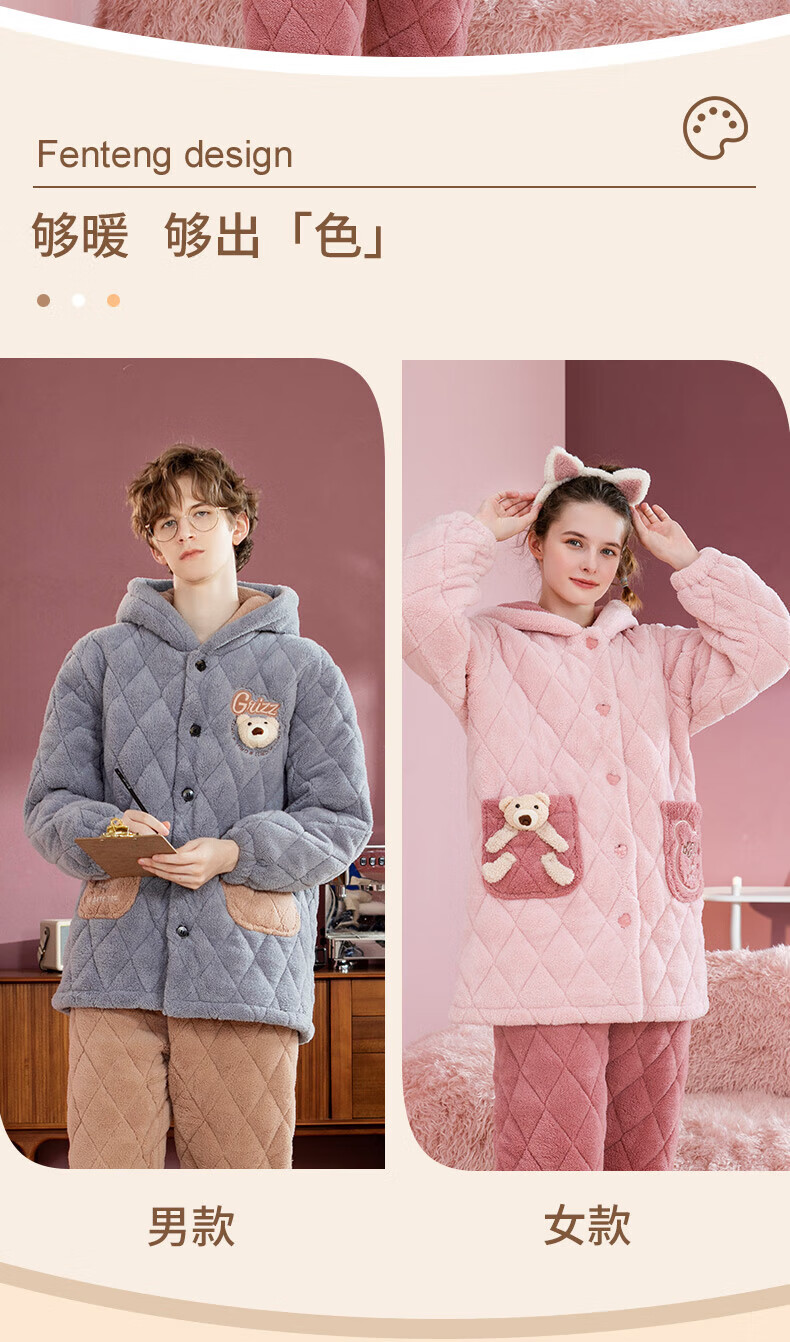 芬腾情侣睡衣冬季长袖新款三层夹棉加厚珊瑚绒家居服套装 樱花粉(女) S