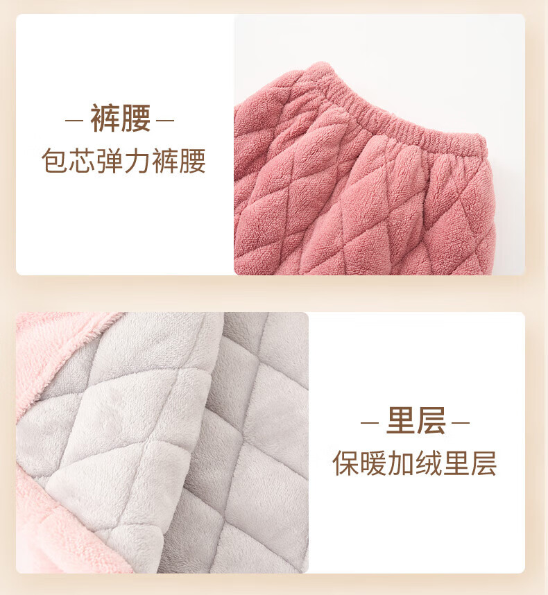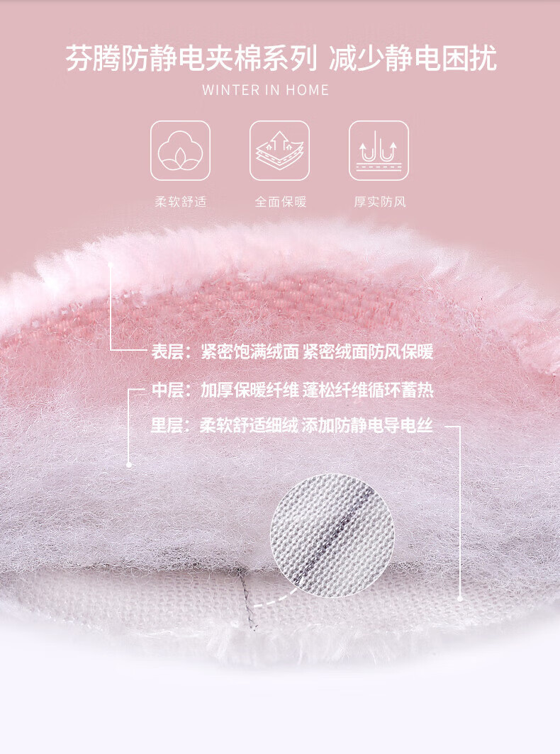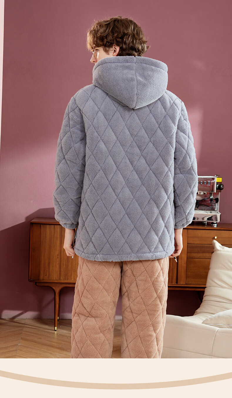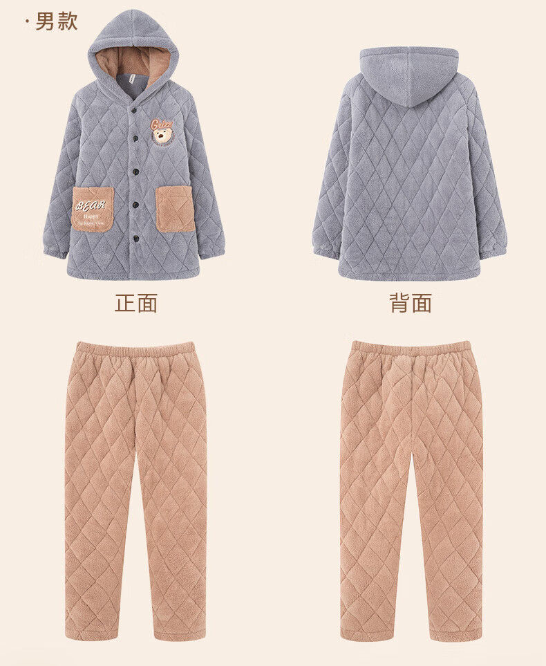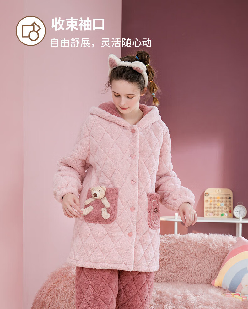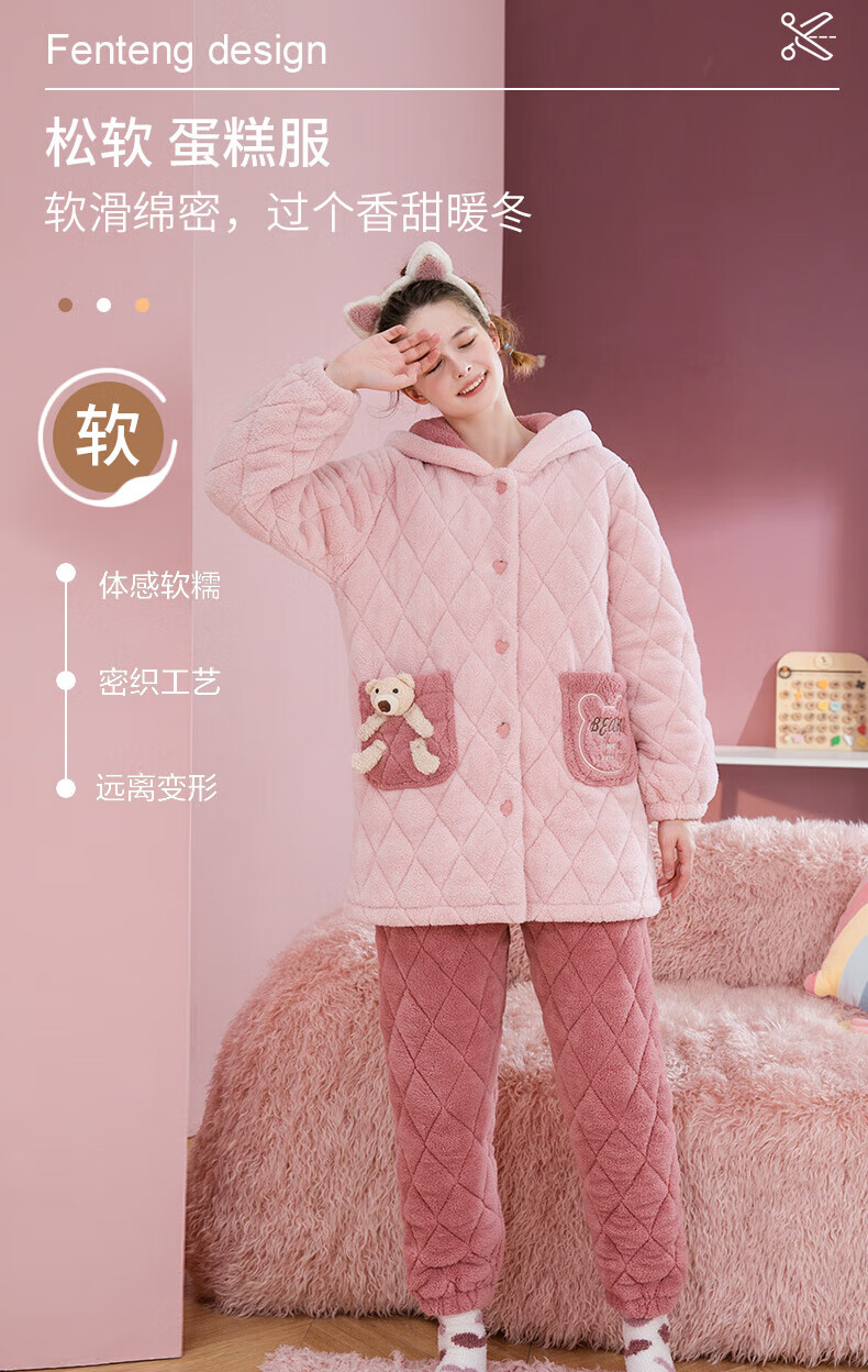 芬腾情侣睡衣冬季长袖新款三层夹棉加厚珊瑚绒家居服套装 樱花粉(女) S