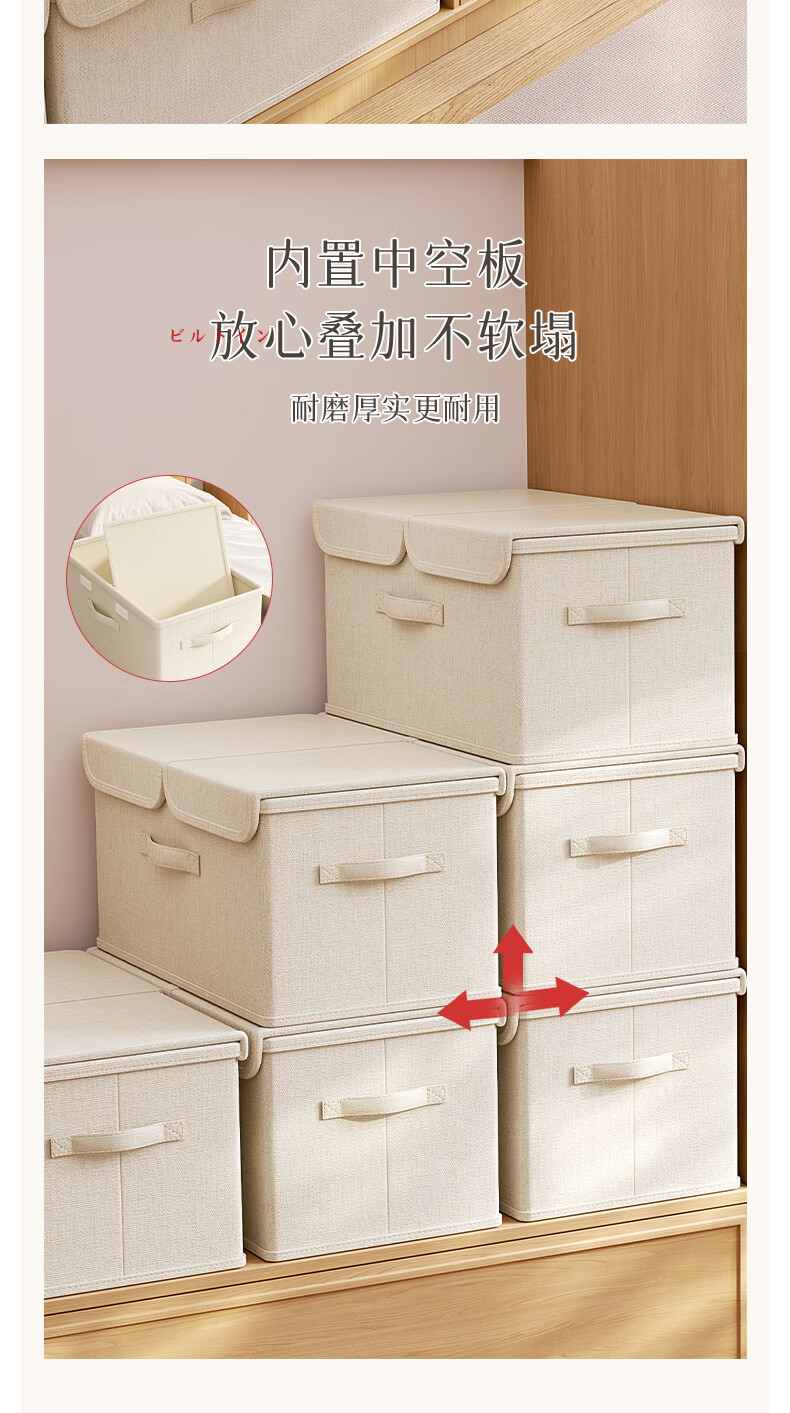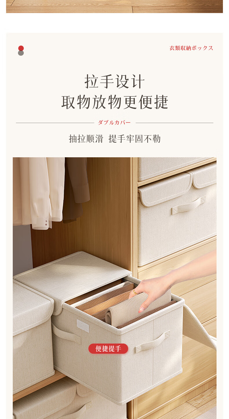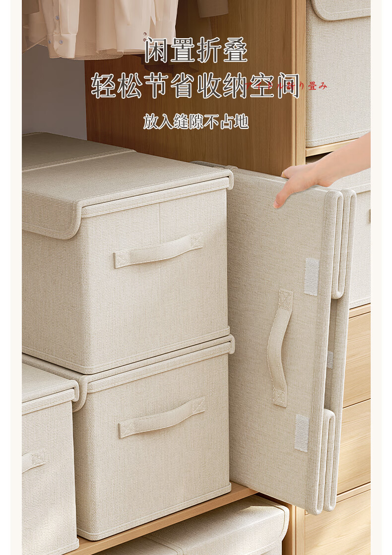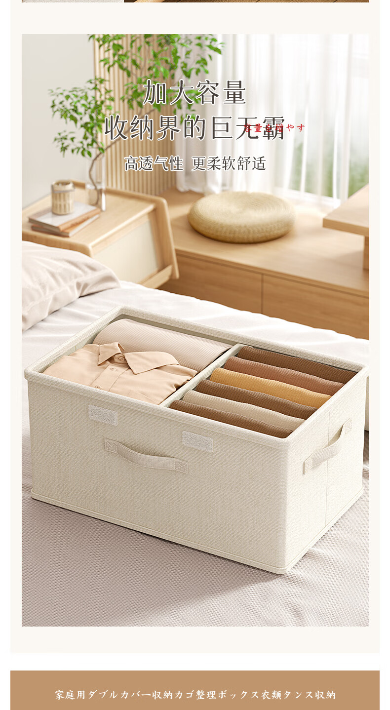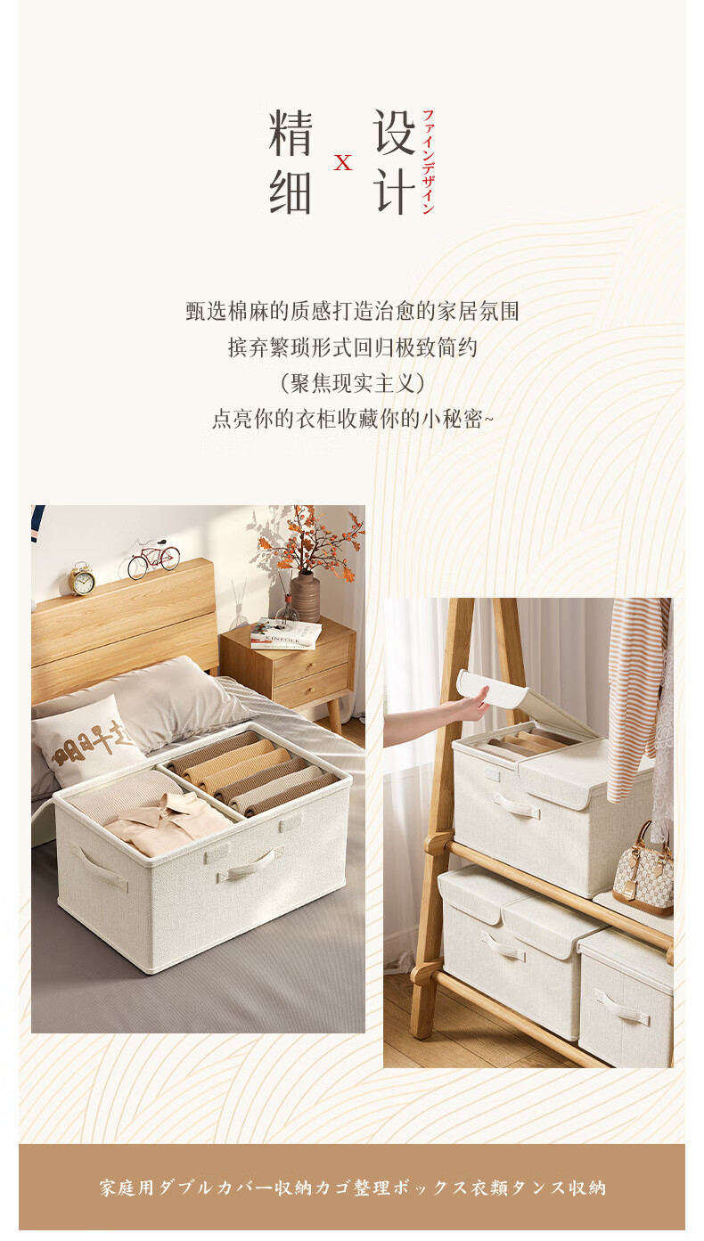 邦尼美家带盖衣物收纳盒天山棉麻衣服裤子双层整理盒衣柜收纳可折叠储物盒 米色-中号【双盖 可水洗】 放心购(甄选天山棉麻材质)