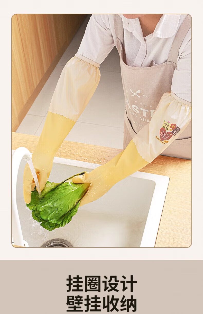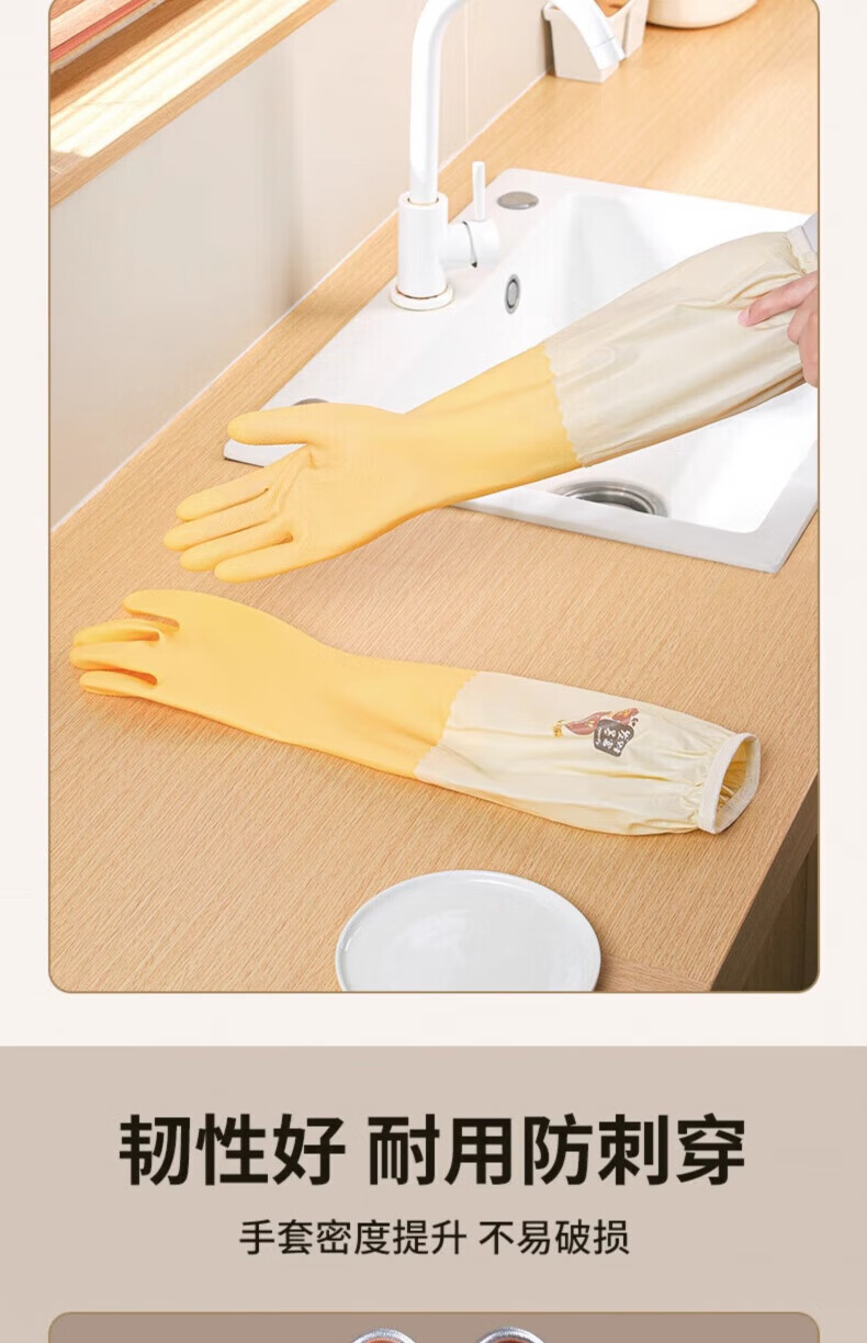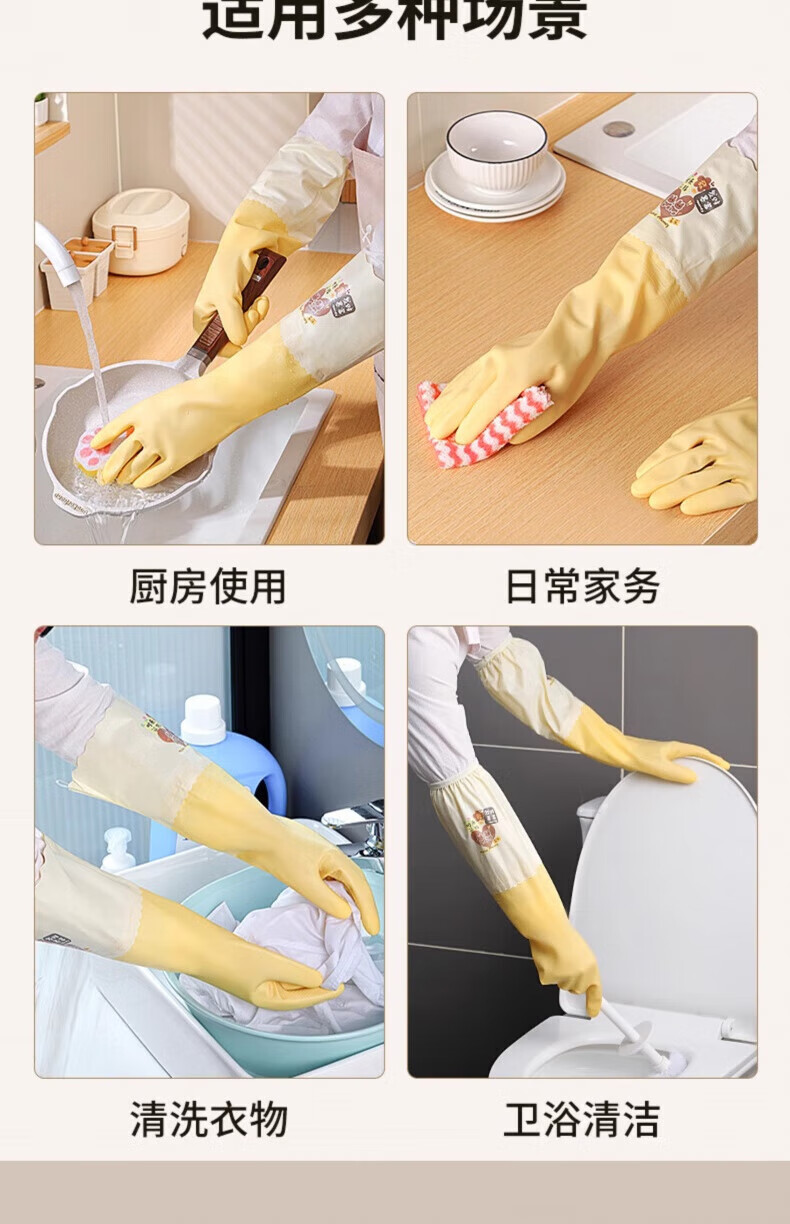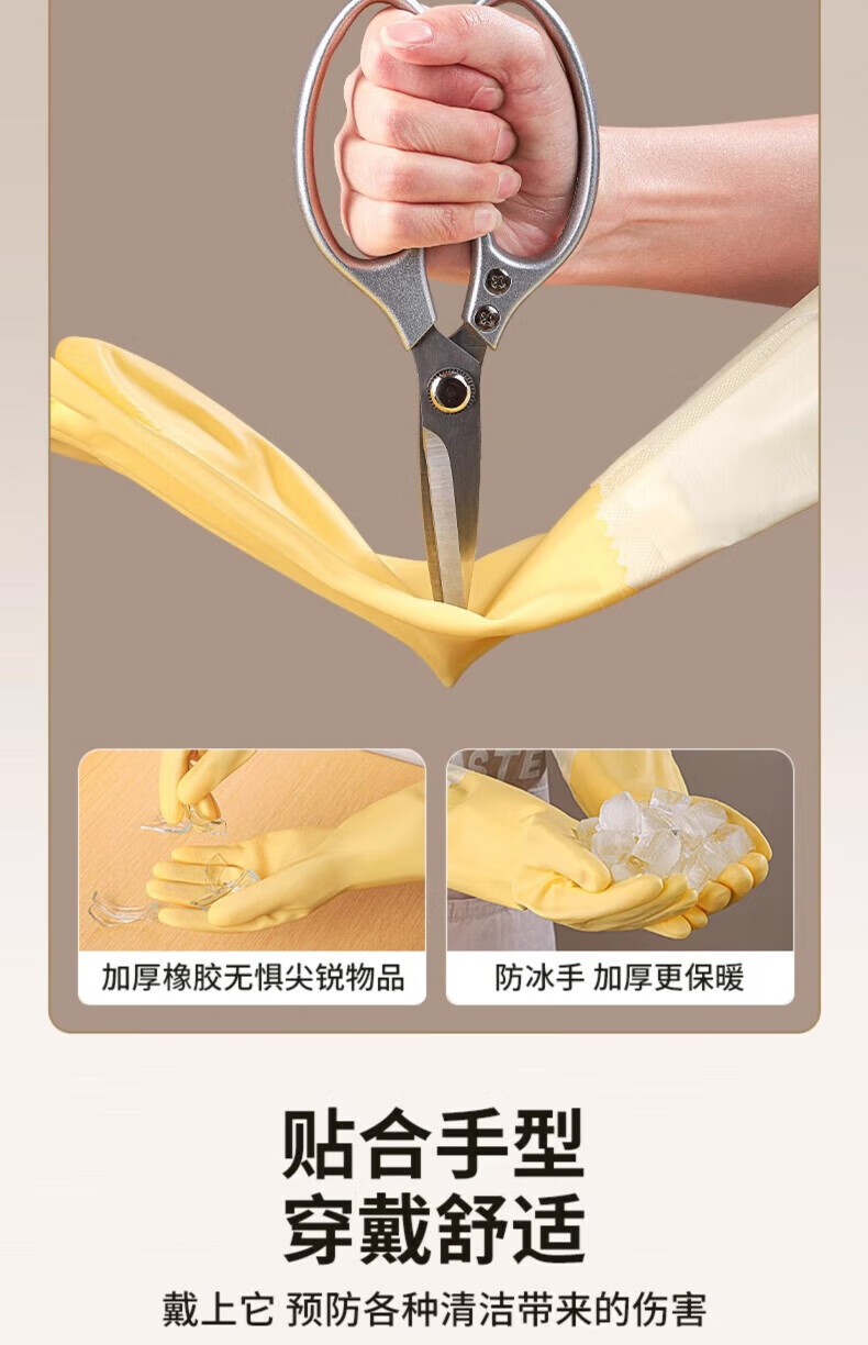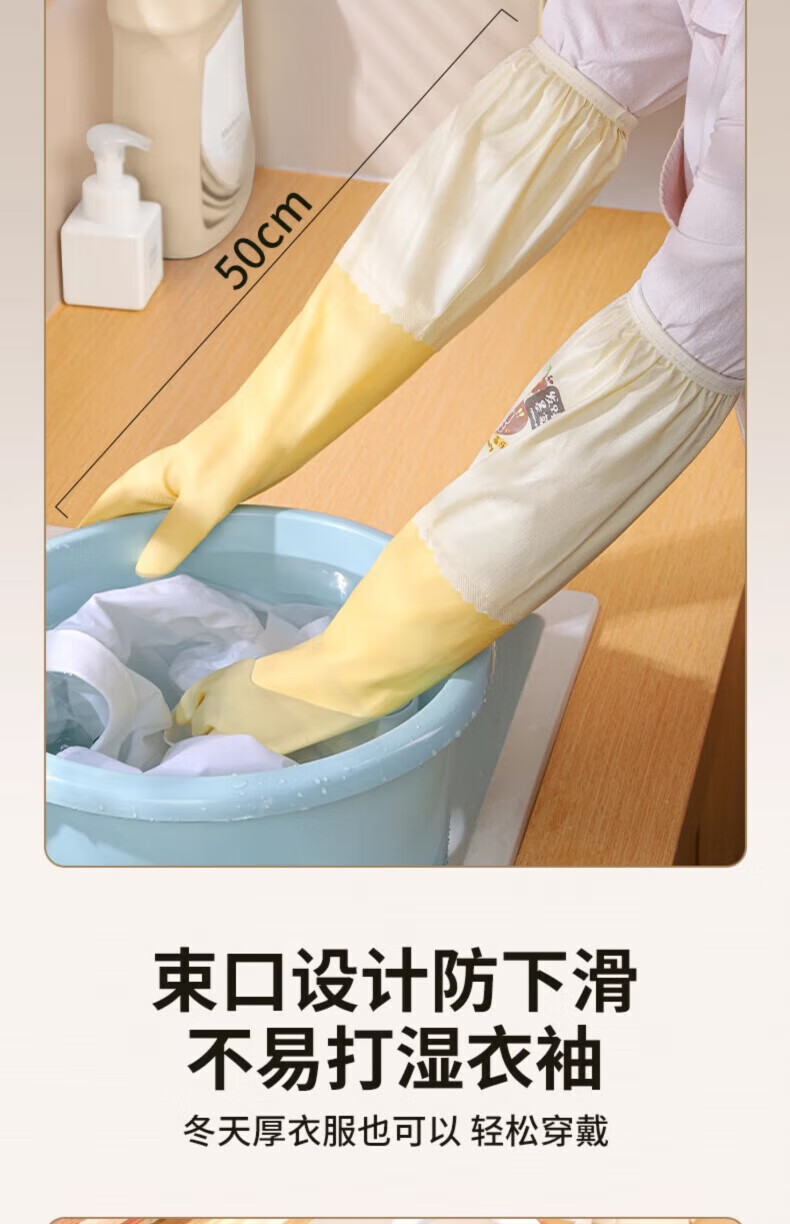 AILUKI日本高端洗碗手套食品级耐用加绒加长防滑神器手耐磨橡胶洗衣服 2双/加绒【奶油白50cm】 均码