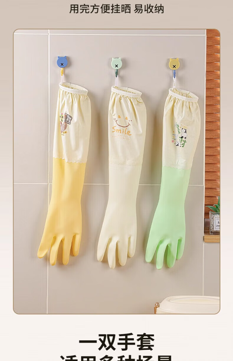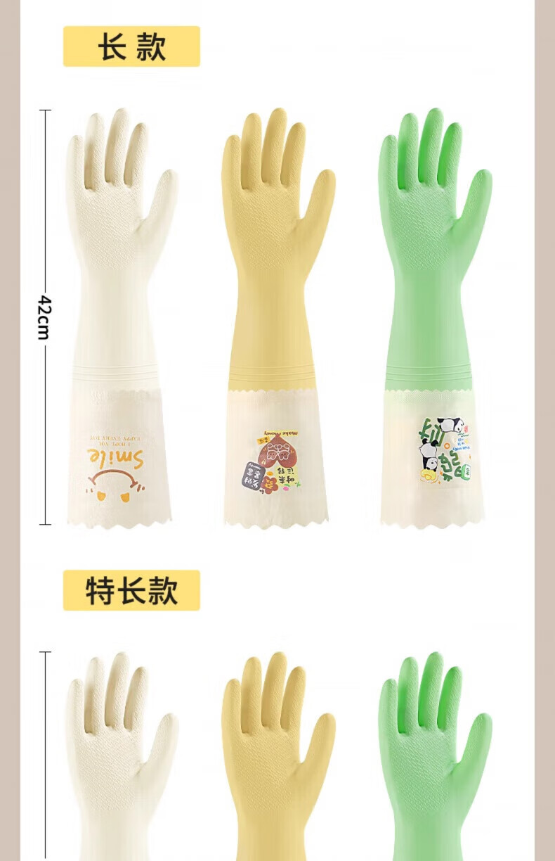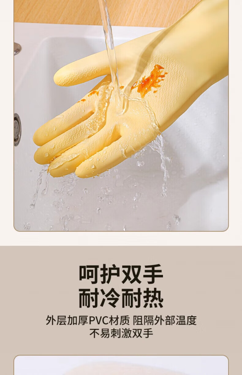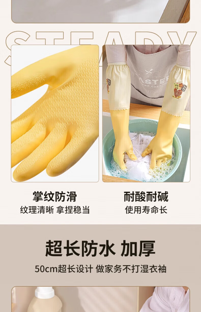 AILUKI日本高端洗碗手套食品级耐用加绒加长防滑神器手耐磨橡胶洗衣服 2双/加绒【奶油白50cm】 均码