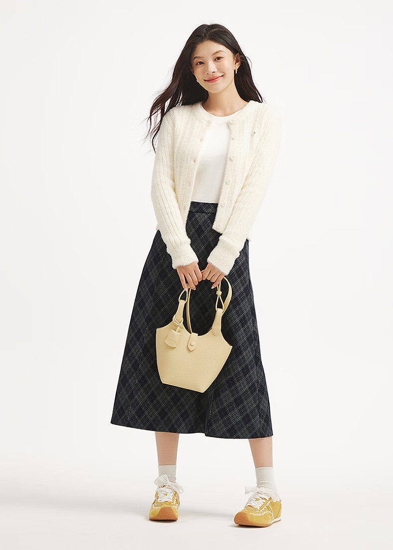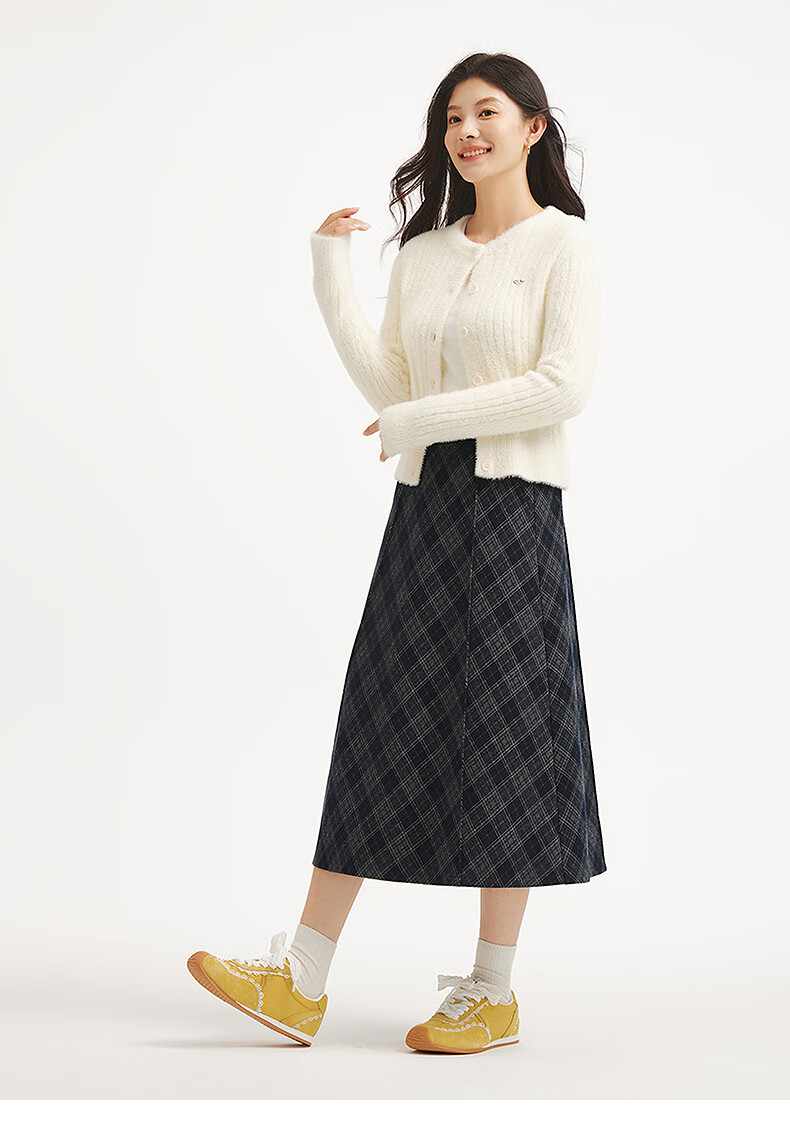 热风女士格纹半身裙2025年冬季新款松紧腰高腰文艺复古显瘦半裙 35兰格子 M