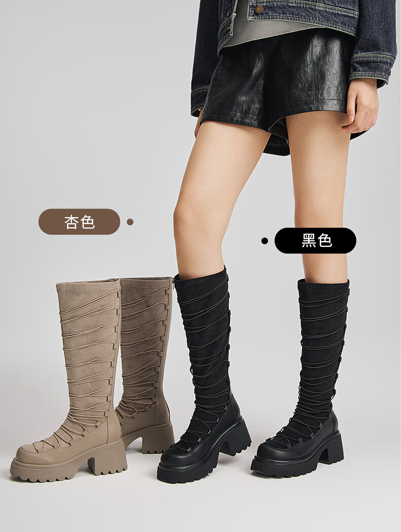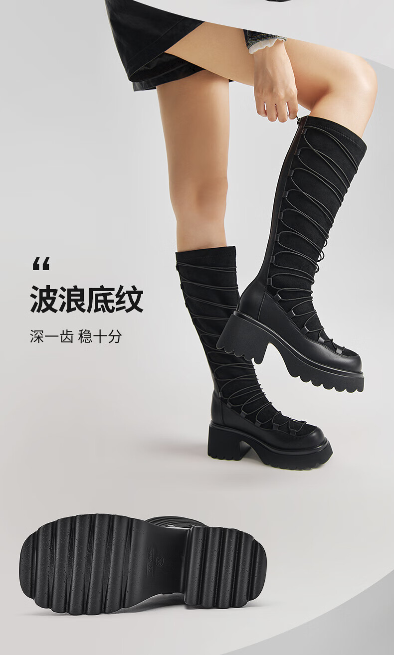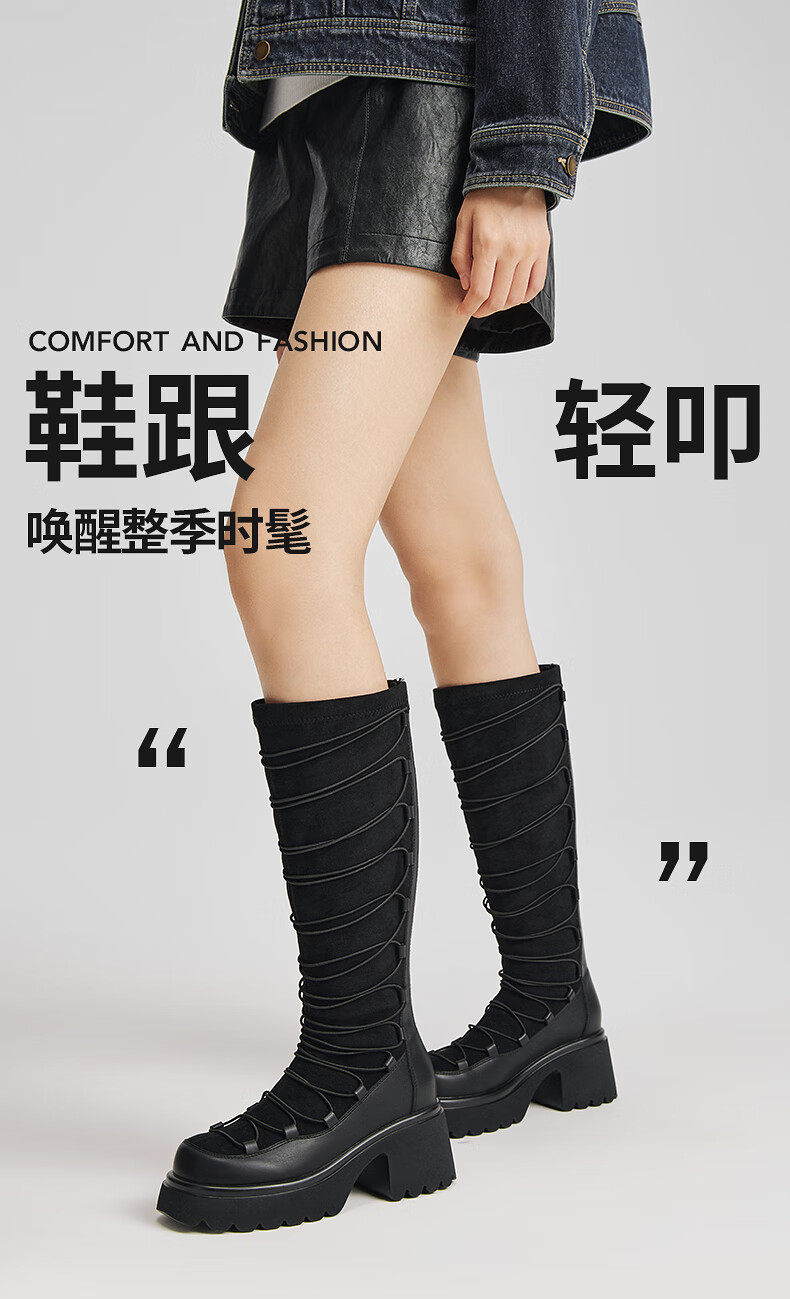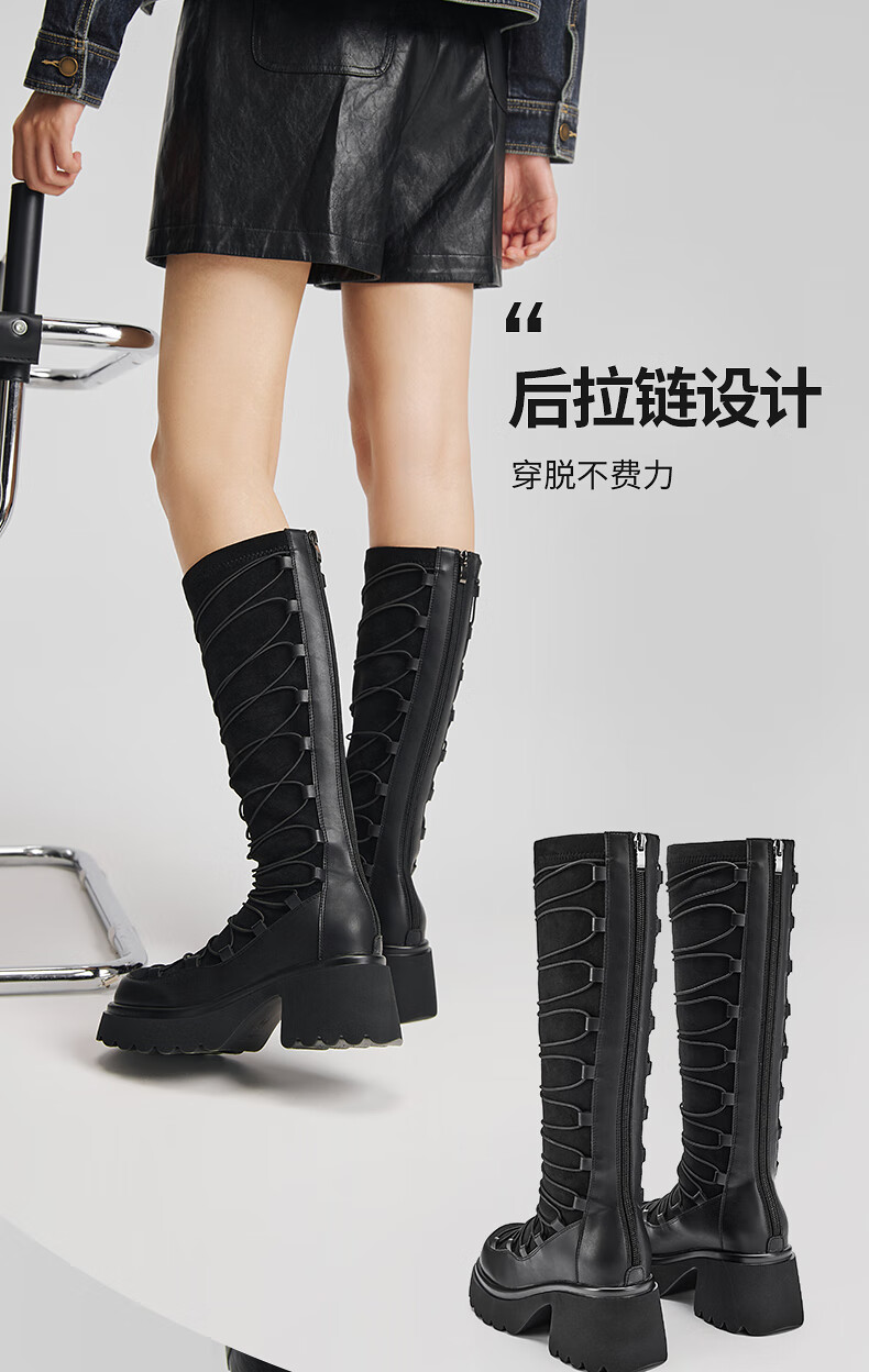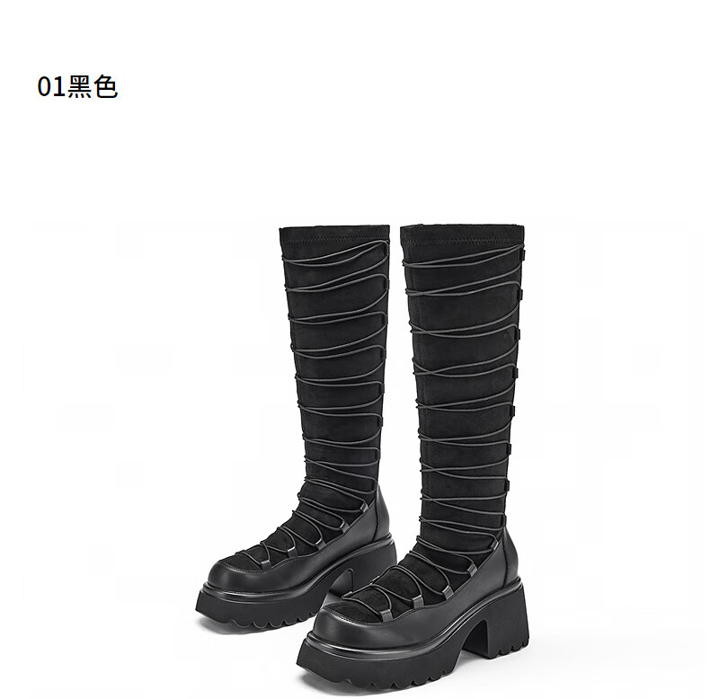 热风厚底骑士靴2025年冬季新款增高百搭长筒靴黑色粗跟时装靴子女 01黑色 34